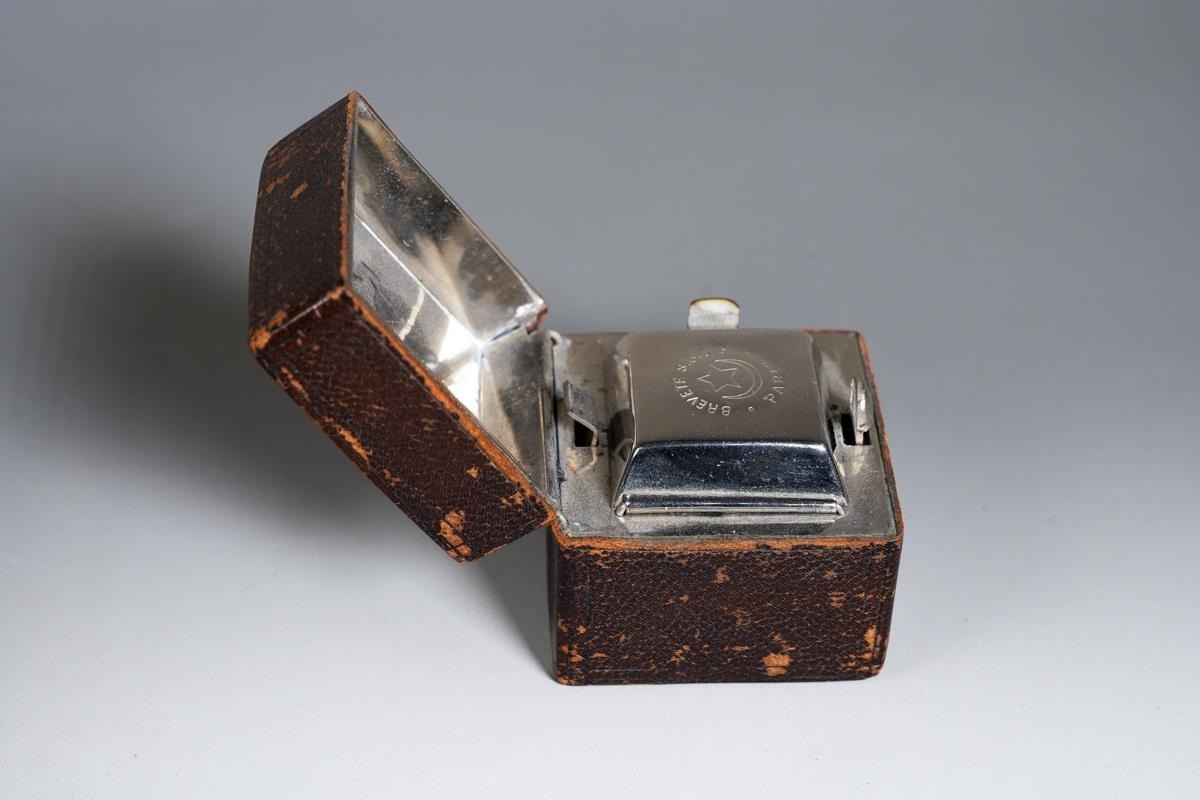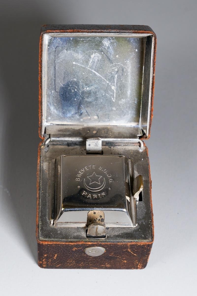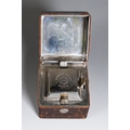 A French leather cased travelling silver plate inkwell, stamped Breveté SGDG Paris, the cover interior mirrored [1]