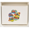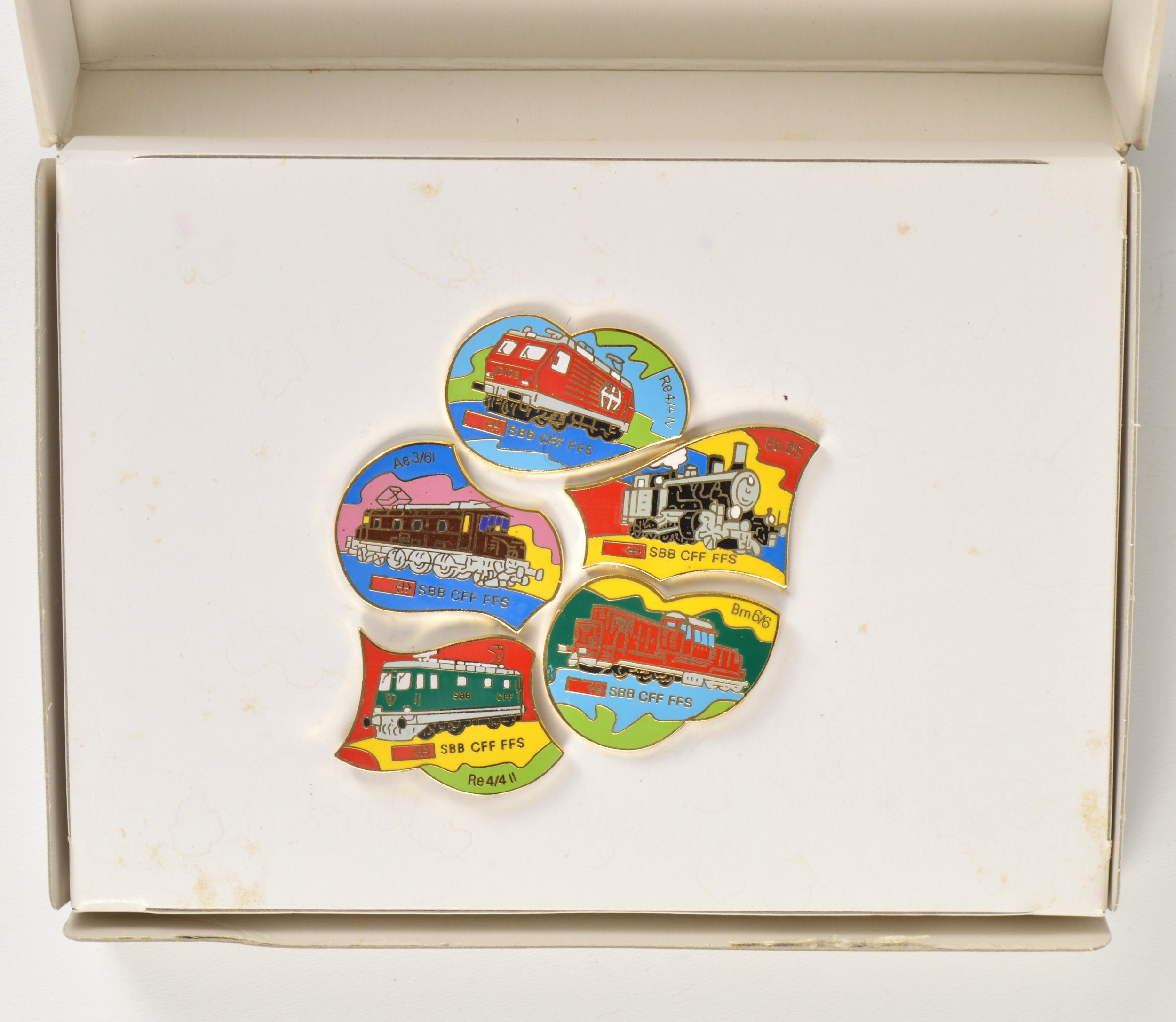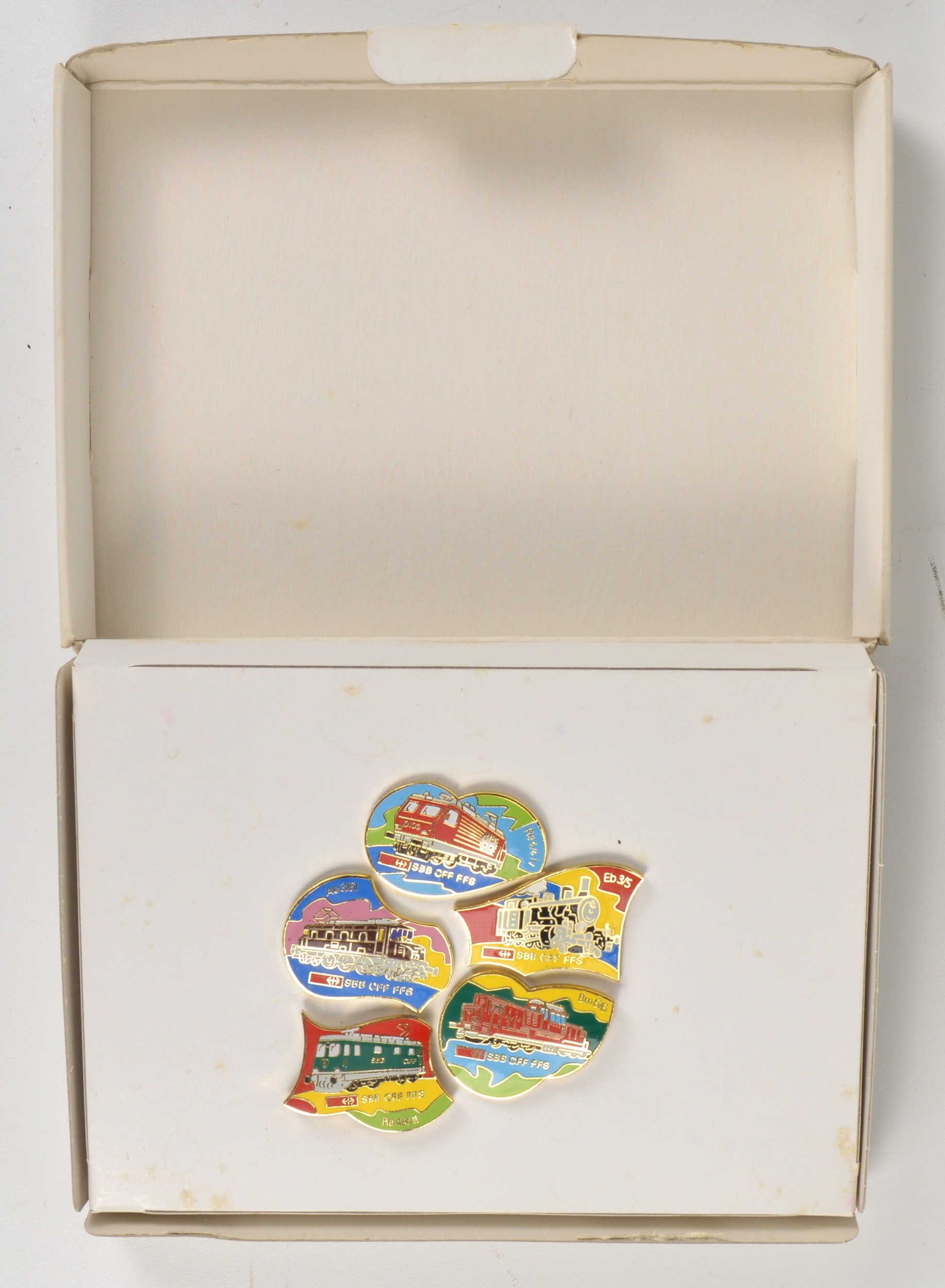 Badges, enamel, box set of Swiss Railway SSB, SERIE III, set 100.94. Appear to be as new, with age related marks to box. Box size 6 1/4 x 4 1/2 inches. Shipping band - A.