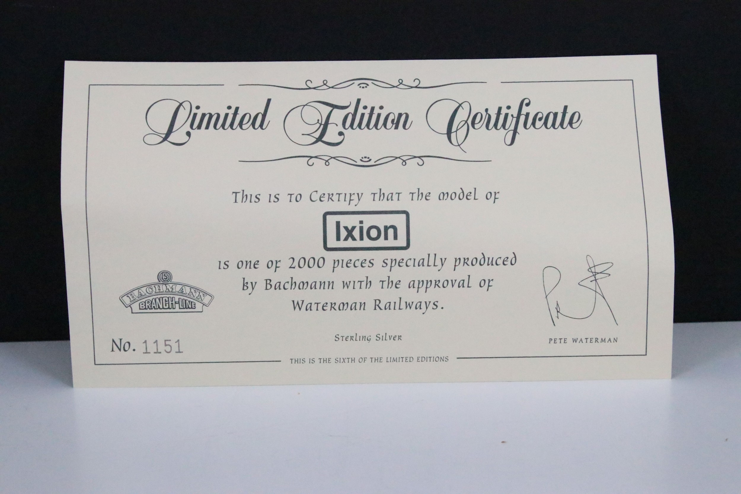 Cased ltd edn Bachmann Ixion locomotive with the approval of Waterman Railways, with certificate