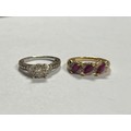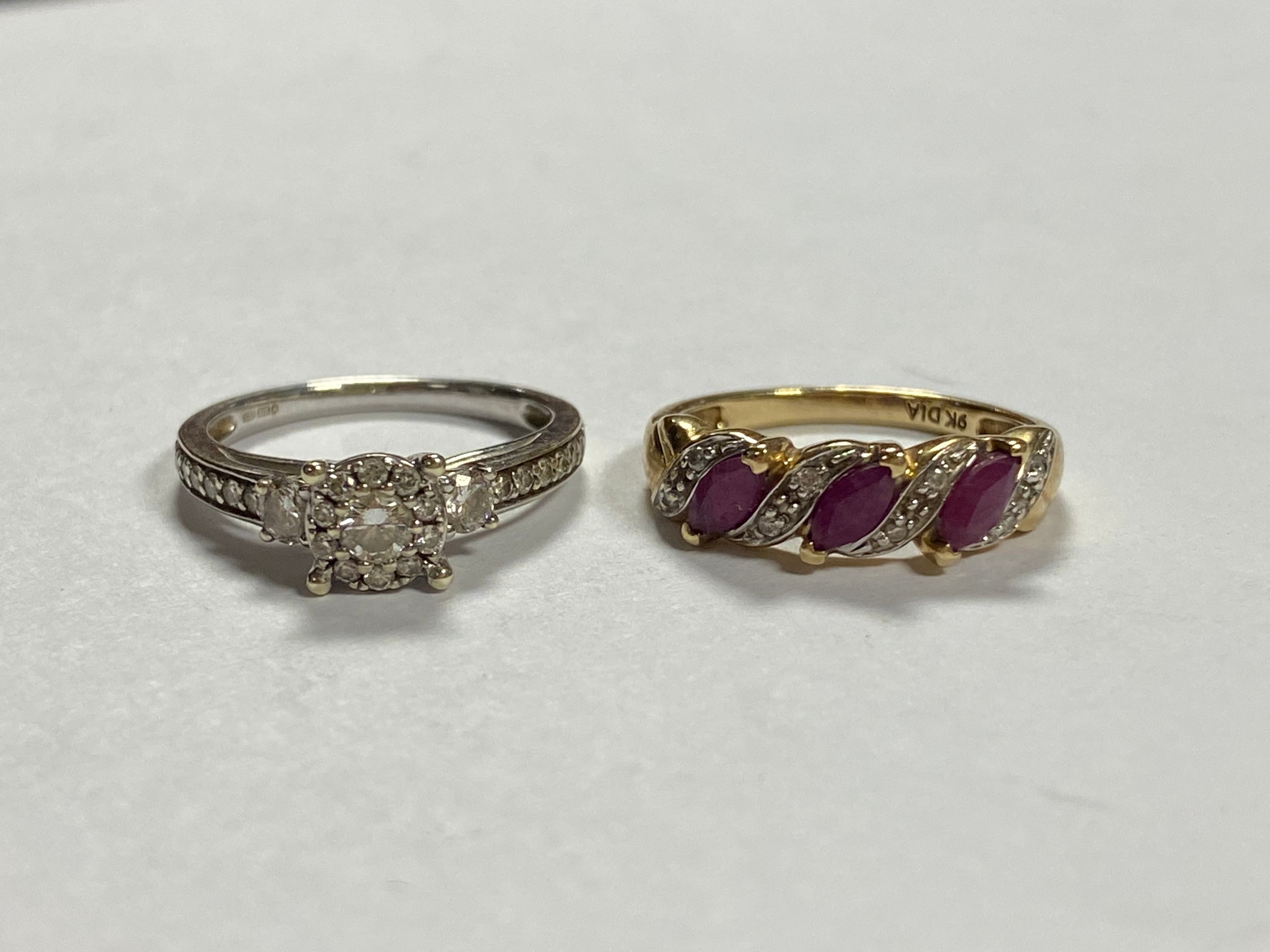 A 9ct white gold and diamond cluster ring, designed as a target shaped cluster between diamond set shoulders and a ruby and diamond 9ct gold band ring (2) -