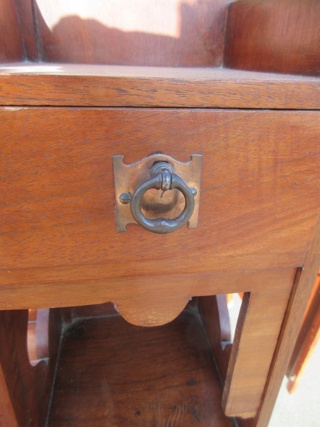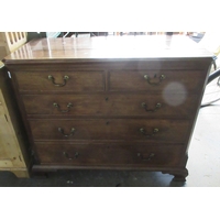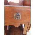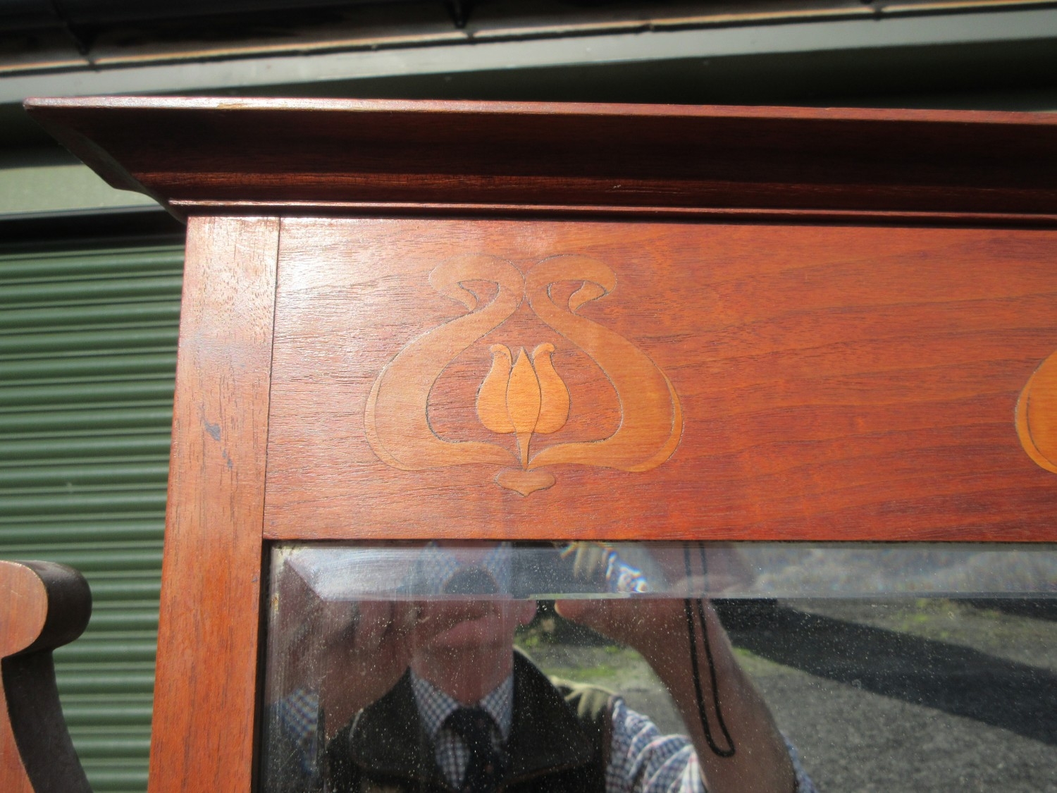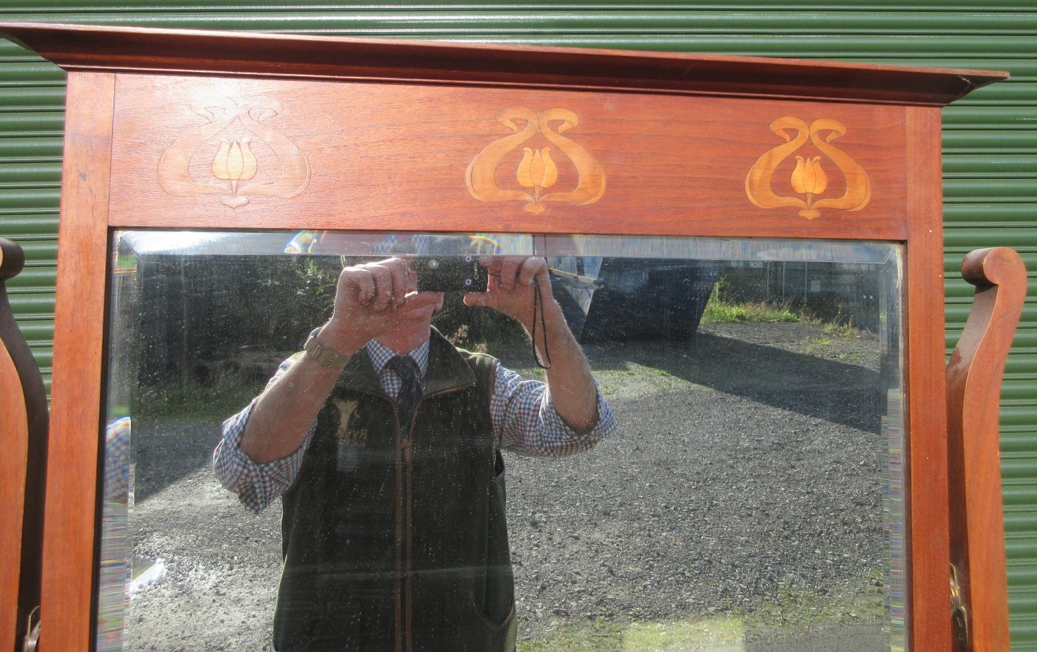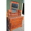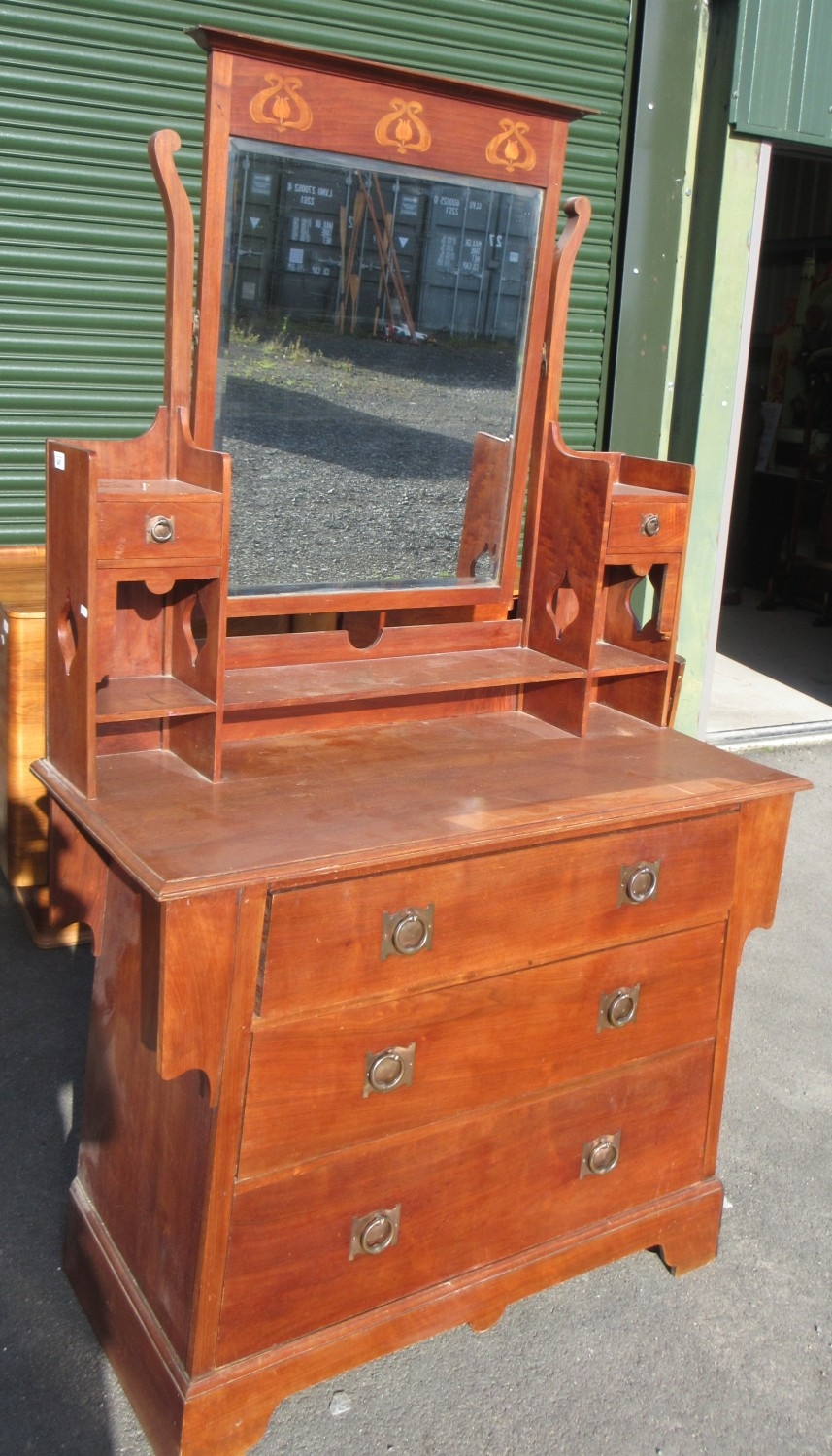 Edwardian stained oak dressing chest, mirror with stylized flower frieze above two small and three long drawers with metal ring handles, on skirted base, w107cm, D50cm, H183cm