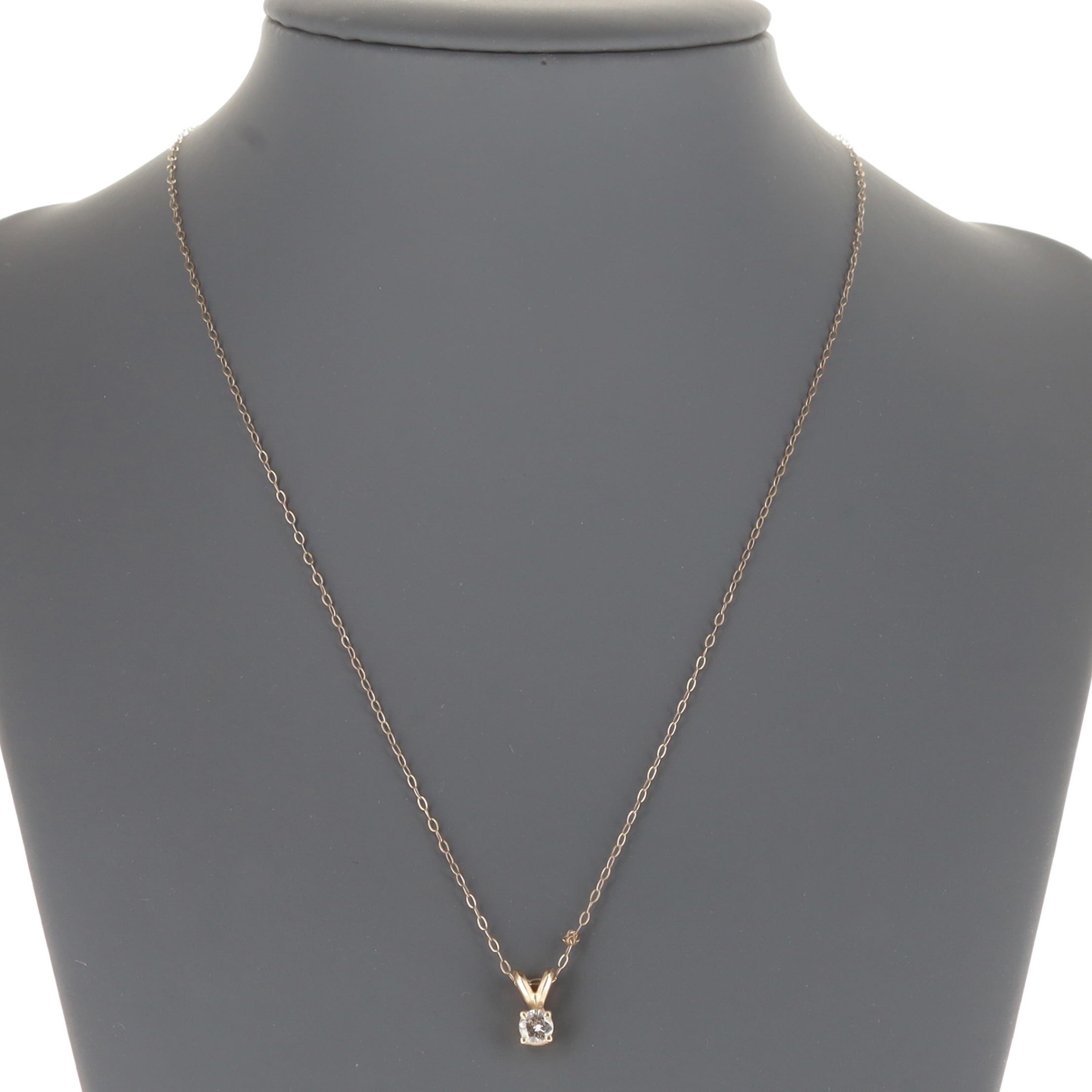 Diamond Solitaire Gold Pendant and Chain. The pendant has been tested as a mixture of 9ct gold and 14ct gold, the chain is stamped 375 on its clasp. The estimated diamond weight is 0.33ct. The pendant measures approximately 1cm in length, and the chain 42cm. This piece weighs in total 1.0g.
