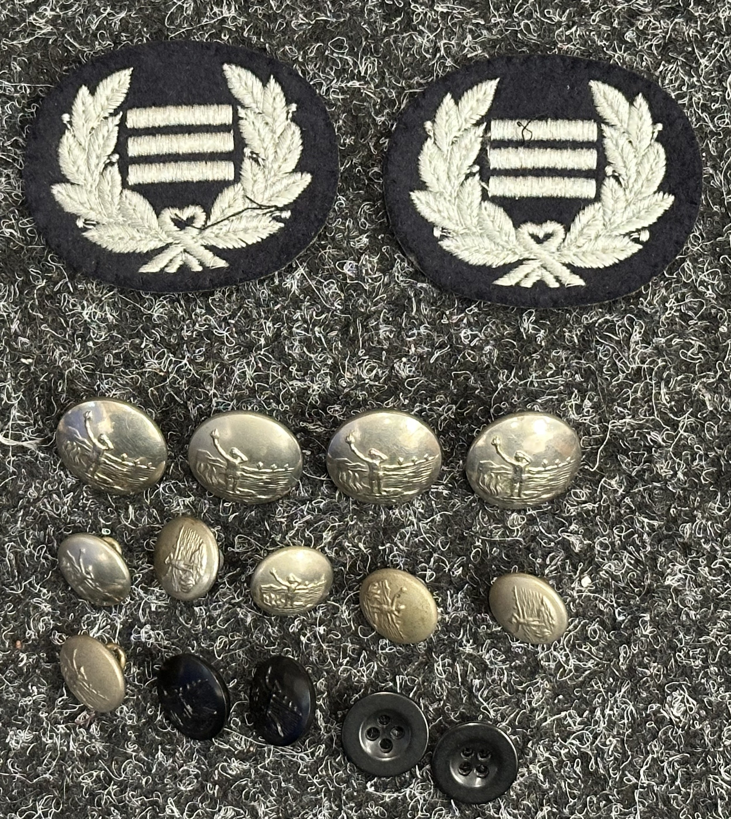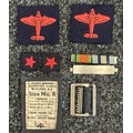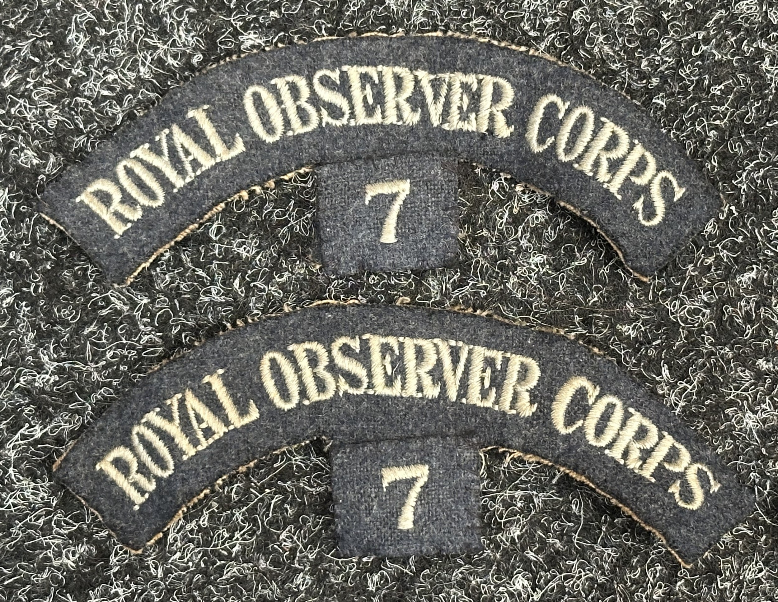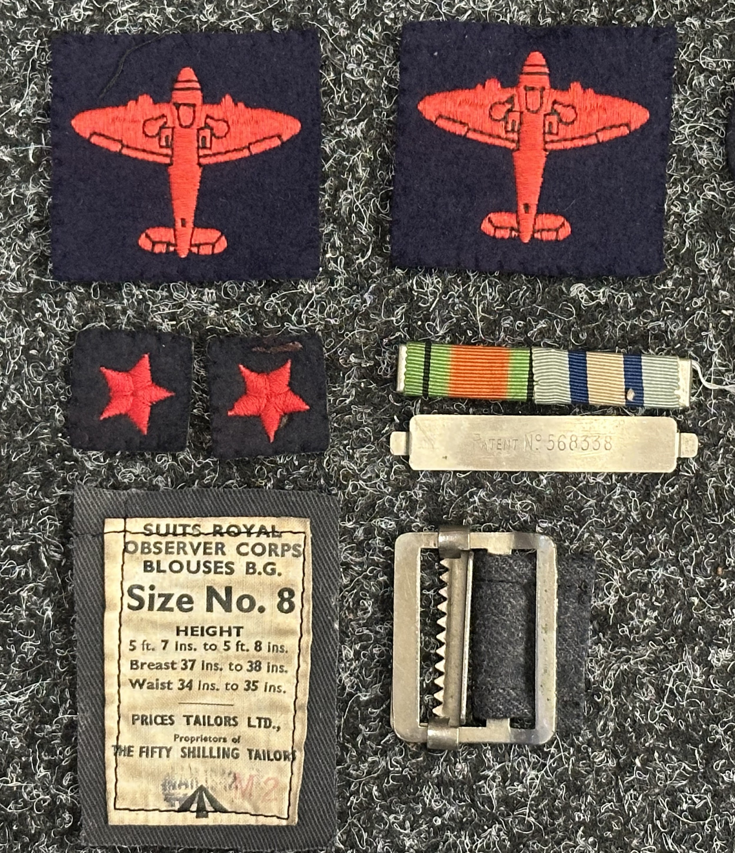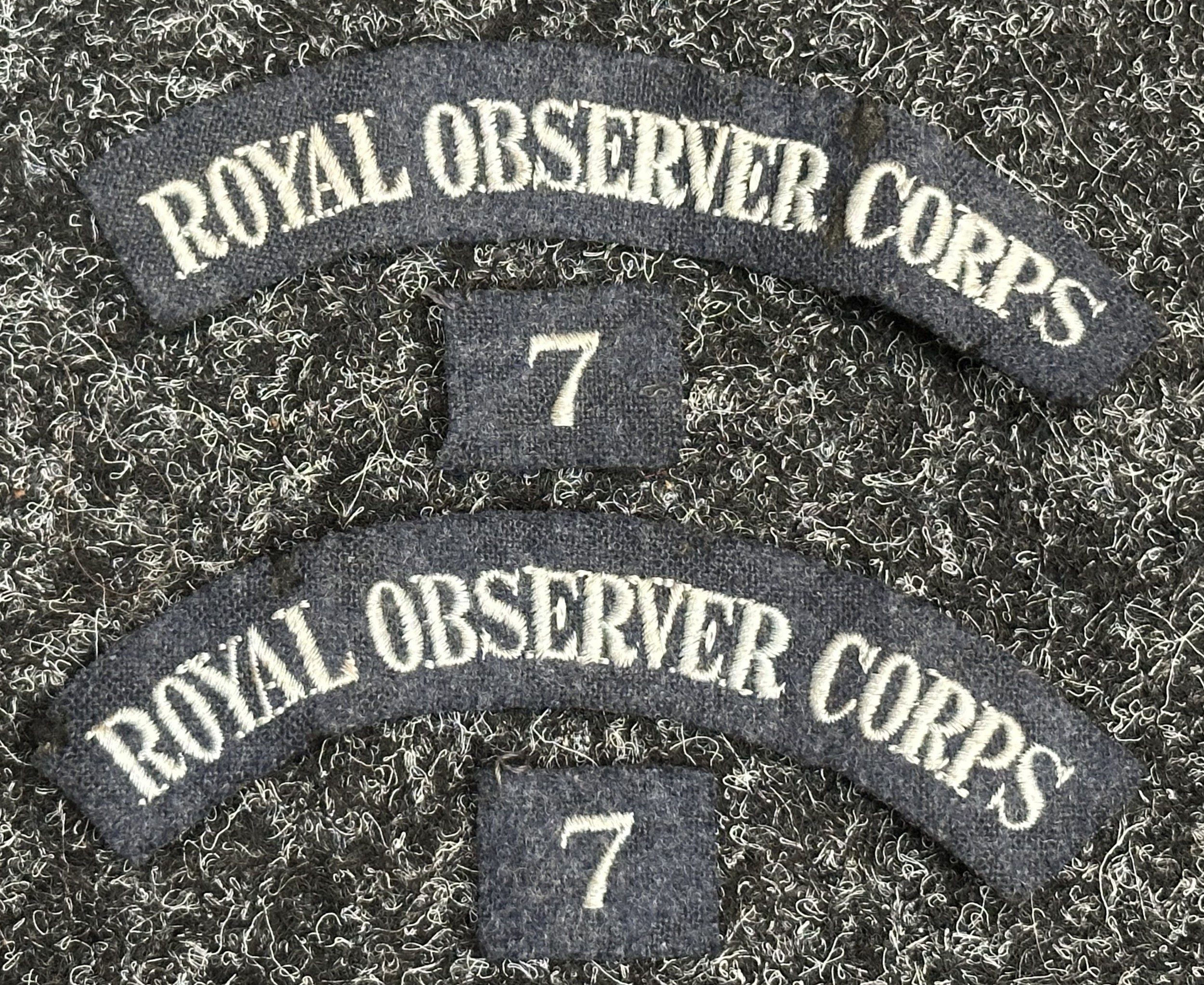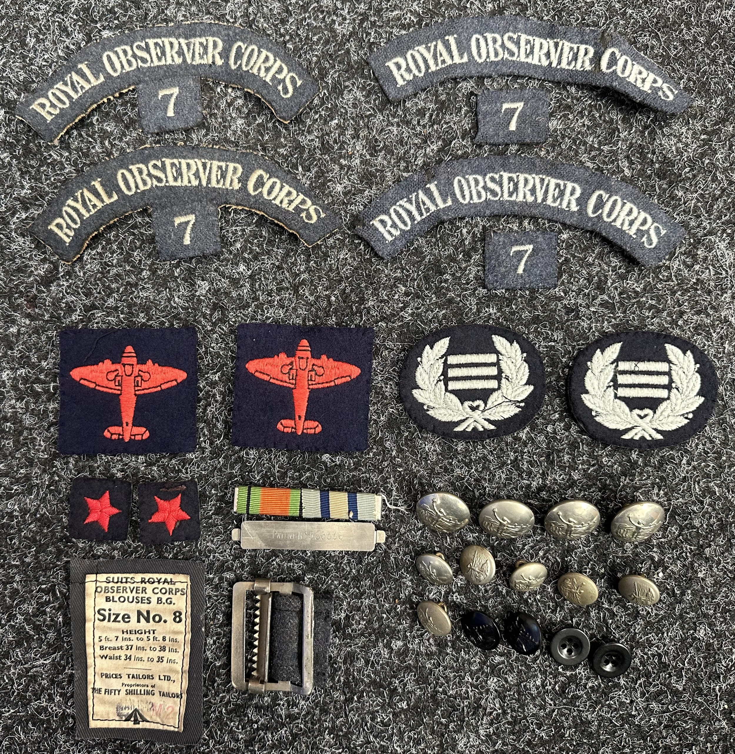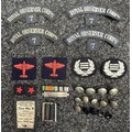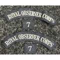 WW2 British Royal Observer Corps shoulder titles, qualification badges and buttons, all uniform removed. Along with some post war insignia.