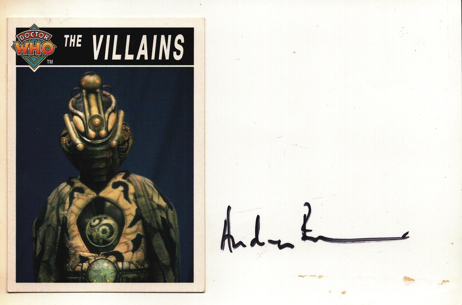 Andrew Ryan signed white card 6x4 inch includes The Villains 'Doctor Who' card affixed onto white card.