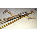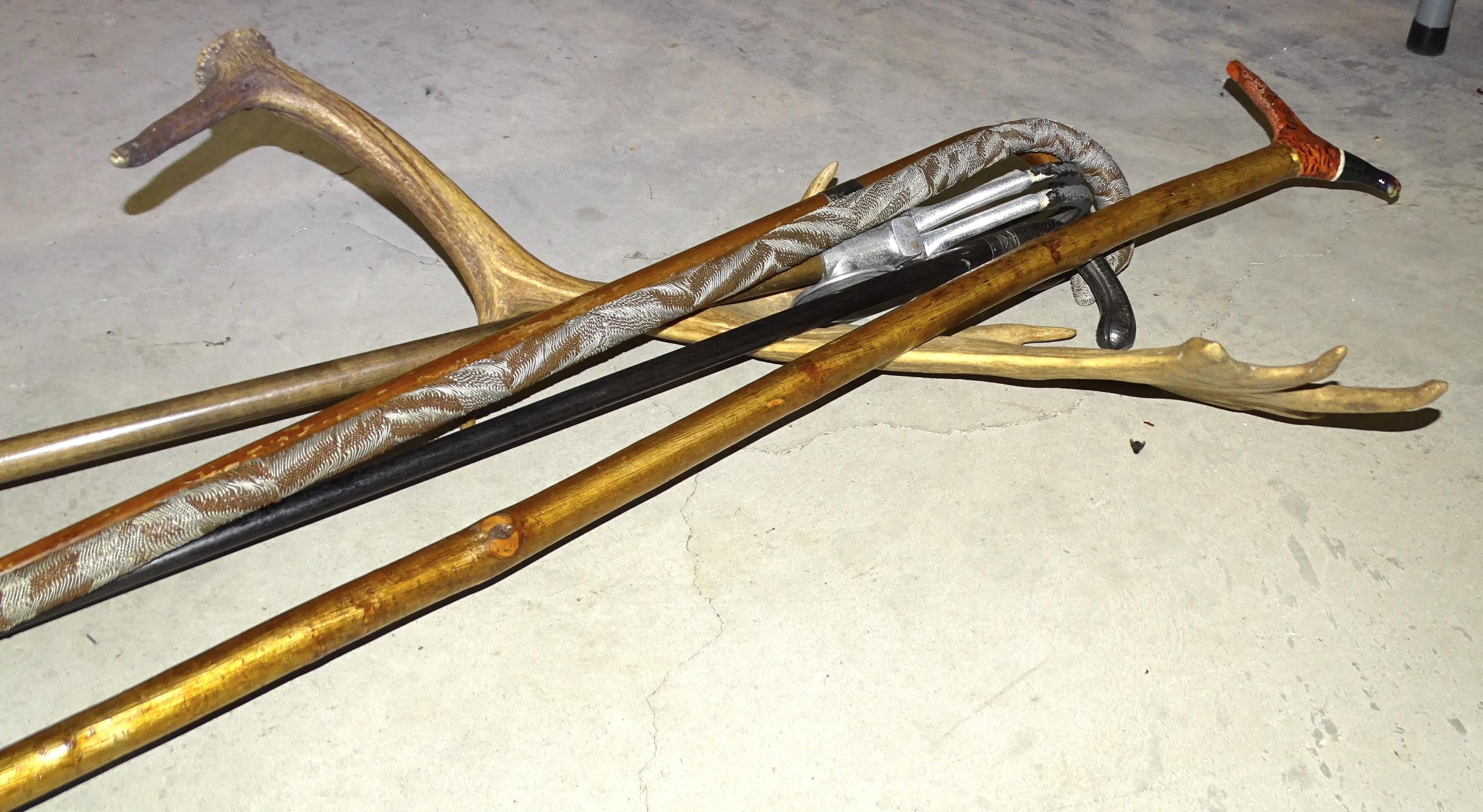 Two silver-mounted walking sticks, one antler, a wire-bound walking stick and others.