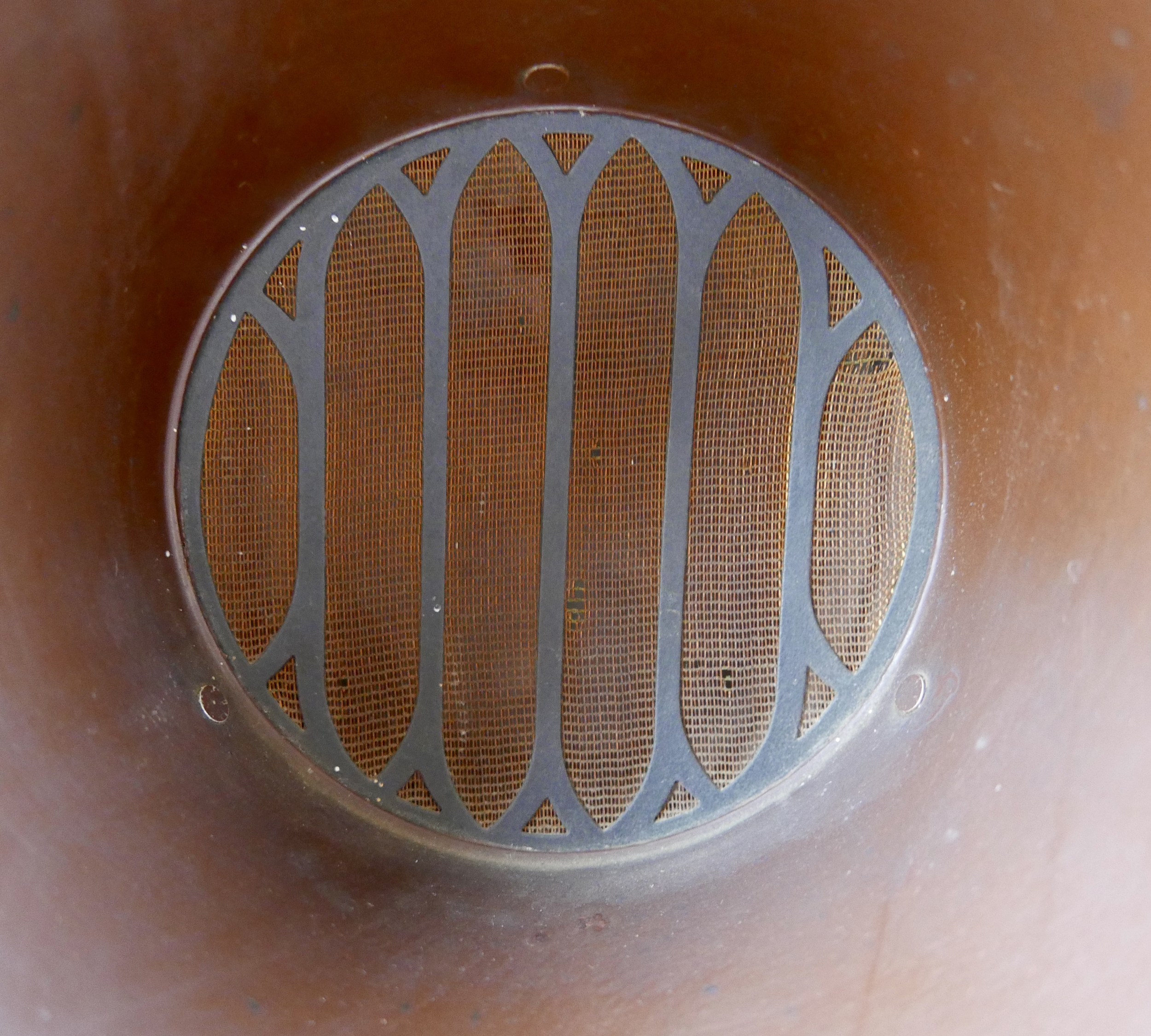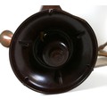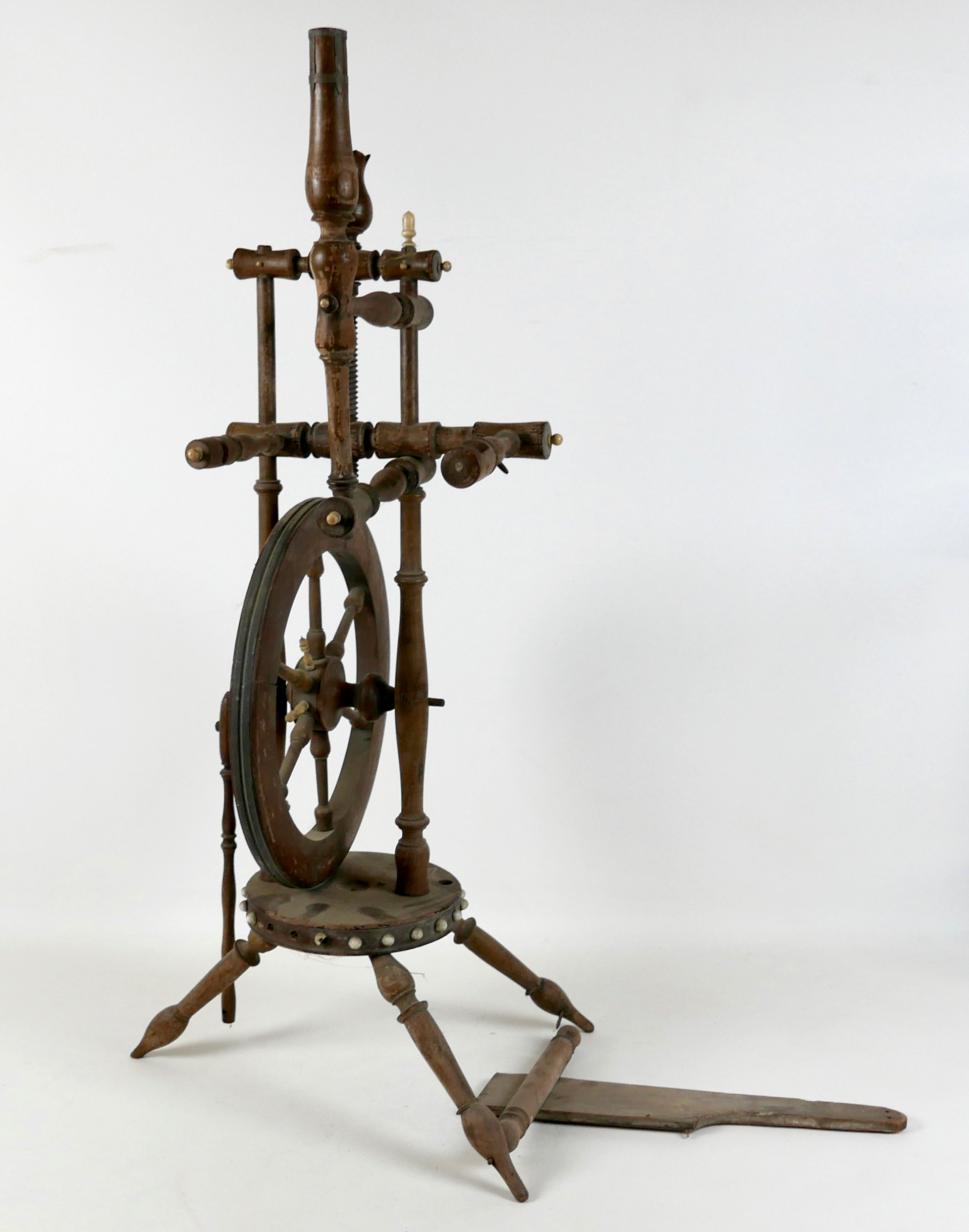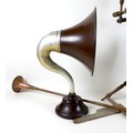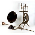 A British Thomson-Houston 'B.T.H. Type C2 Form C horn type loudspeaker, aluminium and Bakelite, 62cm high, together with a copper horn, and a 19th century spinning wheel, labelled for 'Farr's Dep's Ltd'. (3)