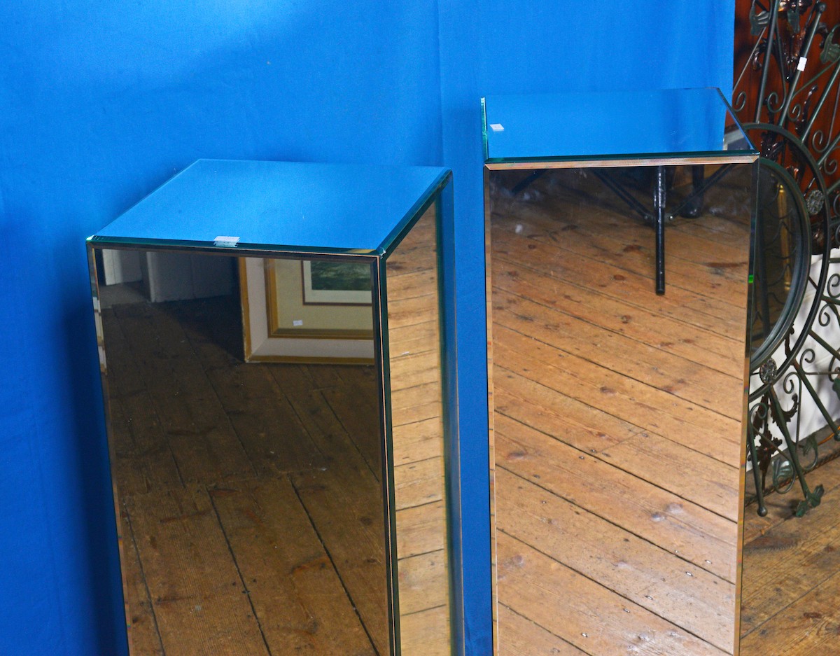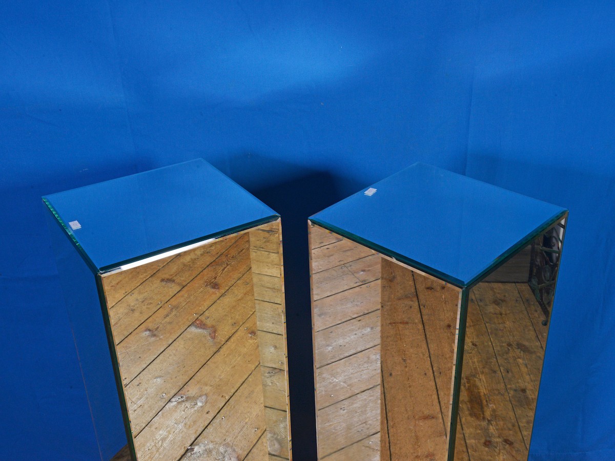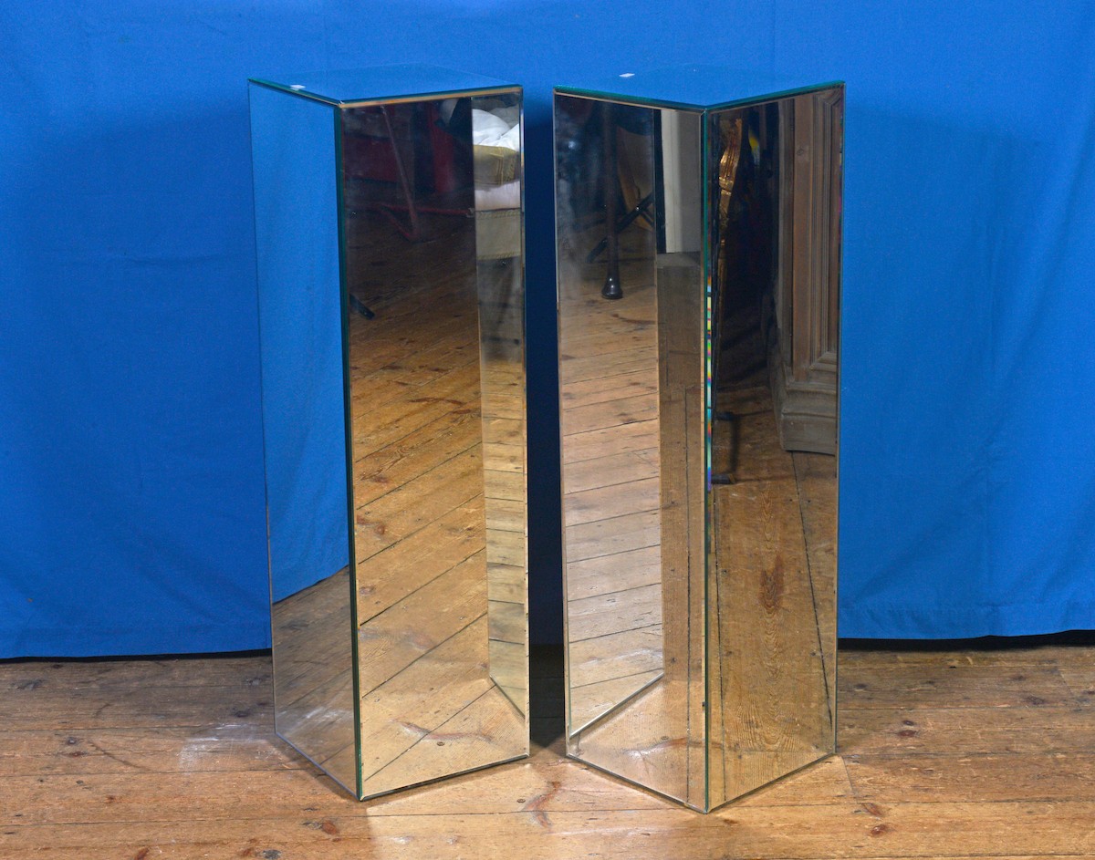 A Pair of Glass Mirrored Modernistic design Statue Columns. Measuring: 28cms Square x 101cms high.