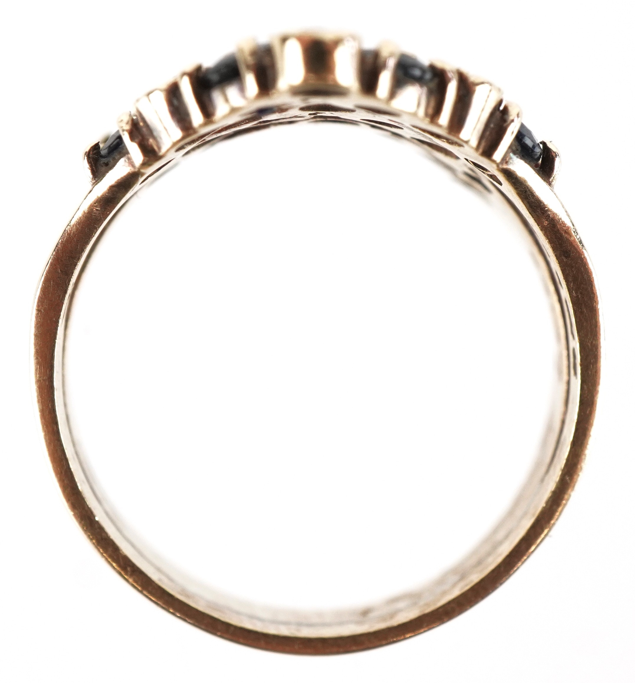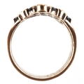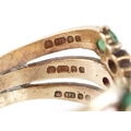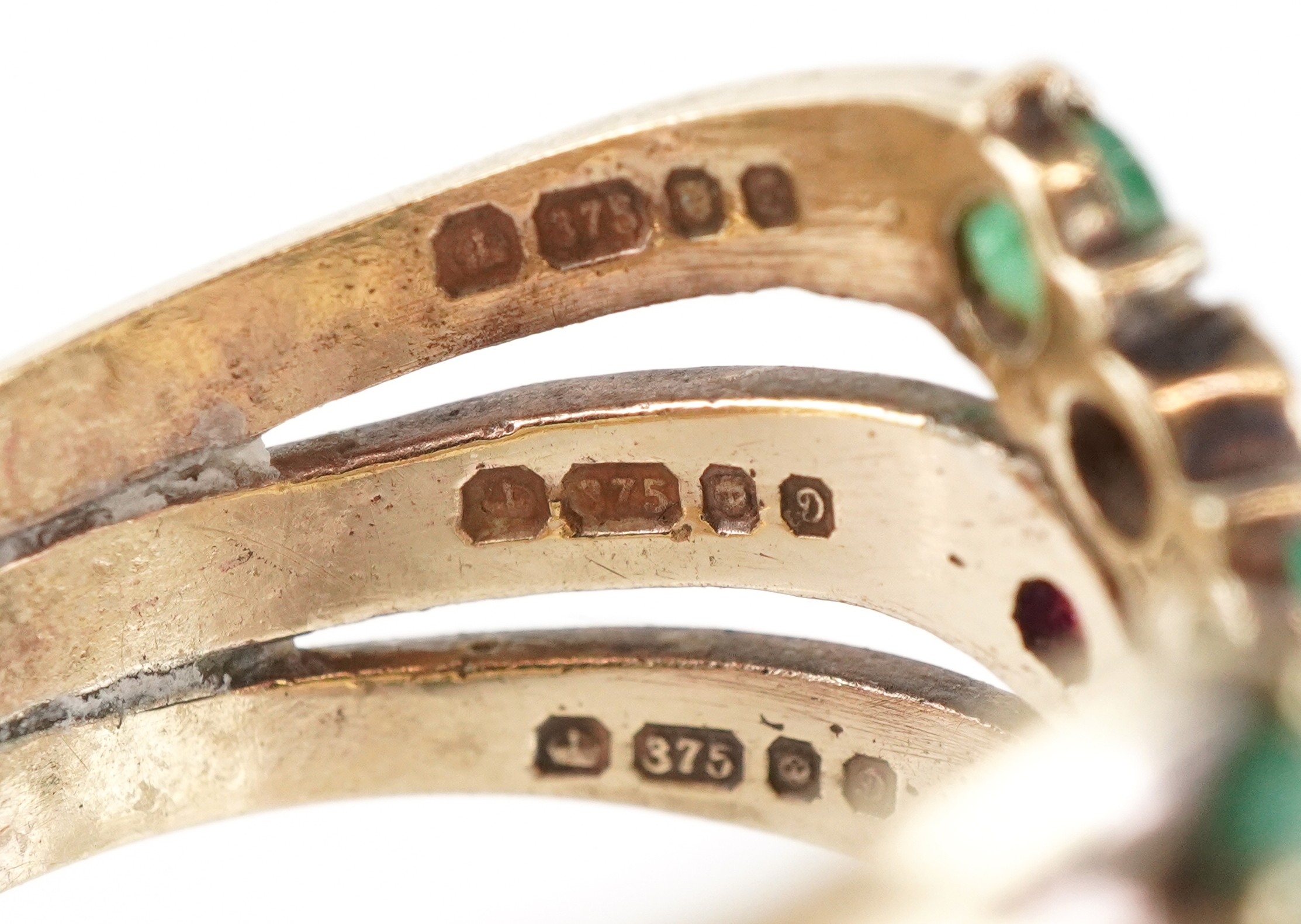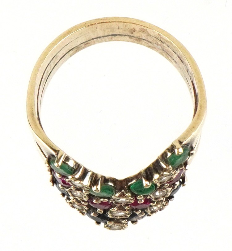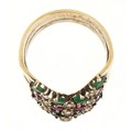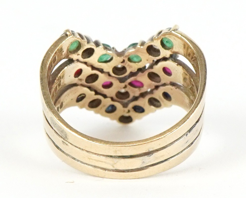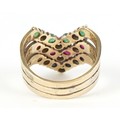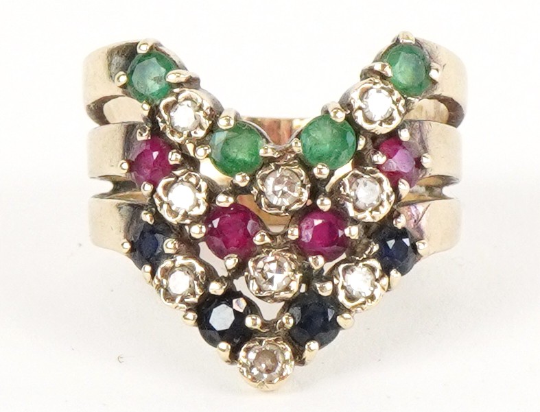 A 9ct gold multi gem triple wishbone ring set with diamonds, rubies, emeralds and spinel, size Q, 6.5g.