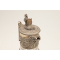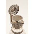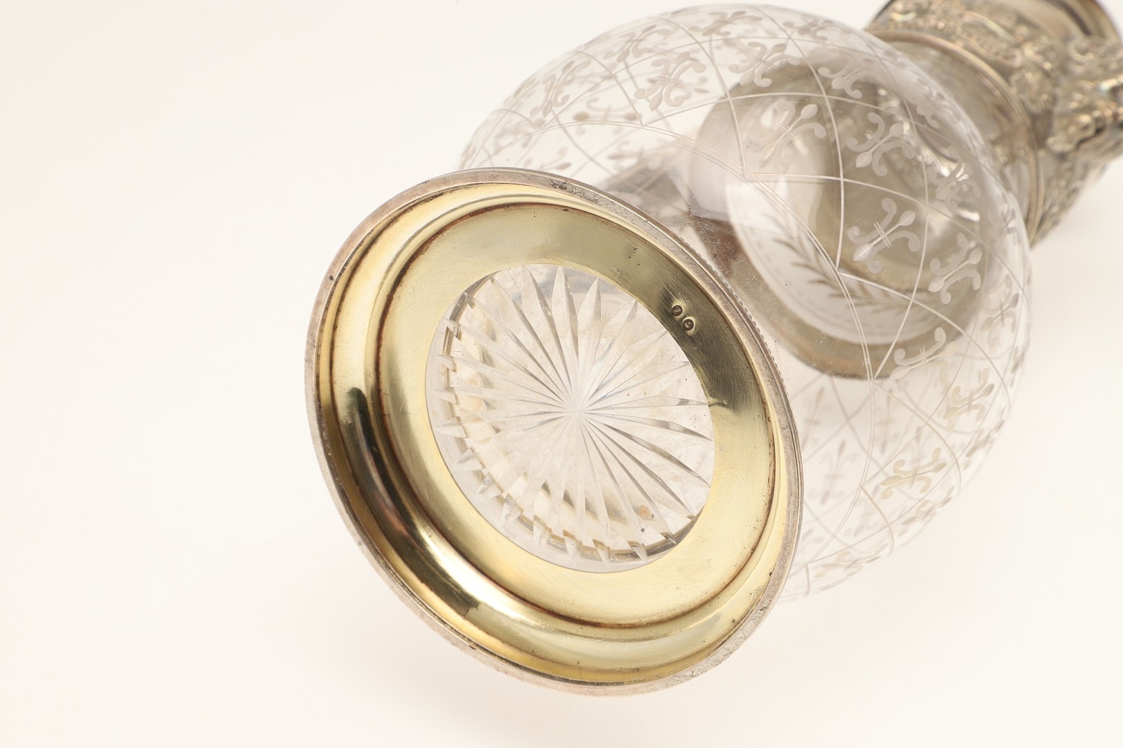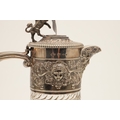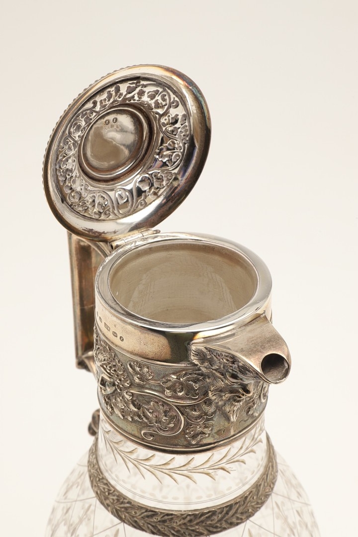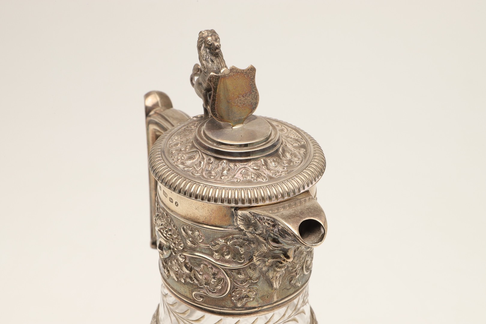 A VICTORIAN SILVER MOUNTED GLASS CLARET JUG. Of bulbous form, the top with foliate vine and mask decoration, the lid with gadrooned border and topped with a lion and shield thumb piece. Scrolling features to the handle, engraved decoration to the glass and round silver foot. Hallmarked Horace Woodward & Co, Birmingham, 1874. Height 30.5cm.