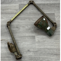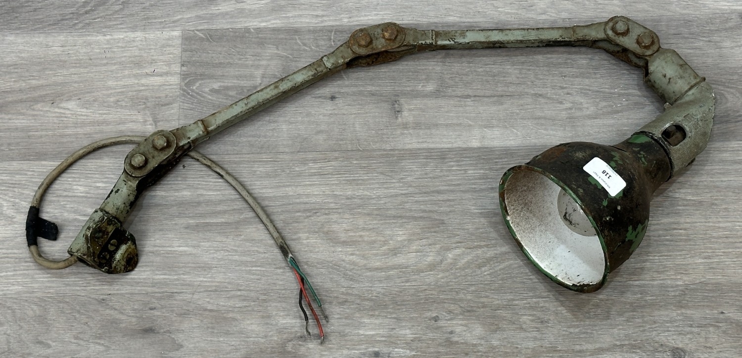 A mid 20th century Mek-Elek green and grey painted metal articulated industrial machinist's desk lamp