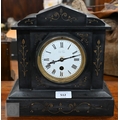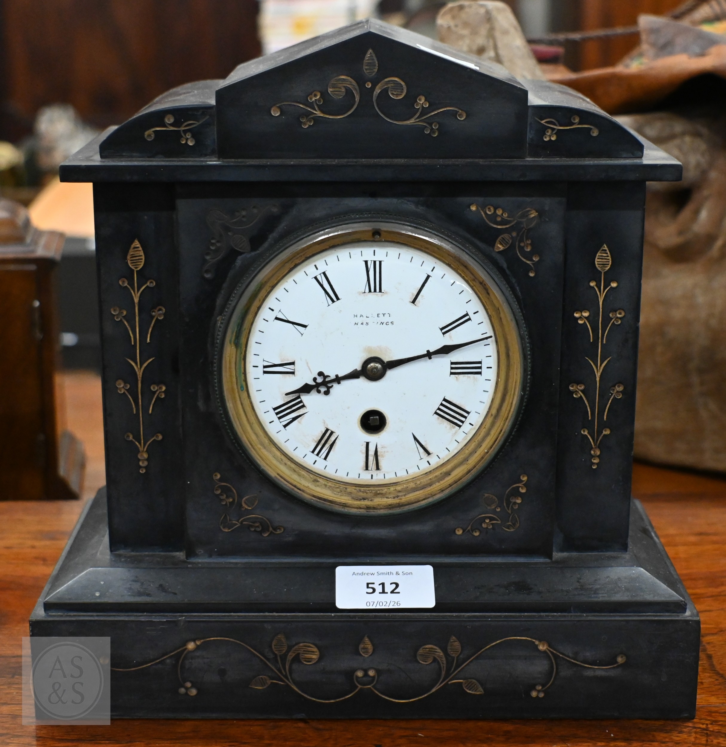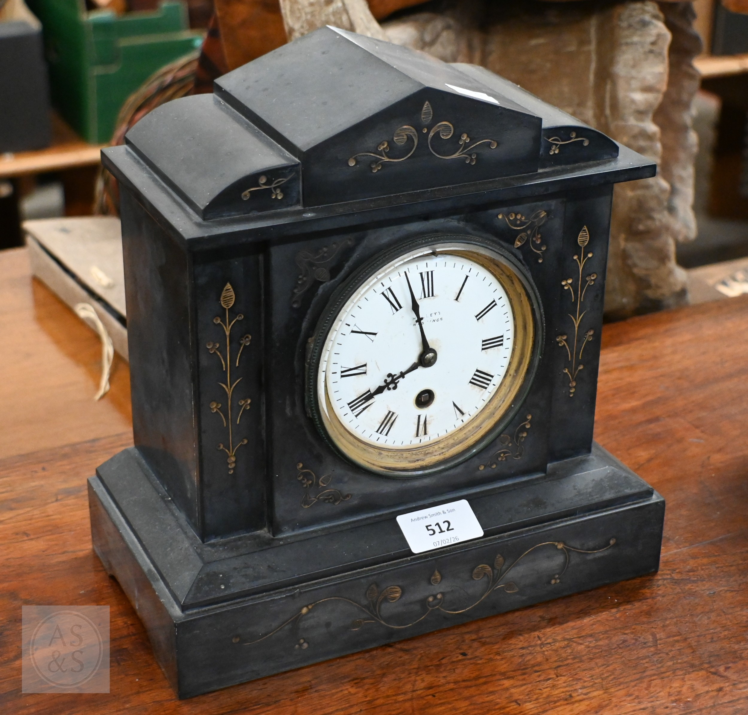 Early 20th century Hallett (Hastings) slate mantel clock, with French drum 8-day movement, 26 cm high