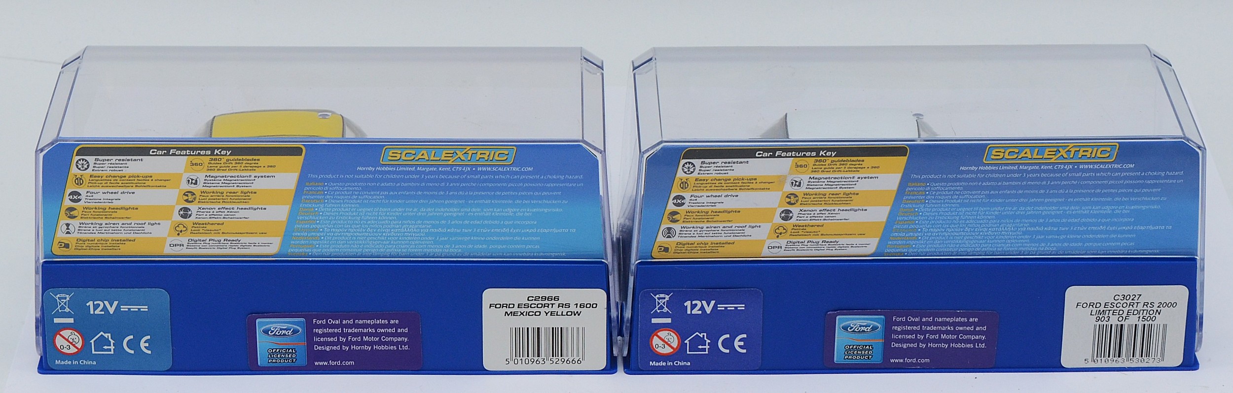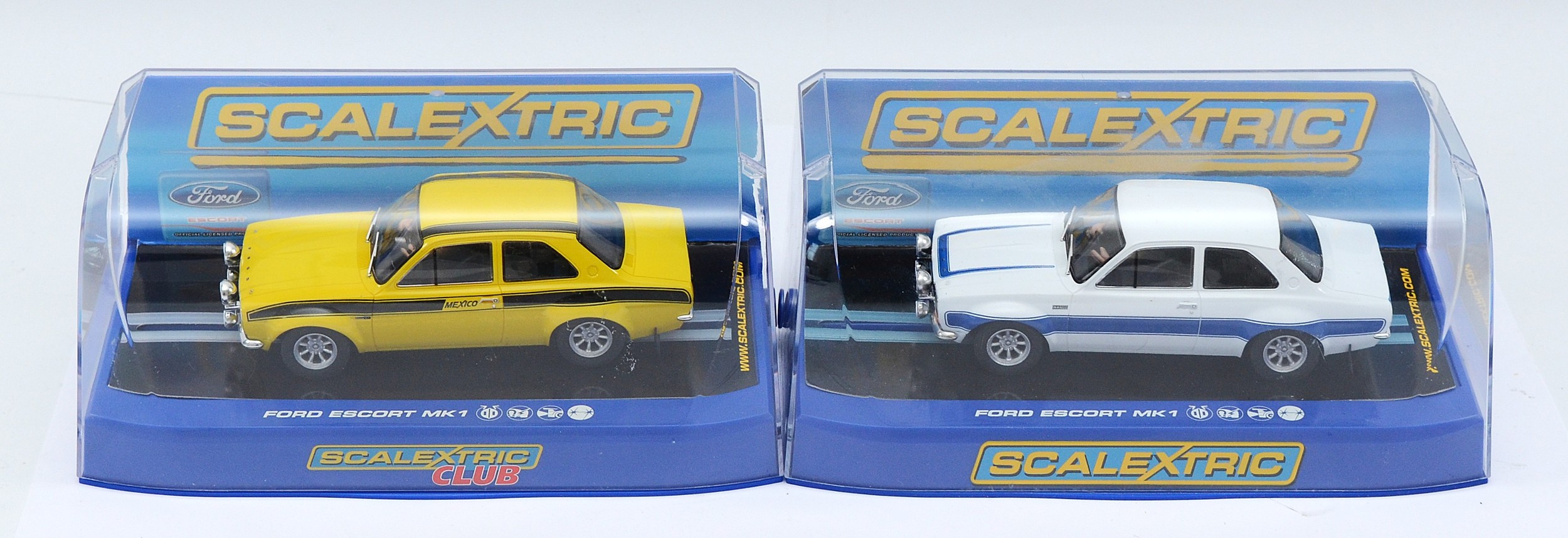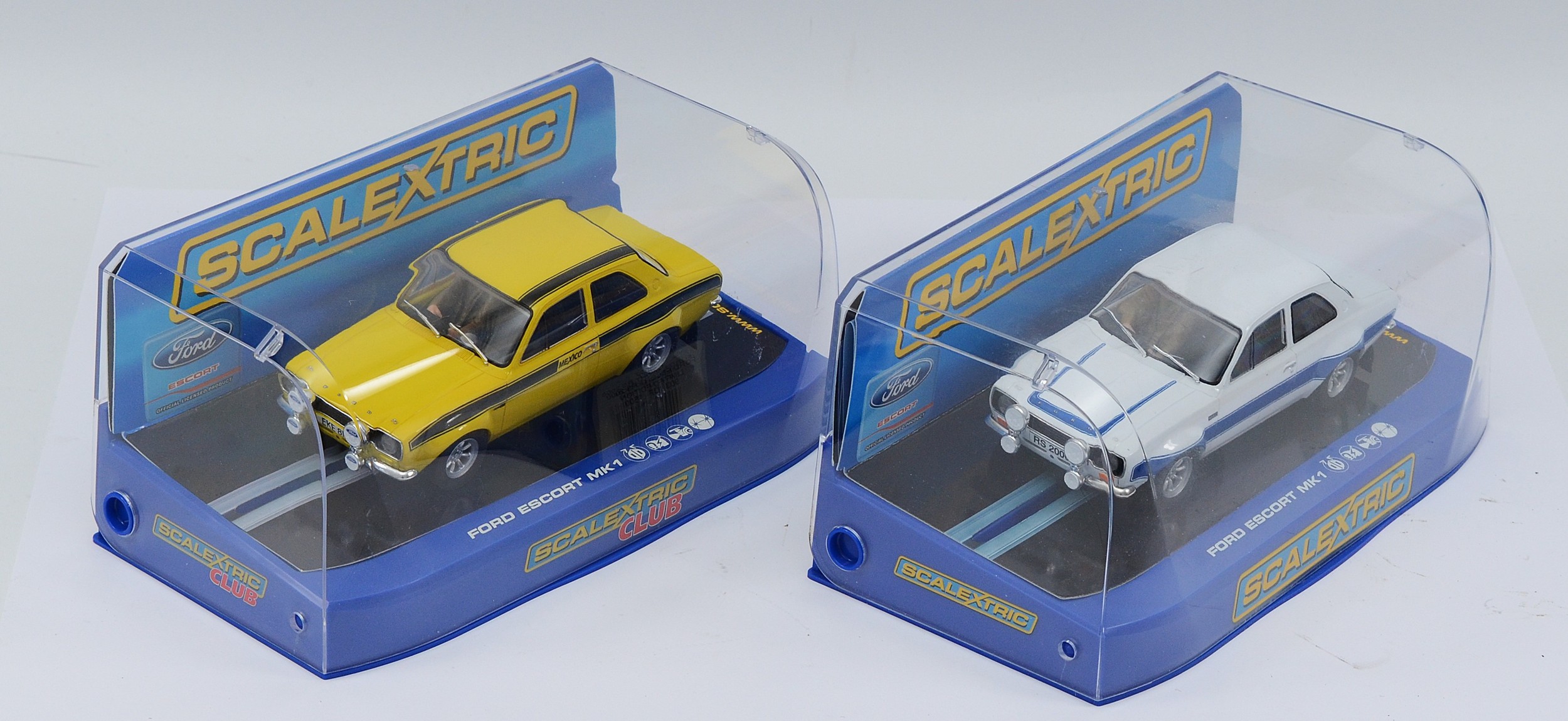 Scalextric Slot Car issues comprising, No C3027 Ford Escort RS2000 (Limited Edition 903 of 1500), together with, No C2966 Ford Escort RS 1600 Mexico yellow, mint, unused condition (2).