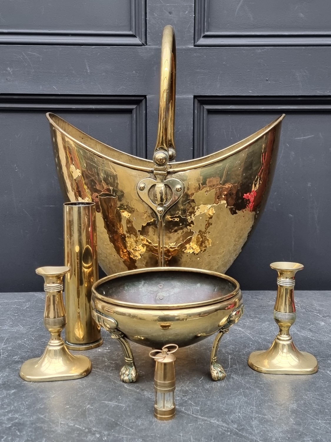 An Art Nouveau brass swing handled coal scuttle; together with other brassware.