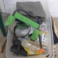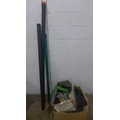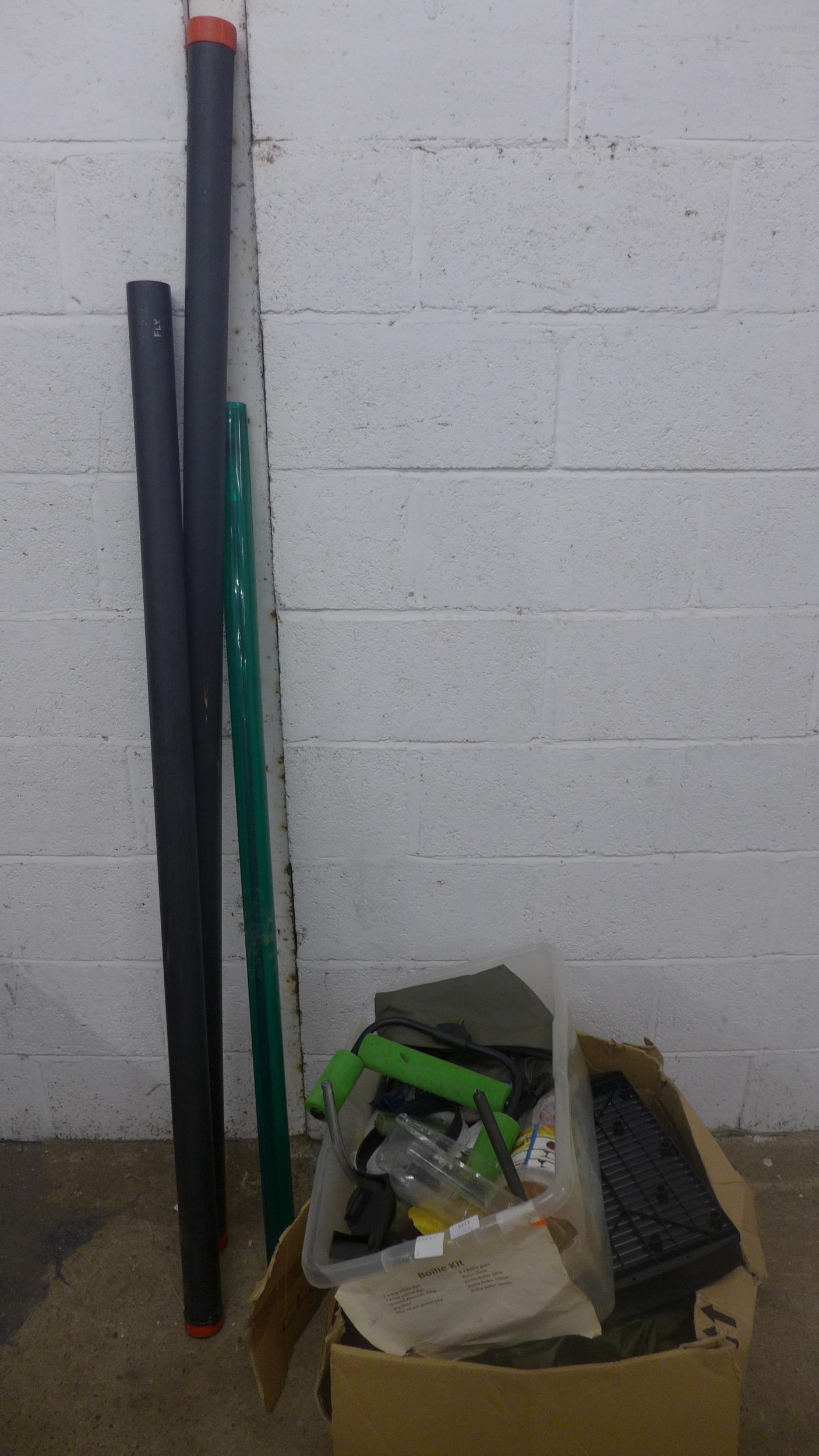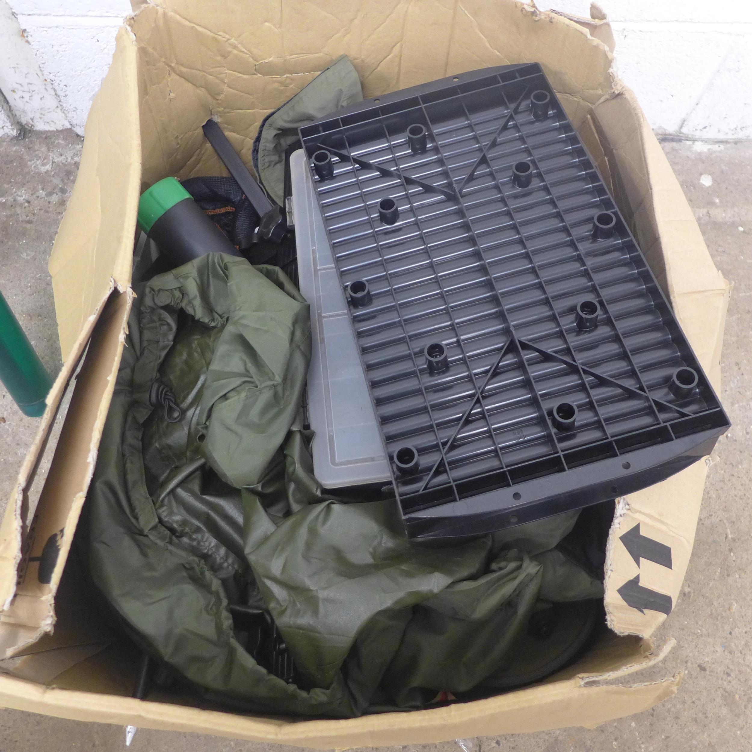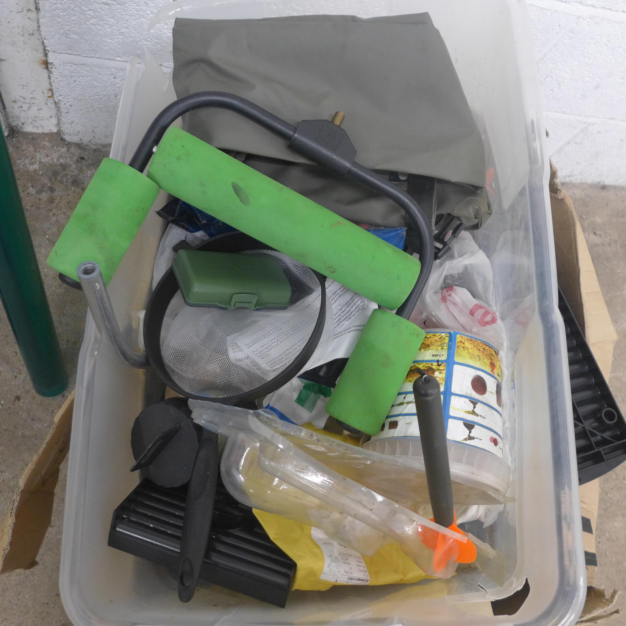 A large quantity of fishing equipment including various bait, dye, drop zone maker, organiser tray, a Seymo rod rest, rod bags, waders and fishing rods