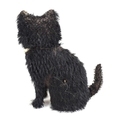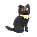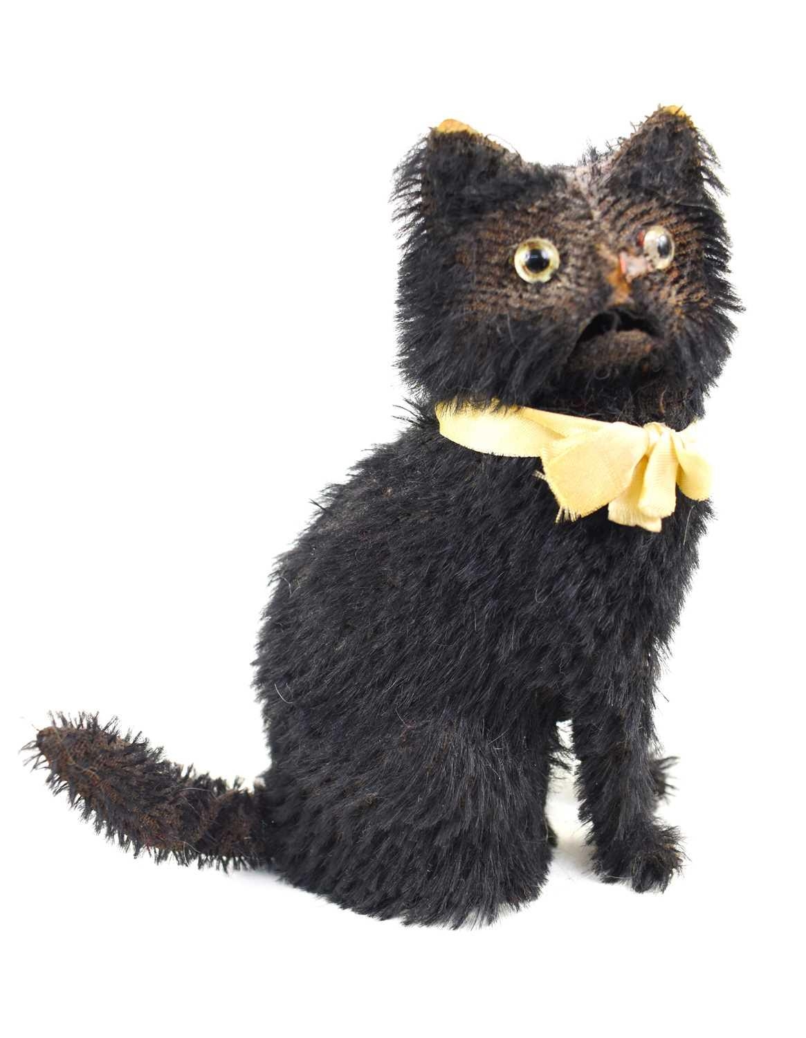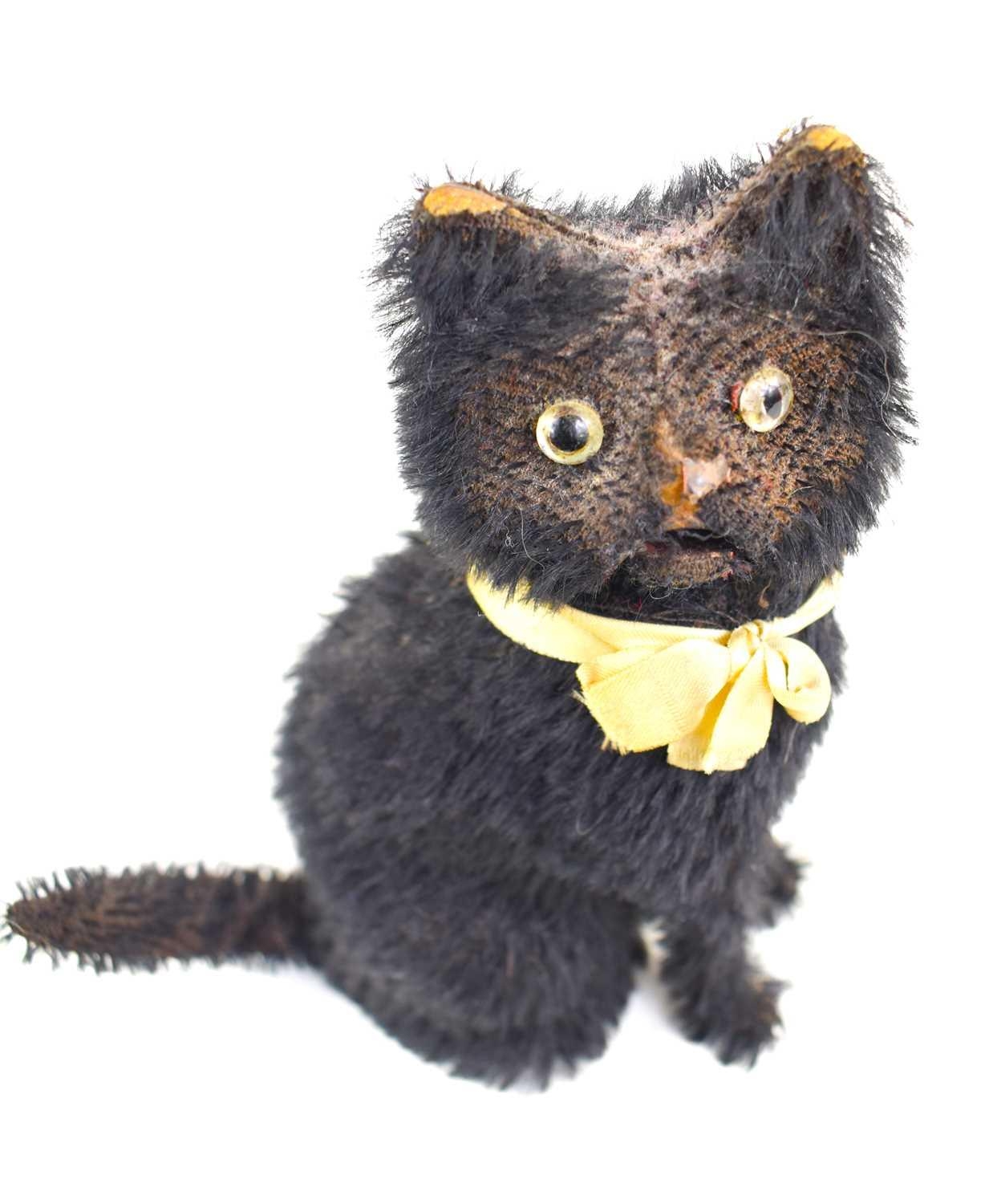 A small vintage automaton black cat, with glass eyes, and cream silk bow, winding hole to the back, with moving mouth (lacking key).