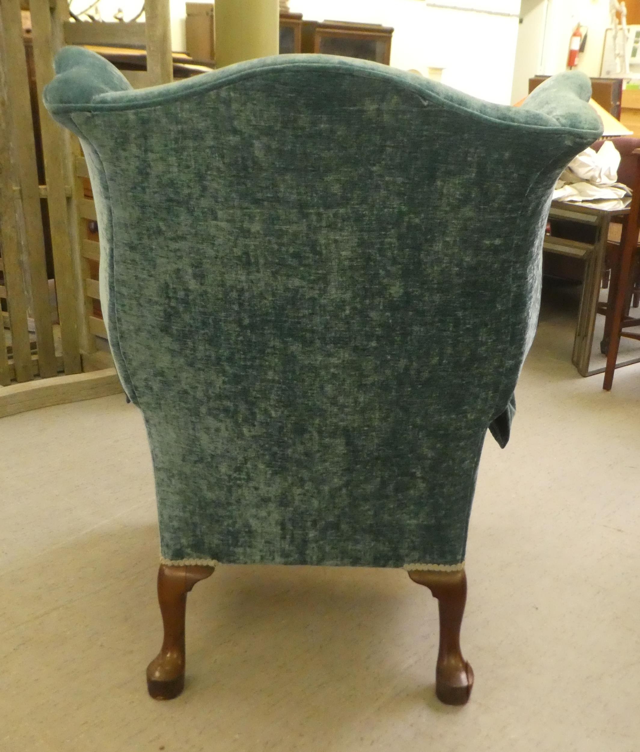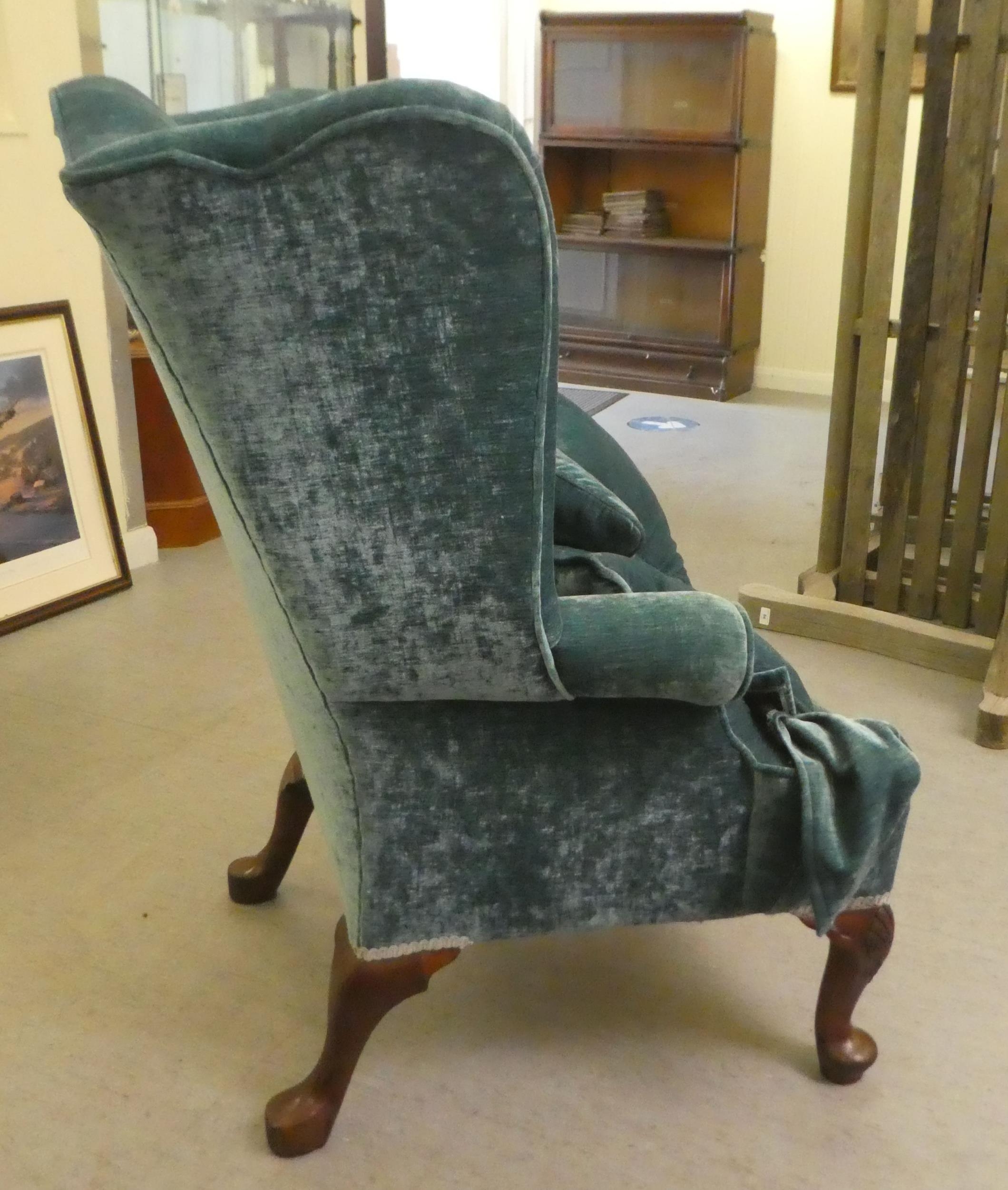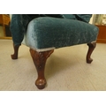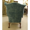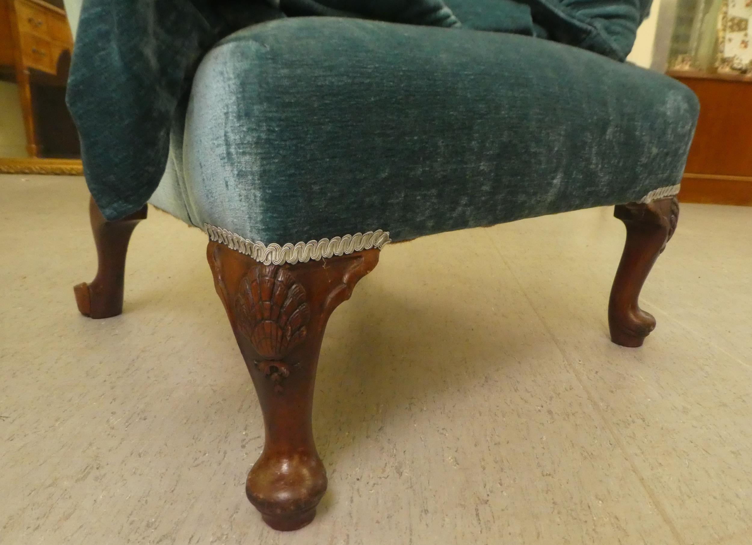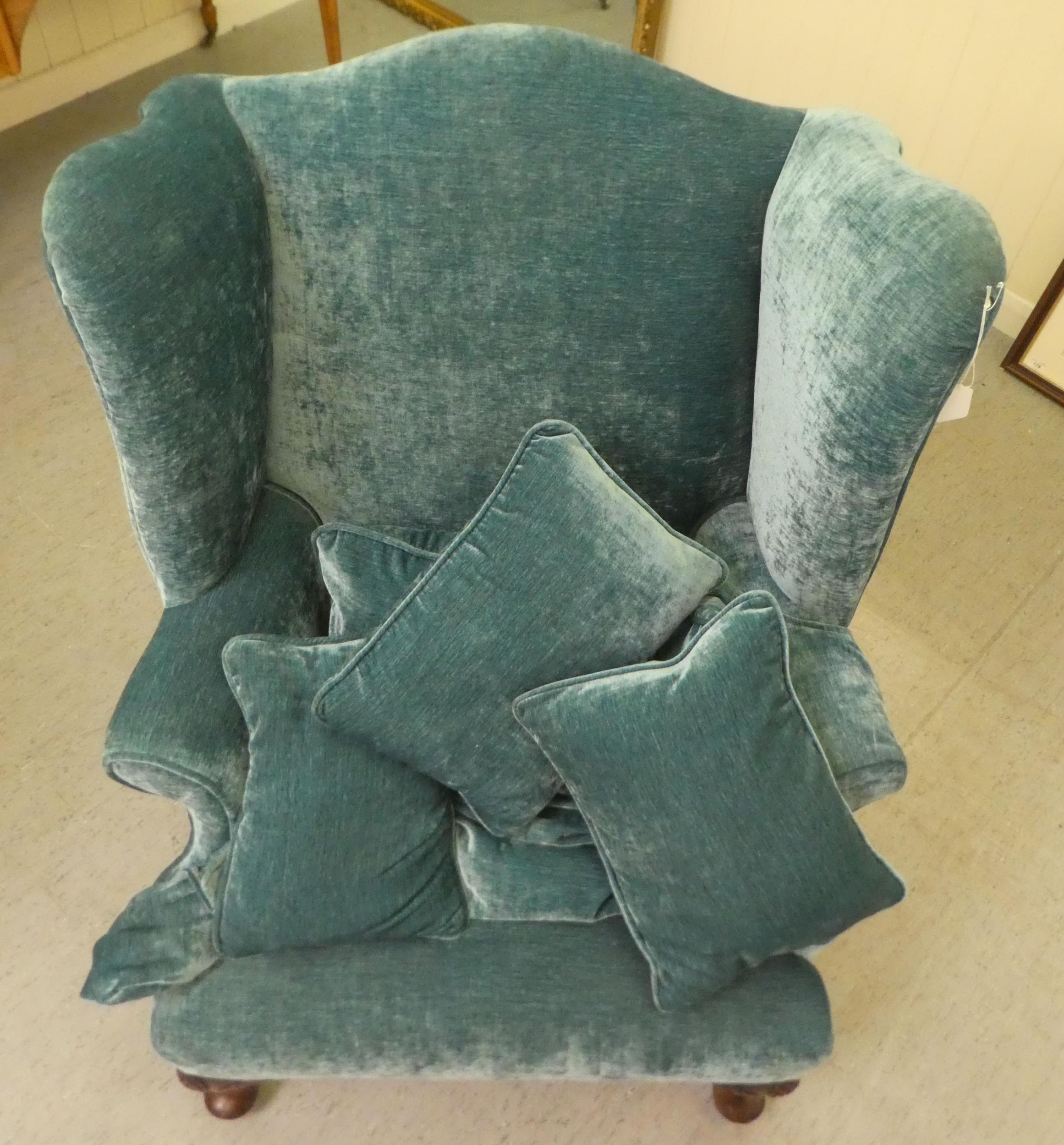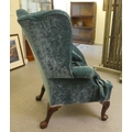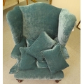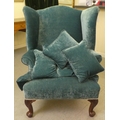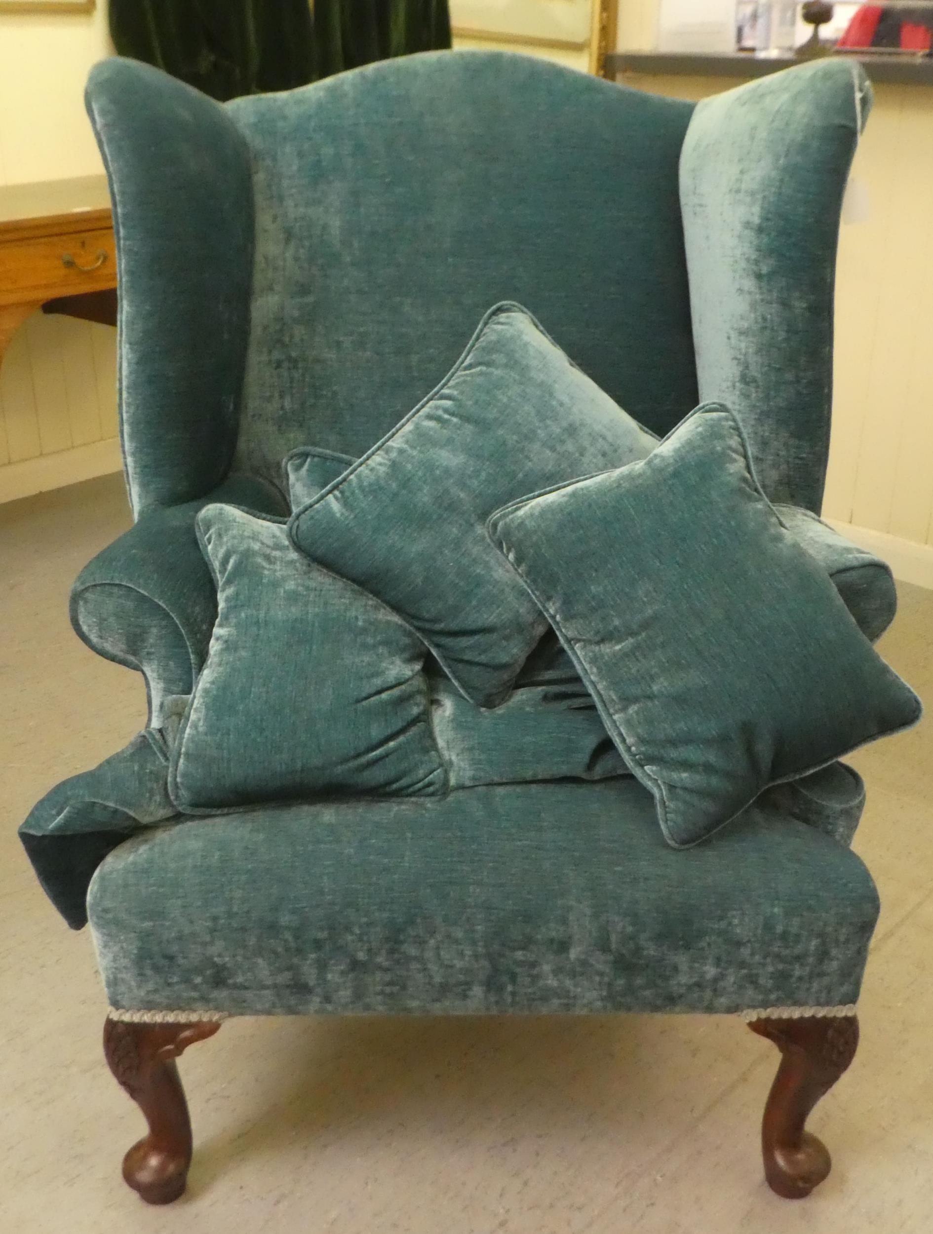 A 20thC Georgian style wingback chair with scrolled arms, upholstered in crushed turquoise coloured fabric, raised on carved mahogany cabriole forelegs with an assortment of scatter cushions