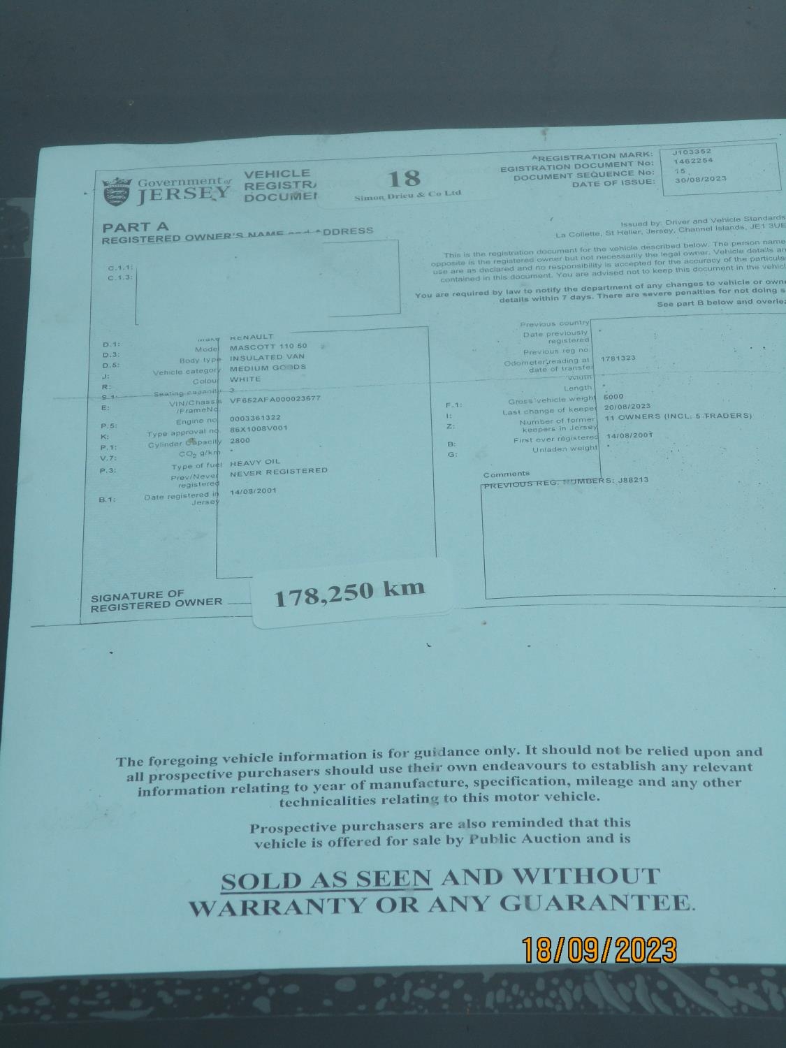 A 2001 Renault Mascott 110 2.8 TDi dropside pick-up J103352 (diesel/manual), odometer reading 178,250 km