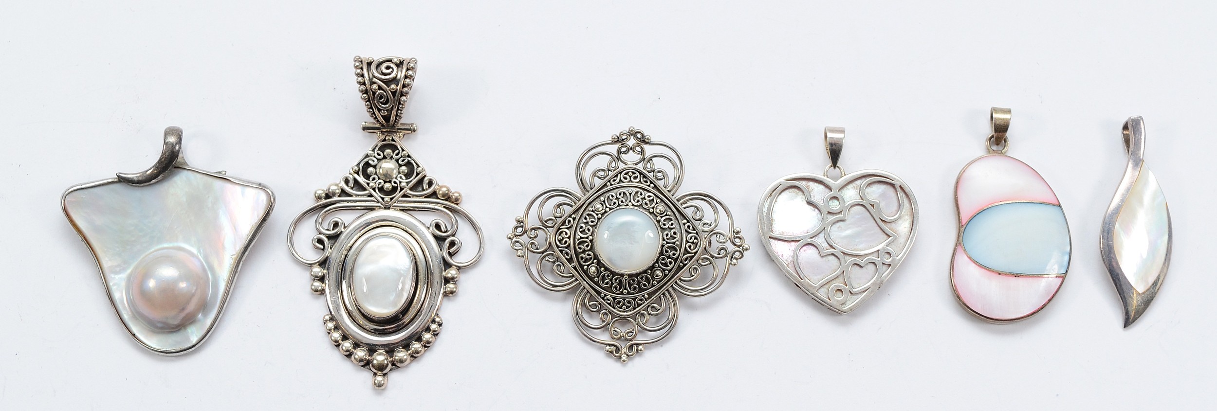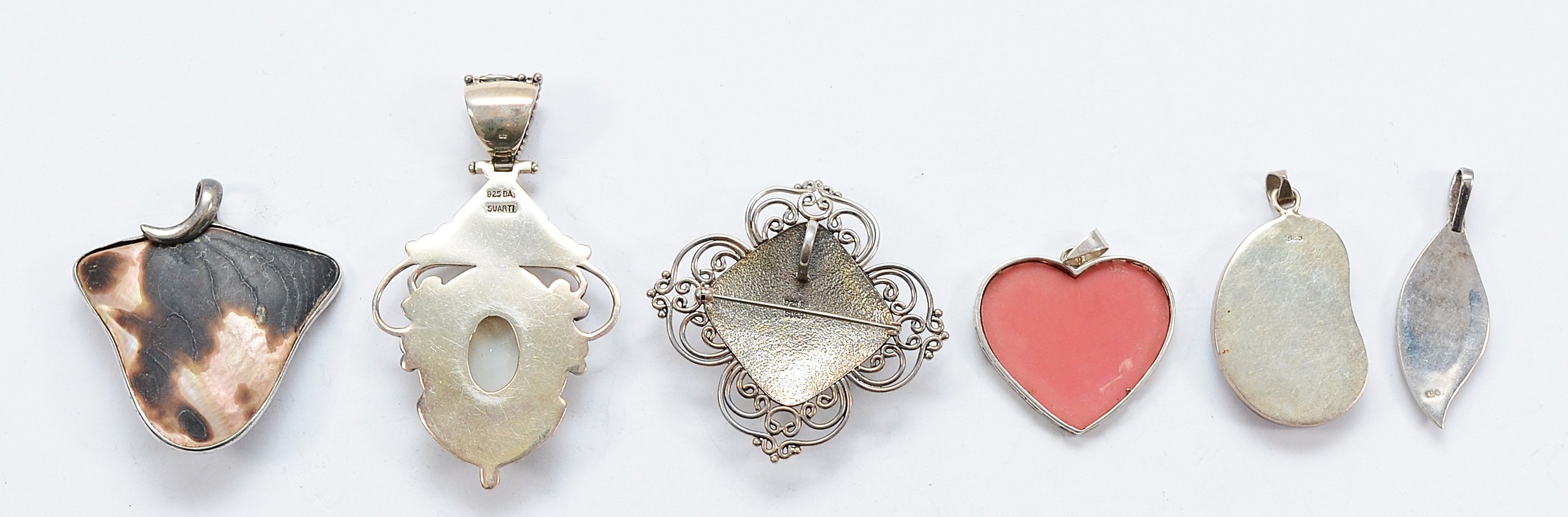 Suarti, two 925 silver mother of pearl pendants, three 925 silver mother of pearl pendants, and an unmarked silver mother of pearl pendant, 76g