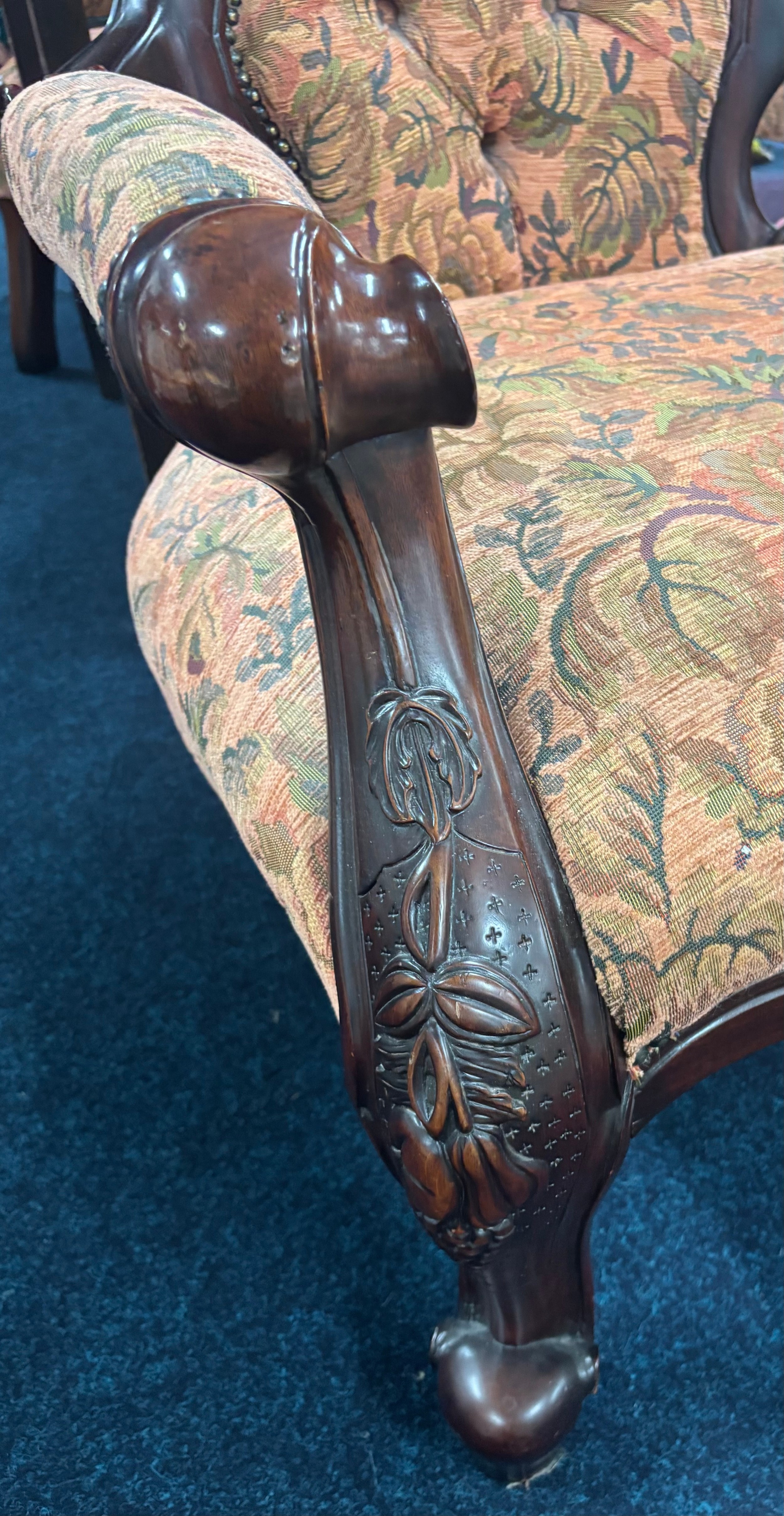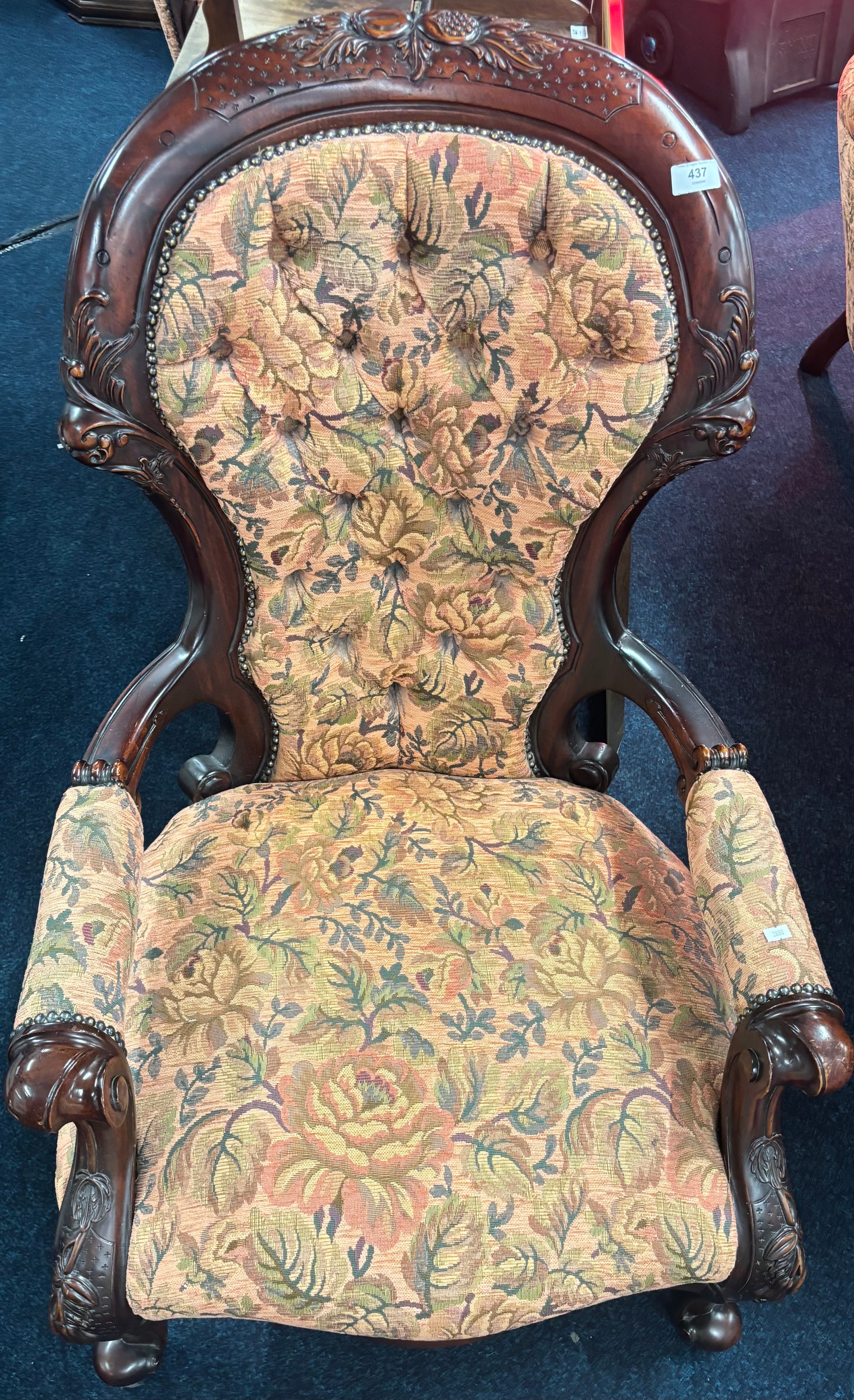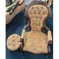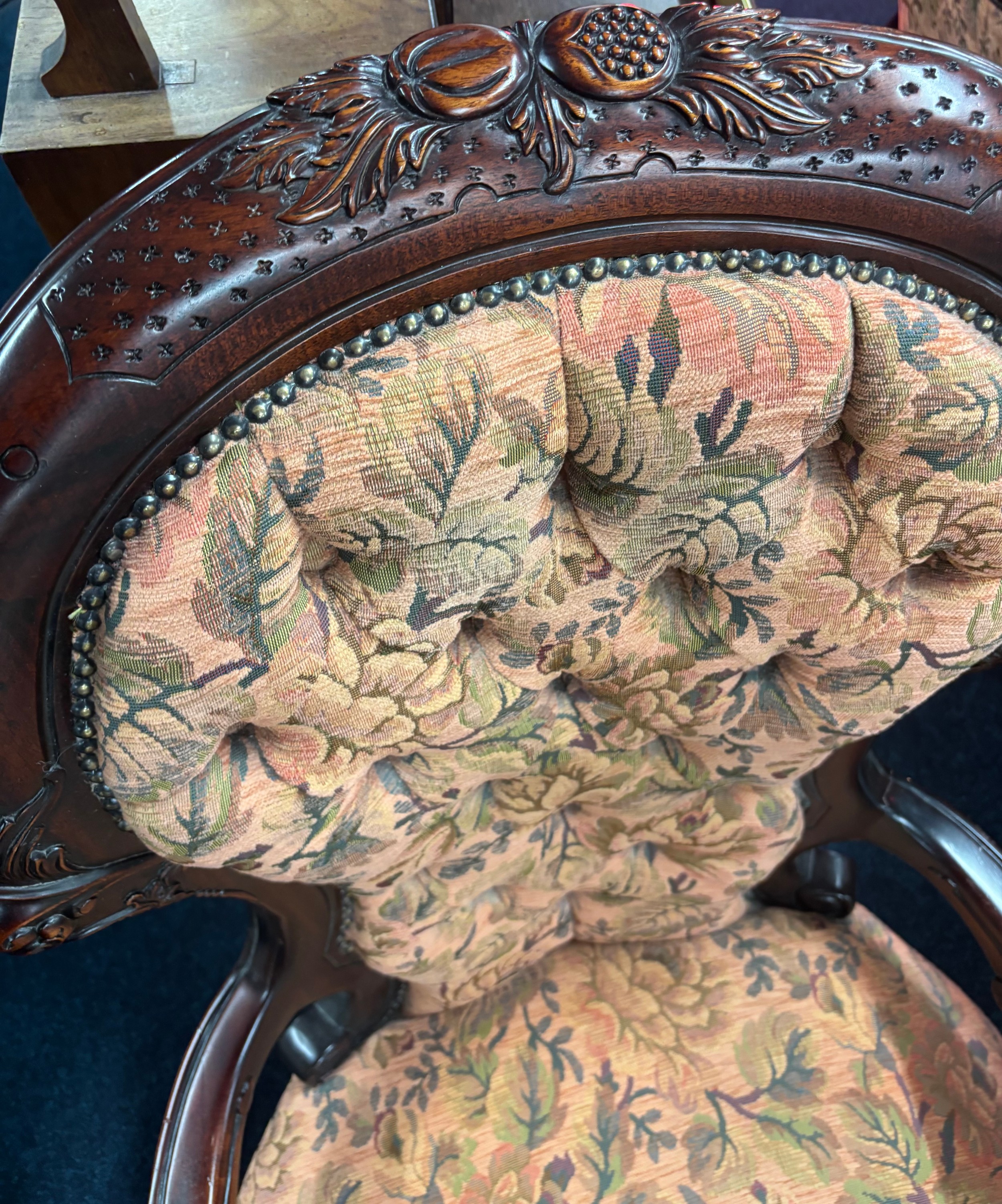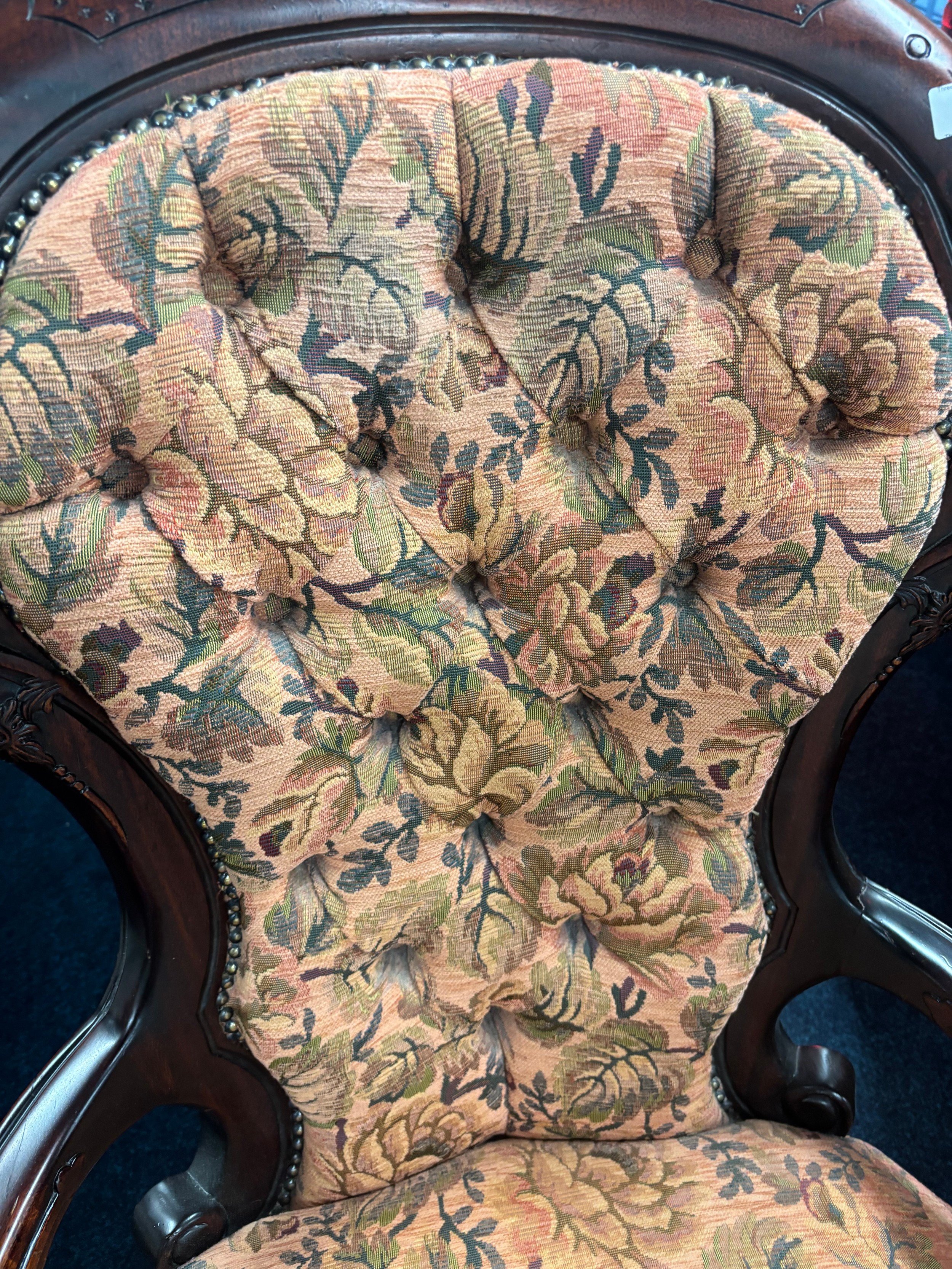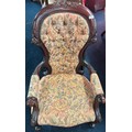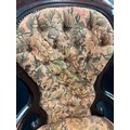 Reproduction of a 19th century parlour arm chair. Button back. Dark wood frame and floral material.