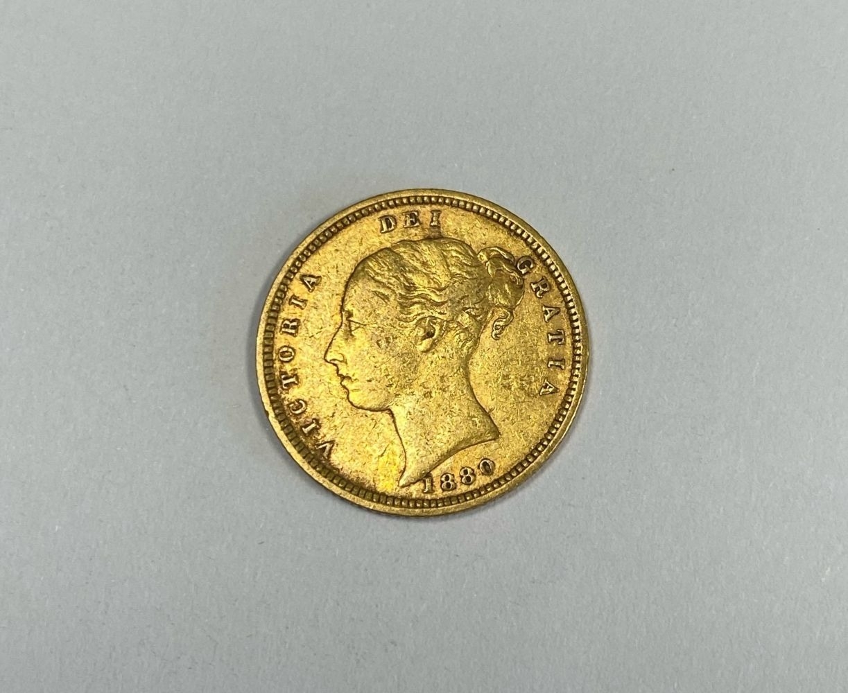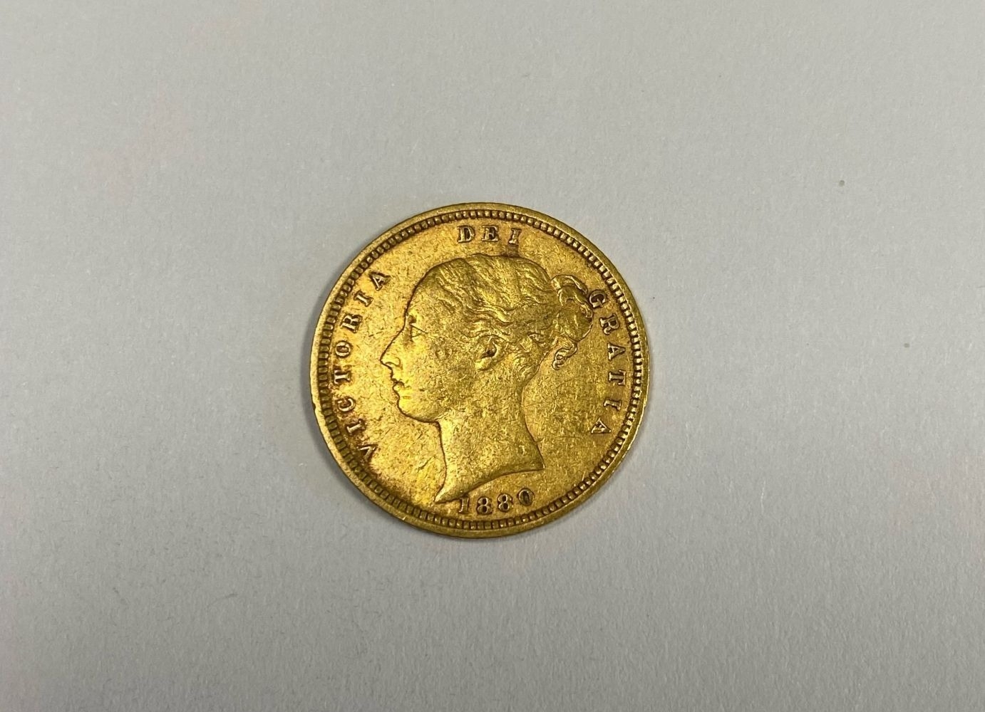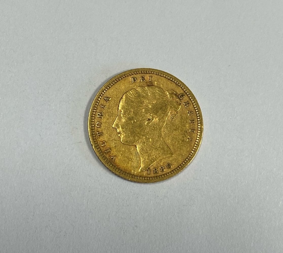 A VICTORIA GOLD HALF-SOVEREIGN – 1880, ‘Young Head’ portrait of Queen Victoria, design by William Wyon, bust facing left, Latin legend VICTORIA DEI GRATIA, 1880, and toothed border surrounding. The reverse with crowned quartered shield of the Royal arms in frame, above Die number 111, surrounded by Latin legend BRITANNIARUM REGINA FID: DEF and toothed border. Weight: 3.97g. The Latin legend translates as “Victoria, by the Grace of God’ to the front and “Queen of the Britons, Defender of the Faith” to reverse. Condition fine as photographed