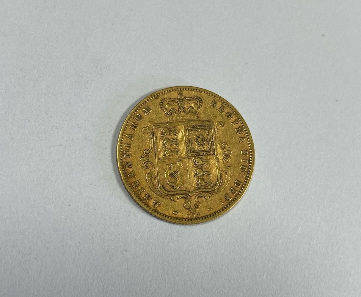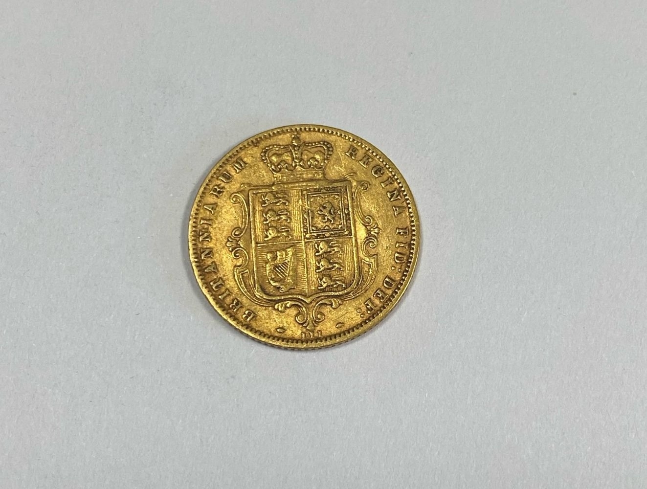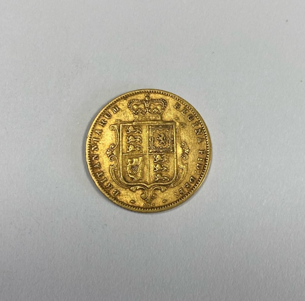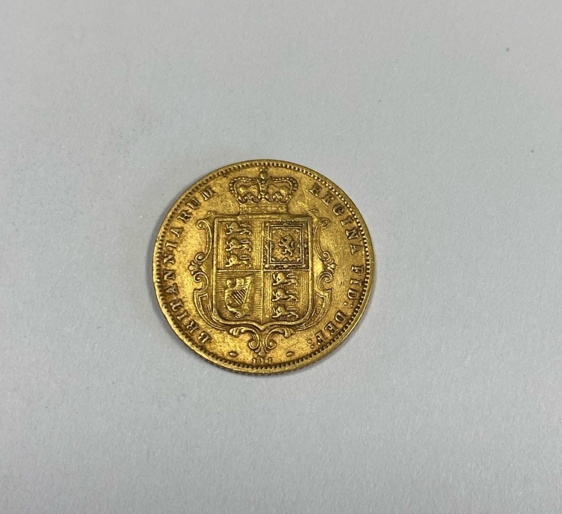 A VICTORIA GOLD HALF-SOVEREIGN – 1880, ‘Young Head’ portrait of Queen Victoria, design by William Wyon, bust facing left, Latin legend VICTORIA DEI GRATIA, 1880, and toothed border surrounding. The reverse with crowned quartered shield of the Royal arms in frame, above Die number 111, surrounded by Latin legend BRITANNIARUM REGINA FID: DEF and toothed border. Weight: 3.97g. The Latin legend translates as “Victoria, by the Grace of God’ to the front and “Queen of the Britons, Defender of the Faith” to reverse. Condition fine as photographed