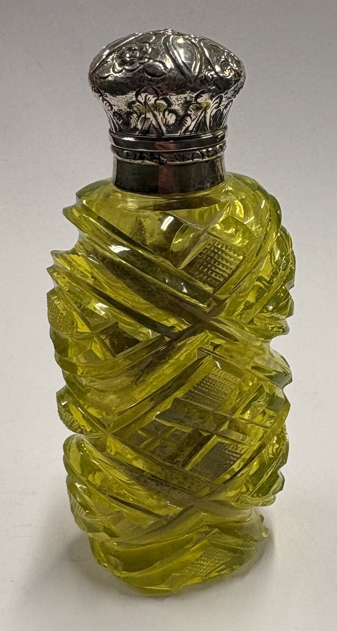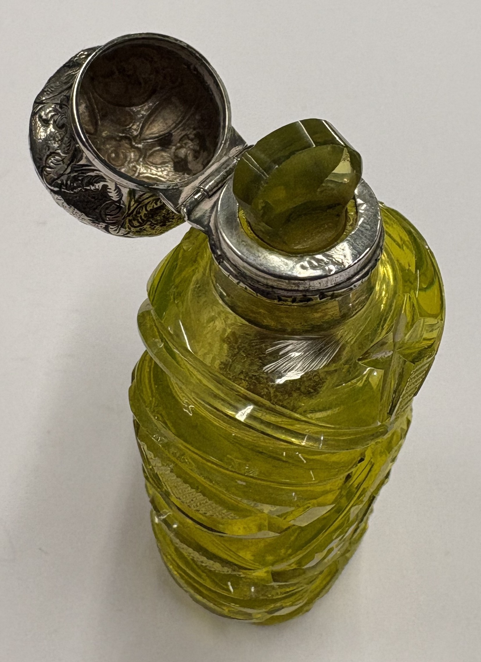 A Victorian silver-mounted yellow glass scent bottle. Est. £50 - £80.