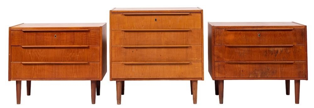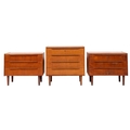 A pair of Danish teak veneered low chests of drawers, by Steens, circa 1960s; each with three drawers and short tapered legs; 62cm high, 75cm wide, 47cm deep; and another example, similar; 74cm high