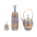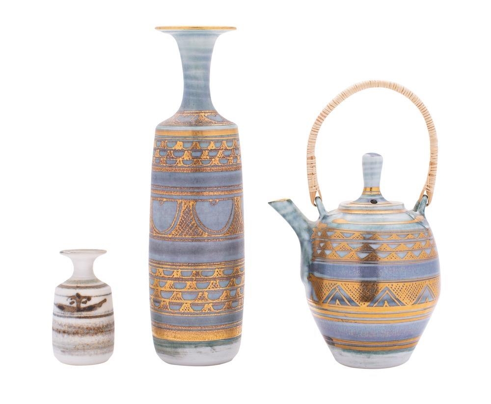 *Mary Rich [1940-2022] three pieces of porcelain, comprising a slender cylindrical vase with narrow flaring neck, a shouldered oviform tea pot and a miniature vase, the two former with blue and gold decoration the latter with a simple landscape in green, impressed personal seals, tallest vase 18.5cm high.