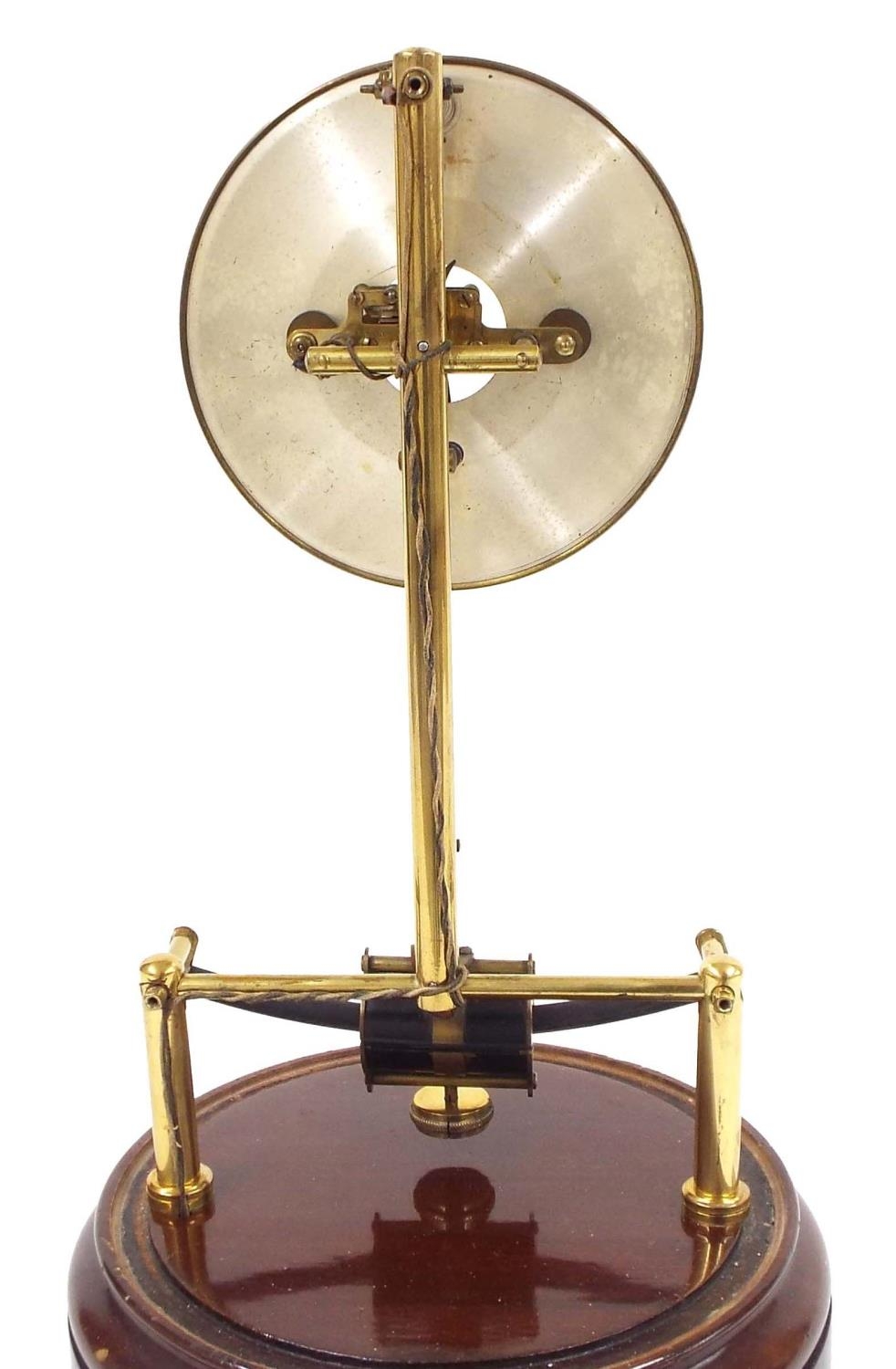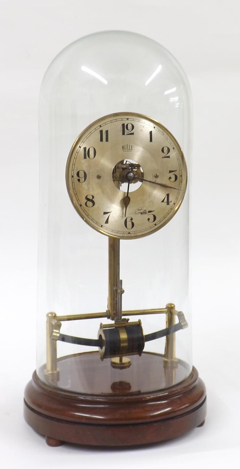 Bulle electric mantel clock, the 5.5" silvered dial with skeletonised centre, upon brass supports and a stepped turned mahogany base, under a glass dome, 19" high