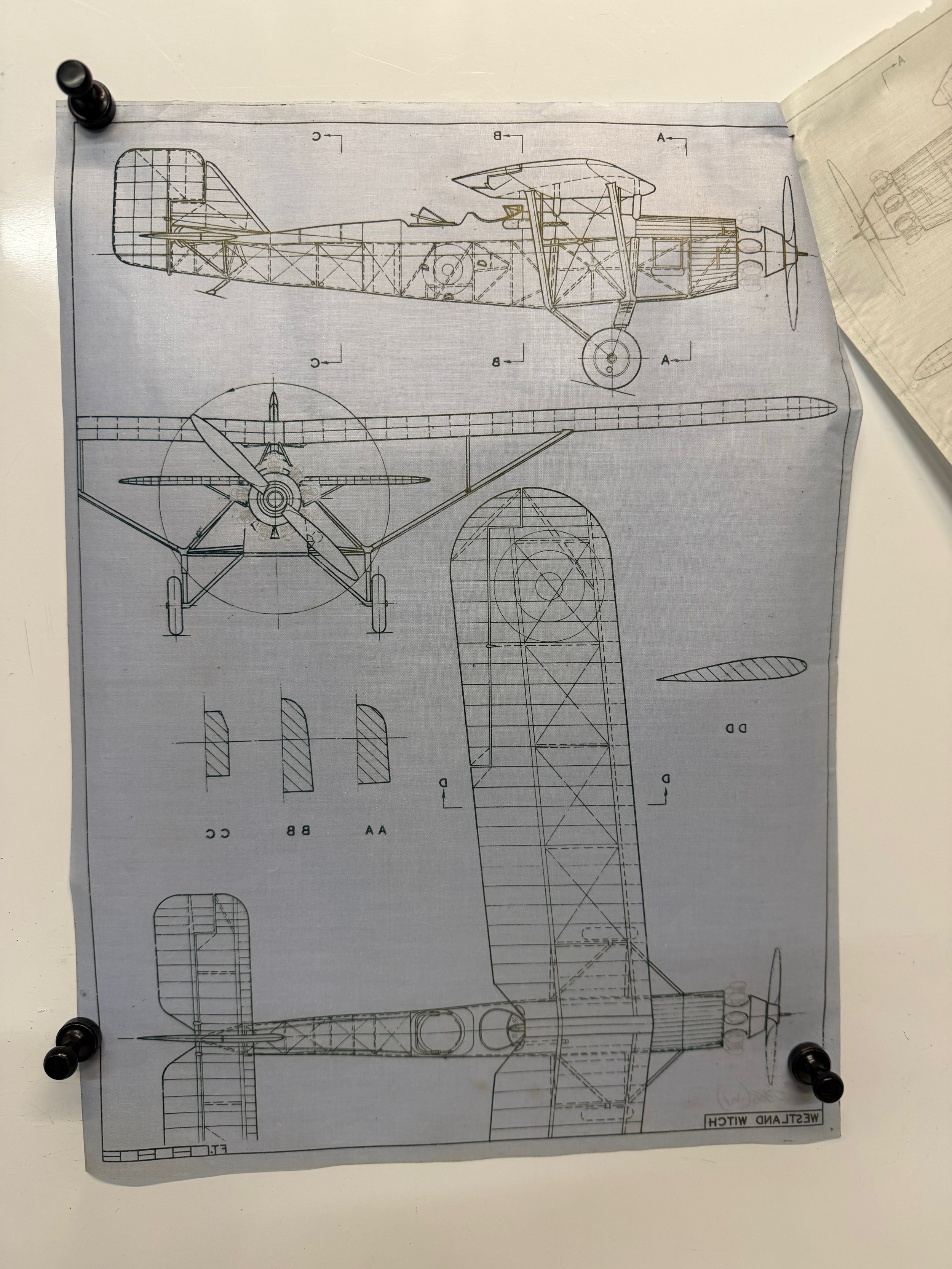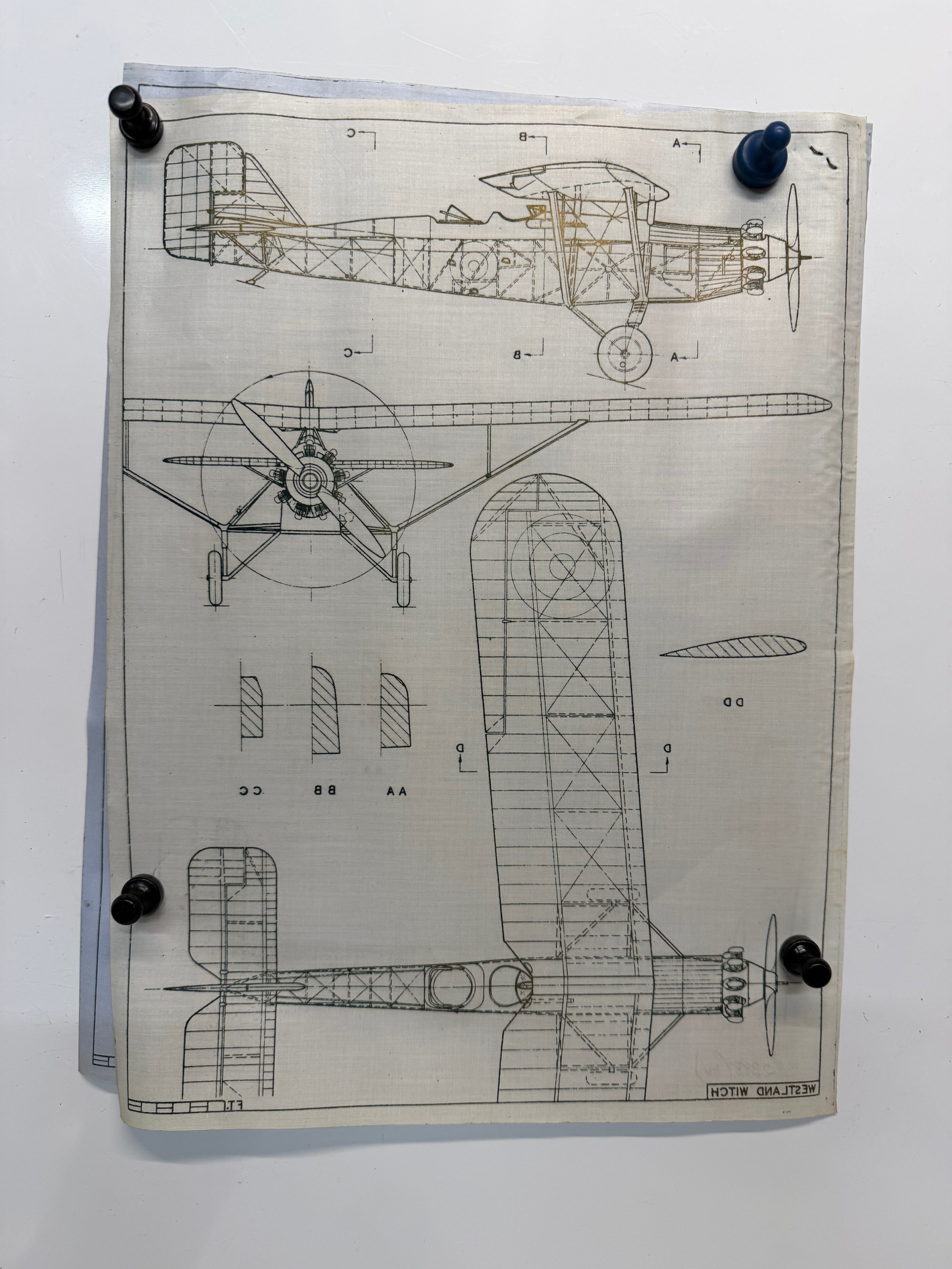 British aviation WWI planes, Vintage aircraft plans on linen of a Westland Witch, 27cm x 39 cm.