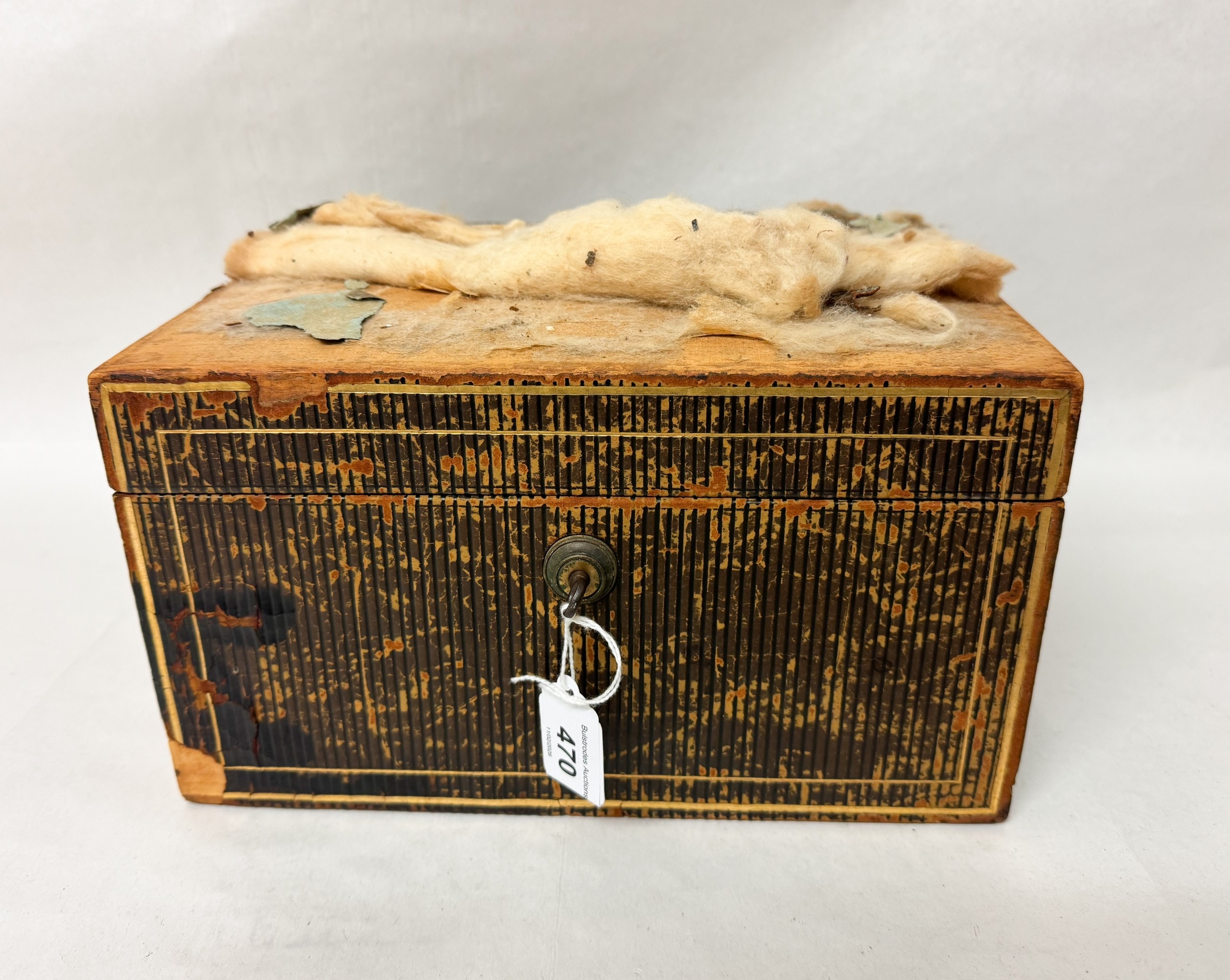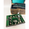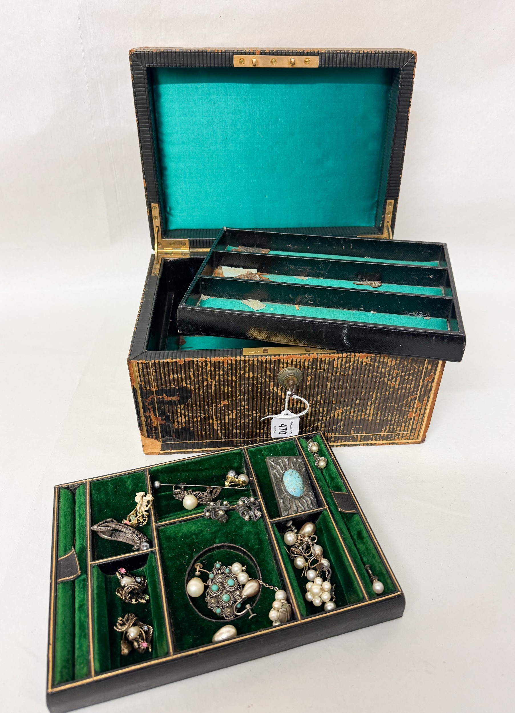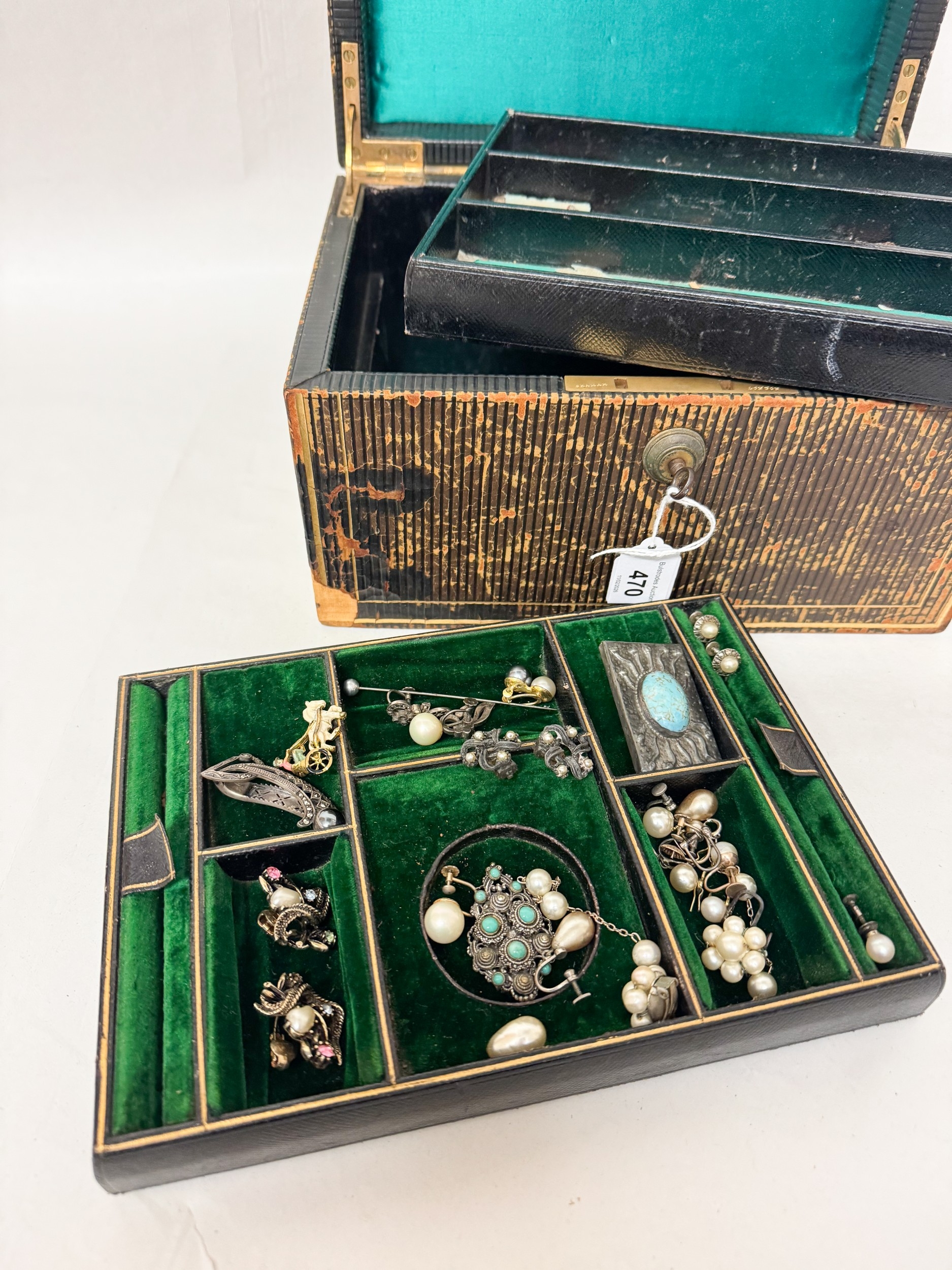 A Victorian jewellery box containing silver and marcasite pieces, faux pearl earrings with two lift out trays. Box as found