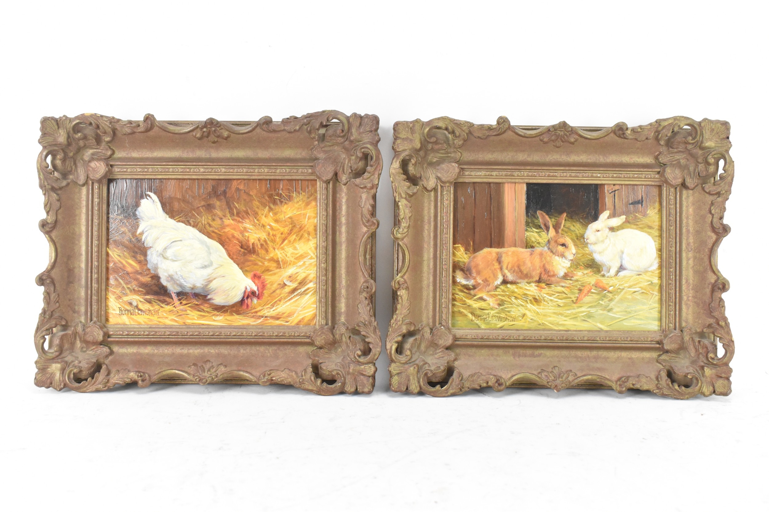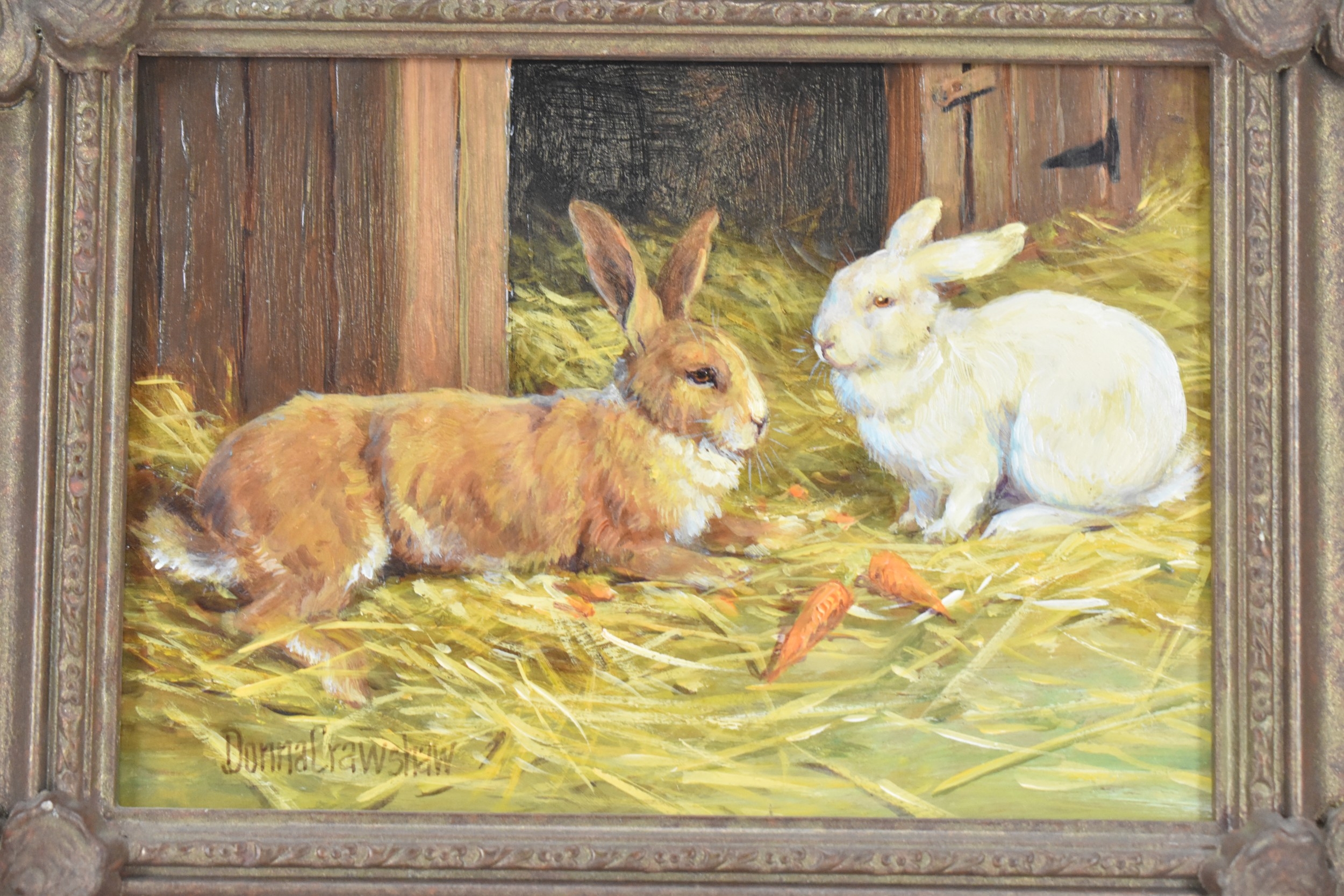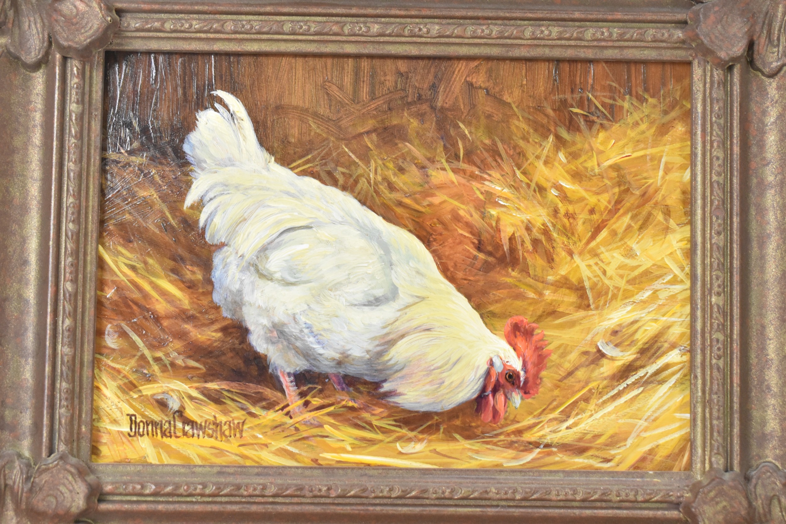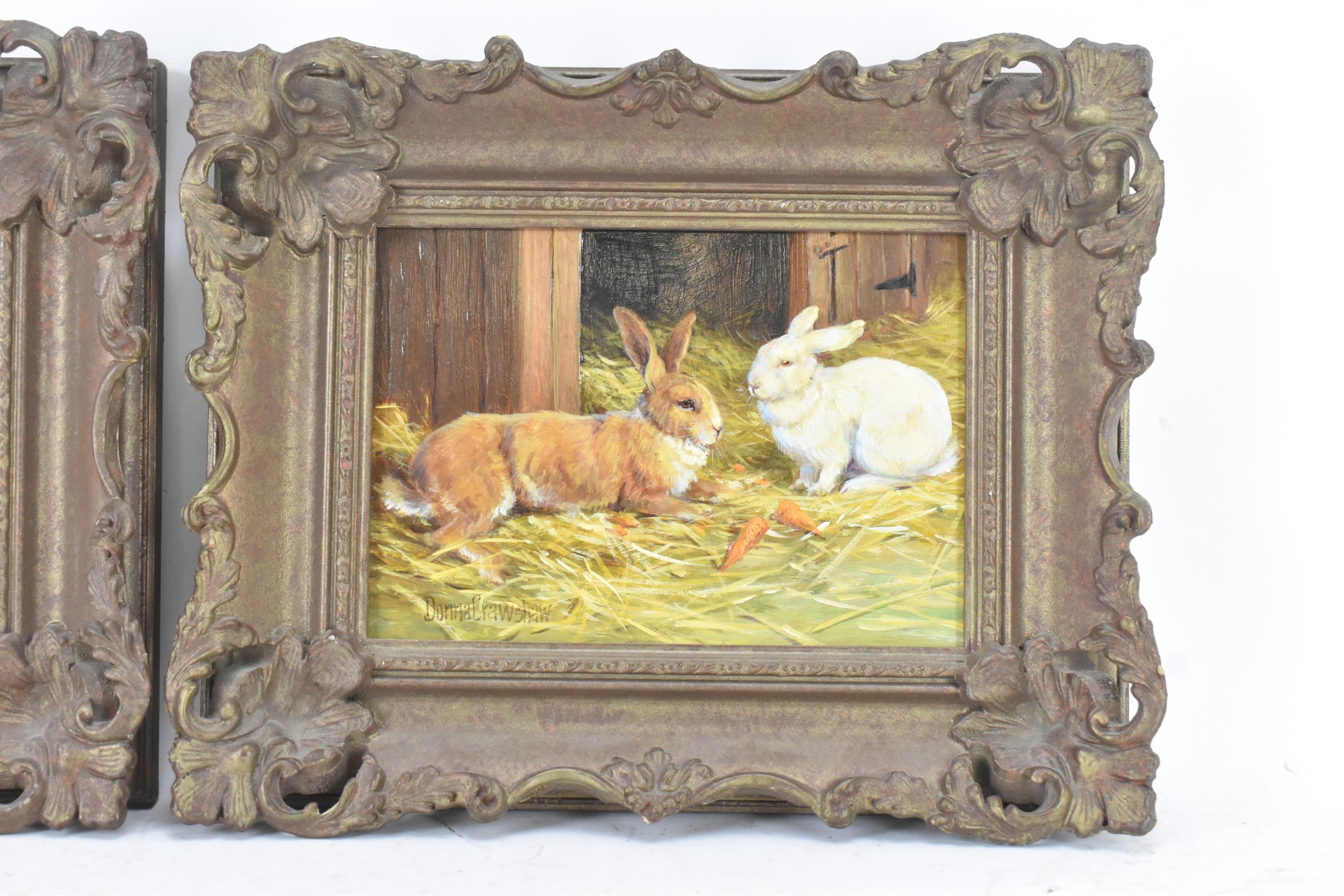 Donna Crawshaw (B.1960) Two oil on boards, one depicting a chicken and the other two rabbits, both signed to the lower left corners, 16.5cm x 11.5cm, the frames 27cm x 22cm