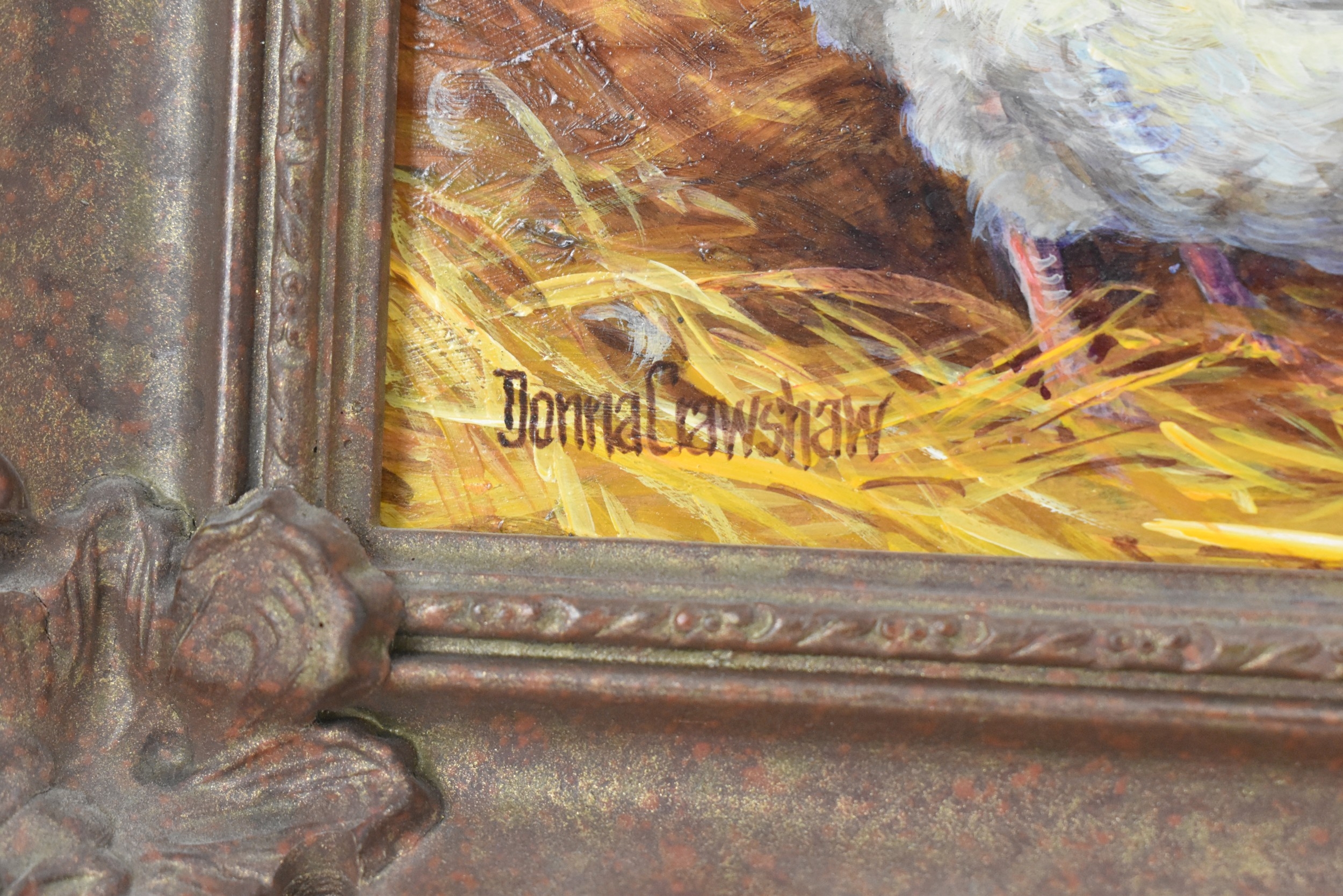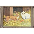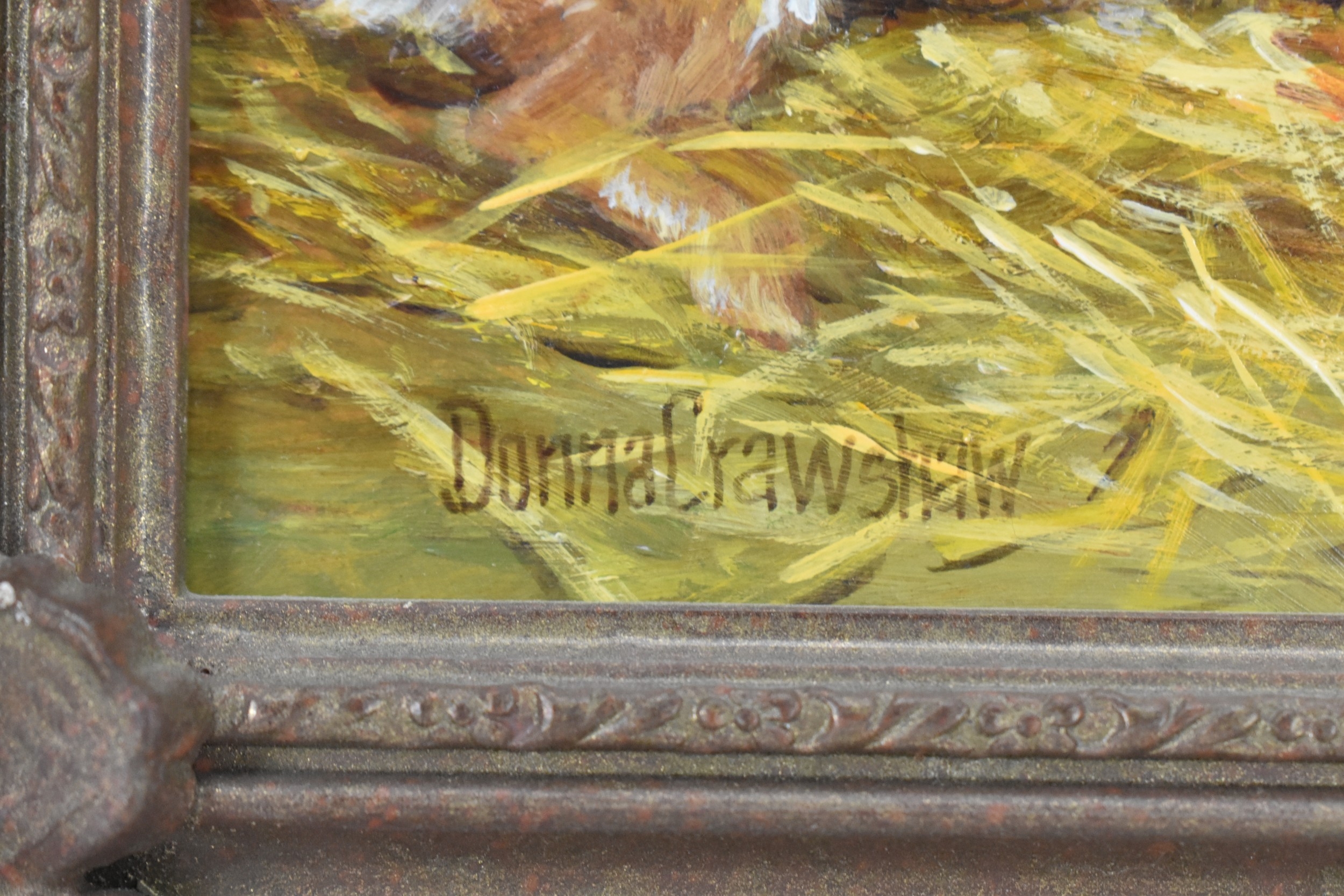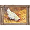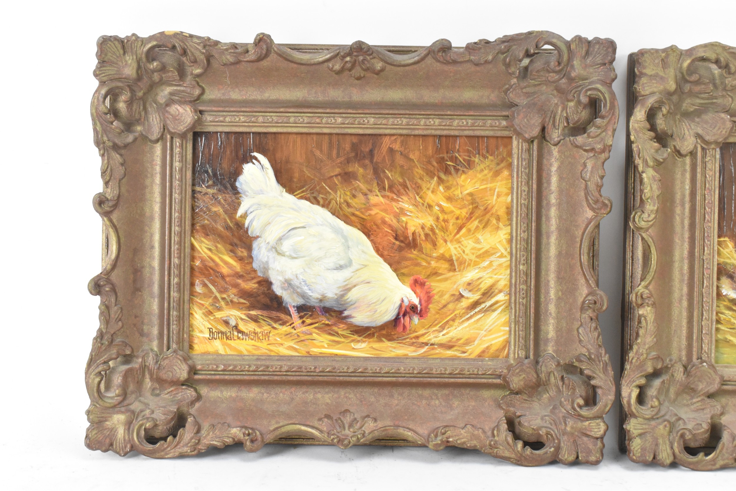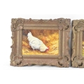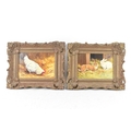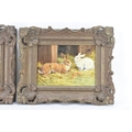 Donna Crawshaw (B.1960) Two oil on boards, one depicting a chicken and the other two rabbits, both signed to the lower left corners, 16.5cm x 11.5cm, the frames 27cm x 22cm