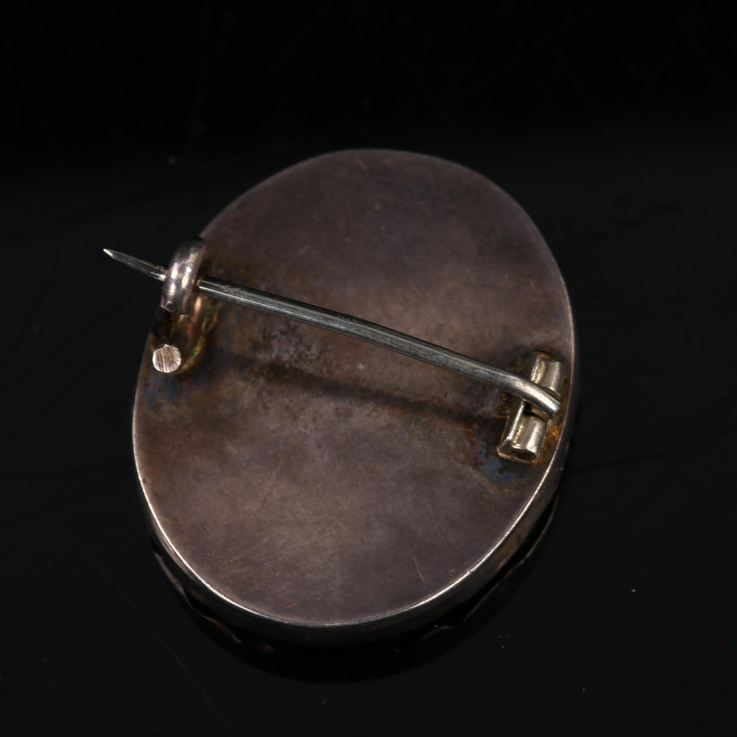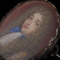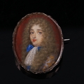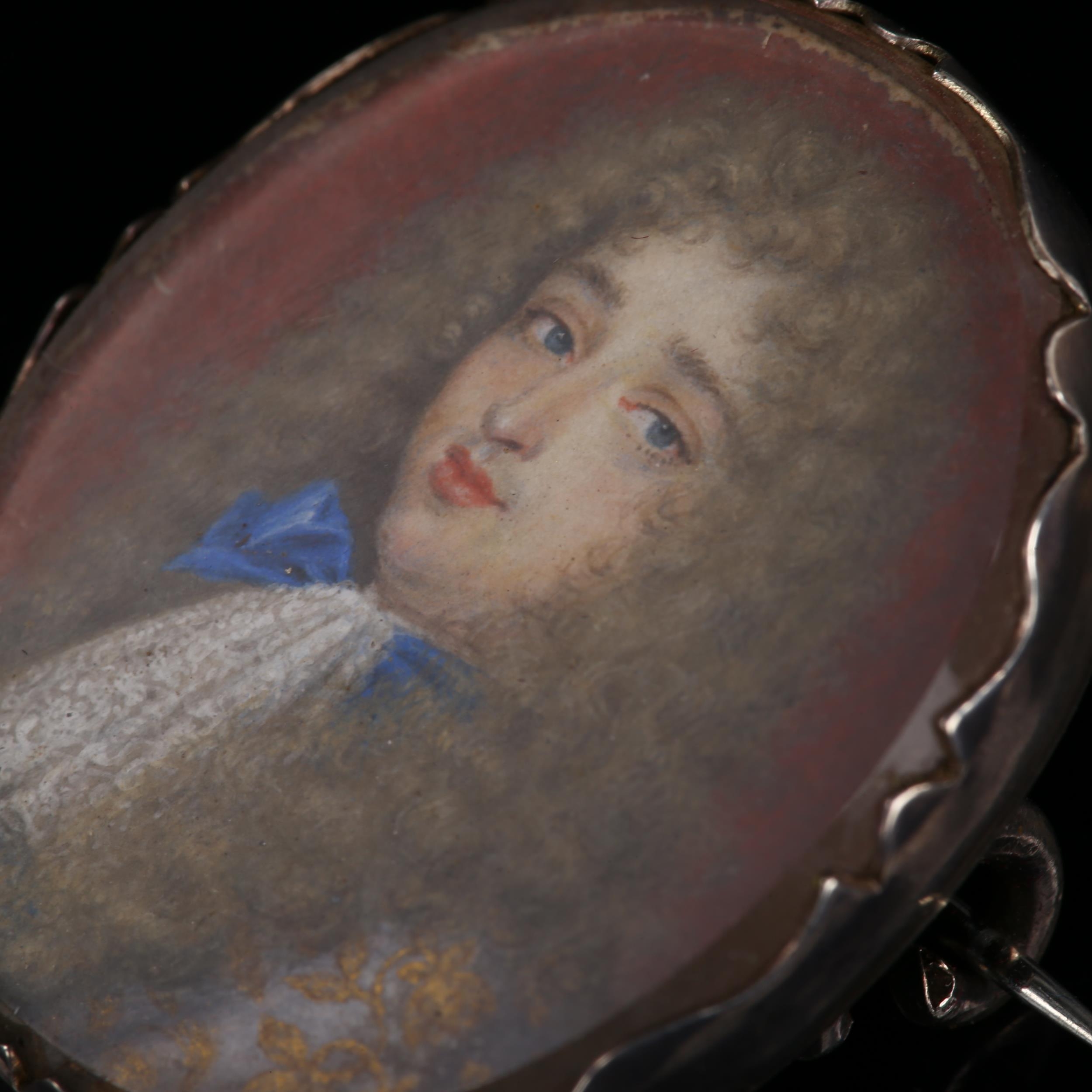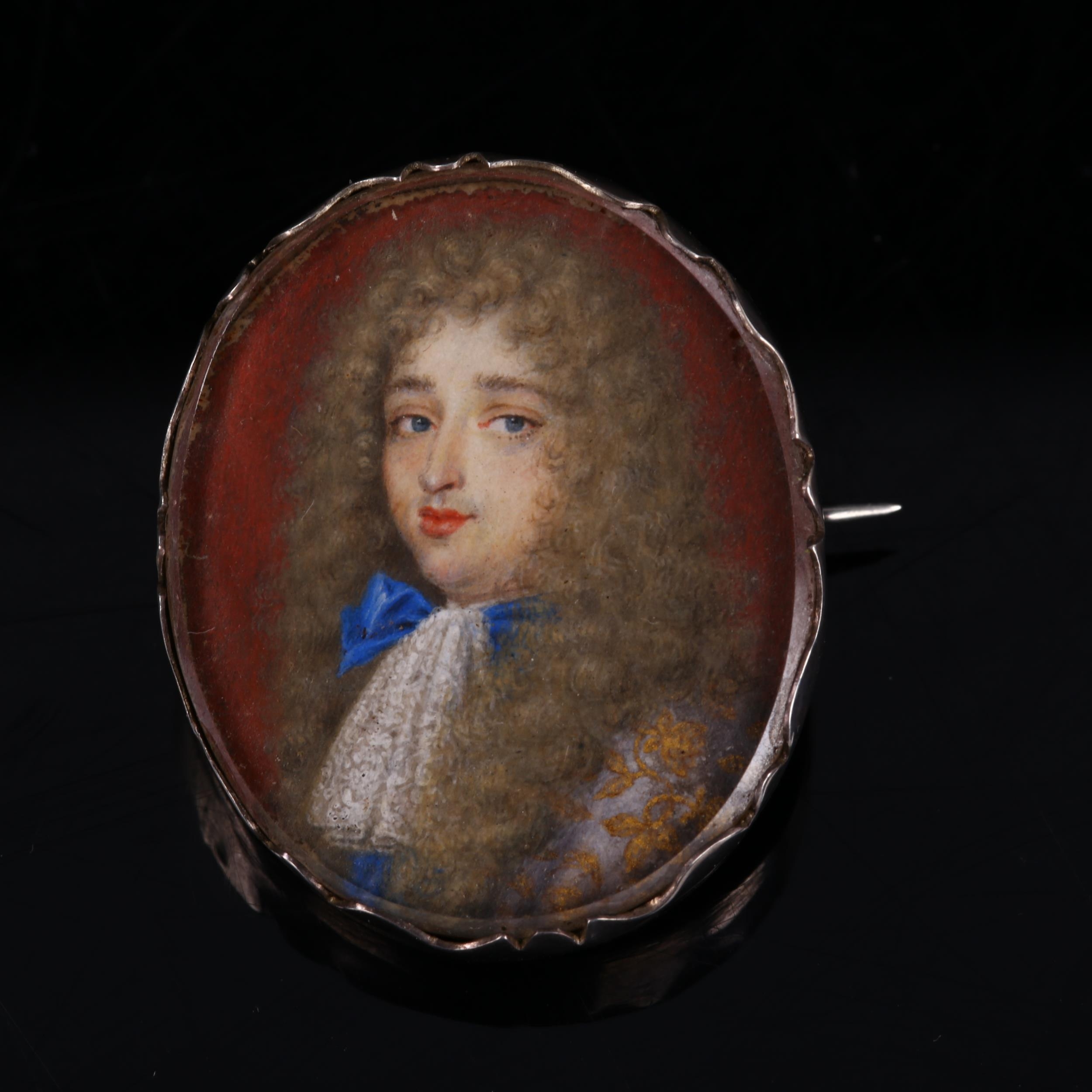 A miniature watercolour portrait a man wearing a powdered wig, in unmarked silver brooch mount, height 3cm