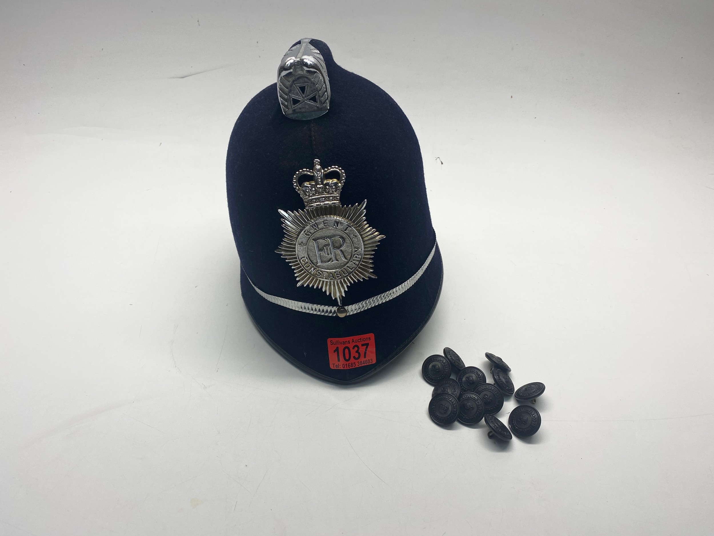 Gwent Constabulary police helmet and collection of police buttons.