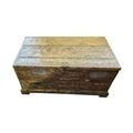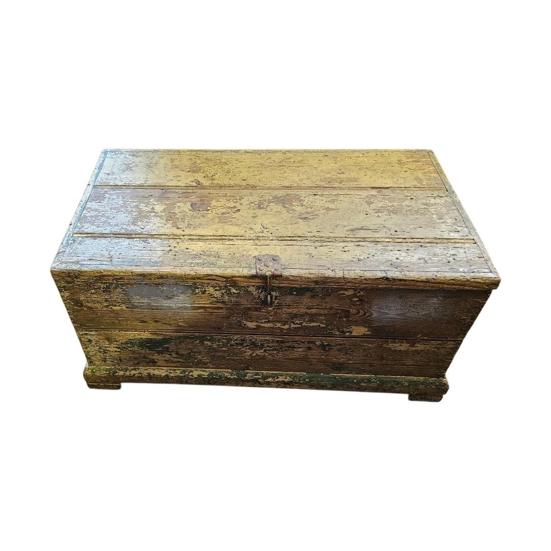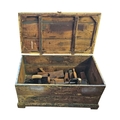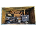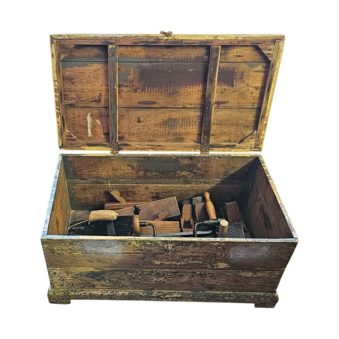 A rustic assortment of antique tools including wooden smoothing and moulding planes, a hand cranked brace drill, and various masonry trowels, the lot further comprises two forged pickaxe heads, a coping saw, and heavy duty steel pincers, all pieces exhibit a genuine aged patina and signs of historic use, together with a painted pine tool chest/box.