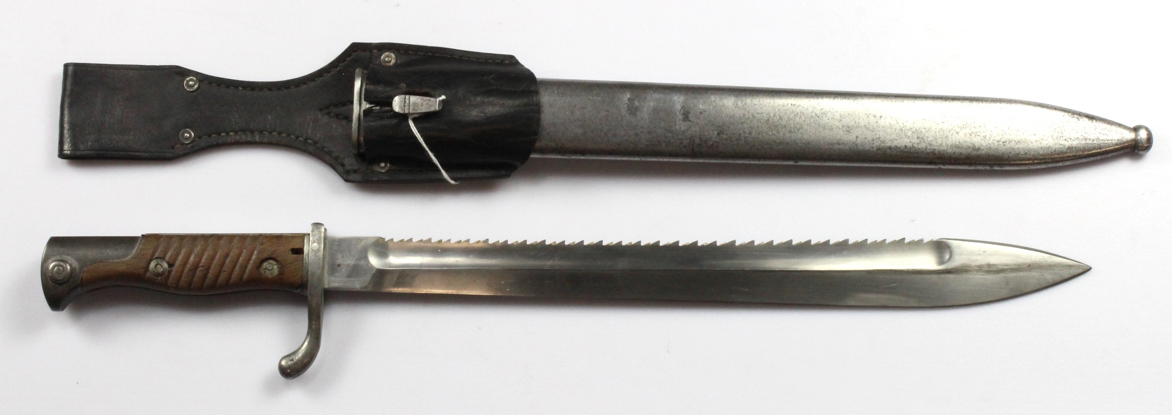 German 85/98 Sawback Butchers Bayonet. Narrow Ears Mauser AG Obendorf, damaged frog.