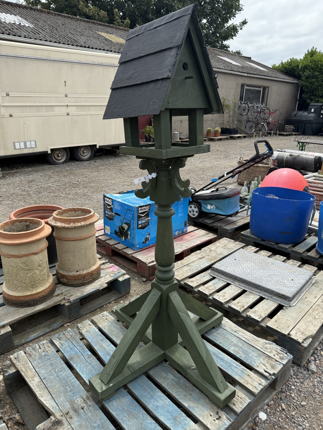 A wooden bird table with integrated nest box and slate roof