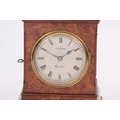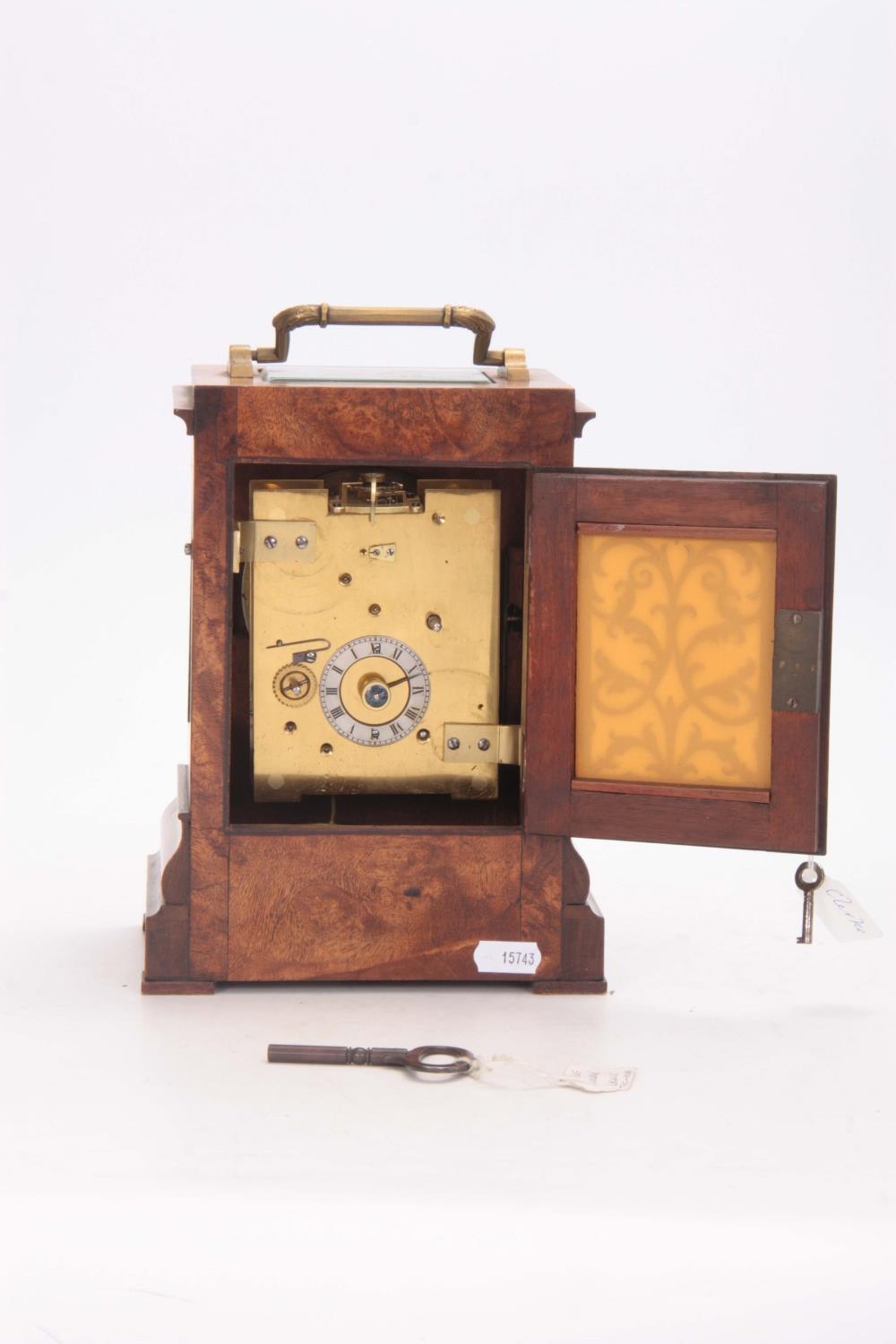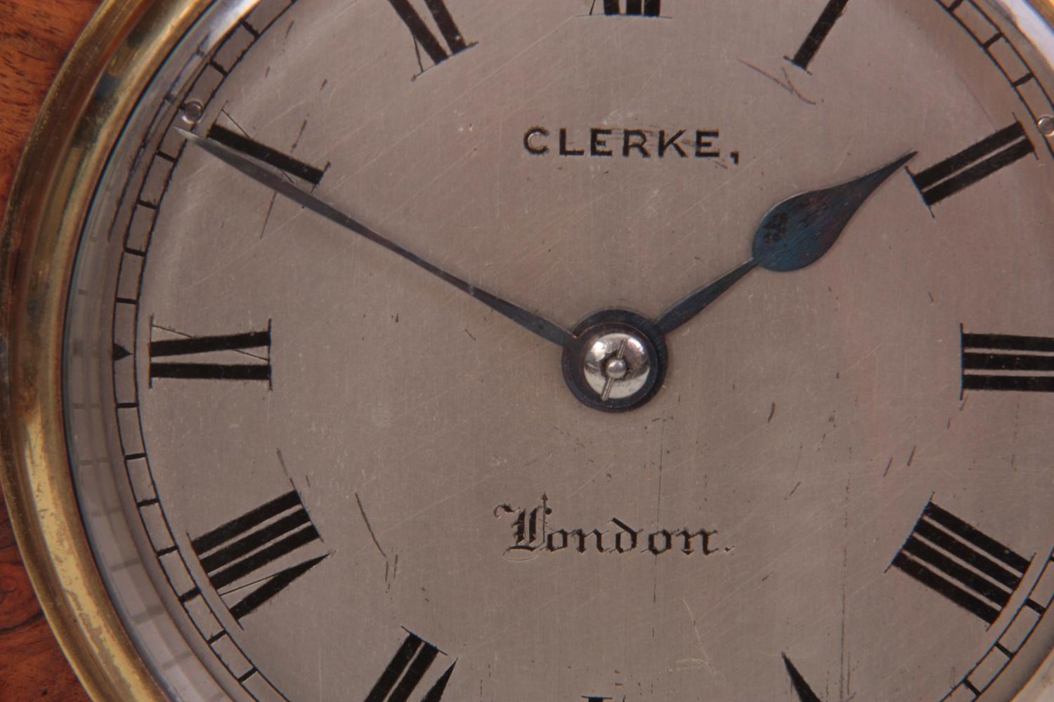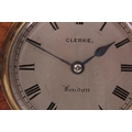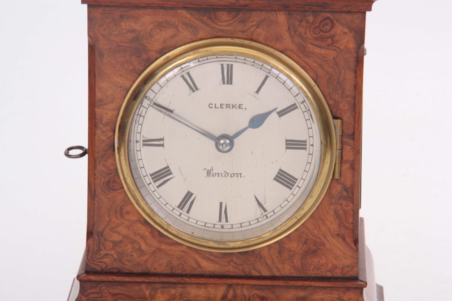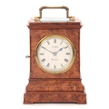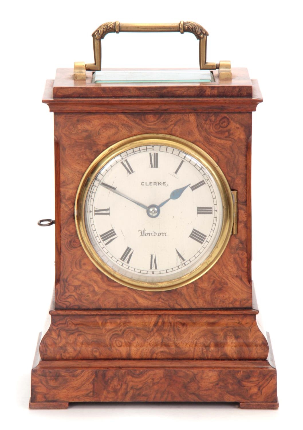 CLERKE, LONDON A SMALL 19TH CENTURY BURR WALNUT CARRIAGE STYLE FUSEE MANTEL CLOCK WITH ALARM the case surmounted by a brass hinged handle above a bevelled glass panel with matching panels to the side, the front with locking cast brass bezel enclosing a 3.5" silvered engraved circular dial with Roman numerals fronting an eight-day chain driven fusee movement with Harrison maintaining power and large balance wheel lever escapement; the spring-driven alarm mechanism striking a bell mounted in the base 24cm high