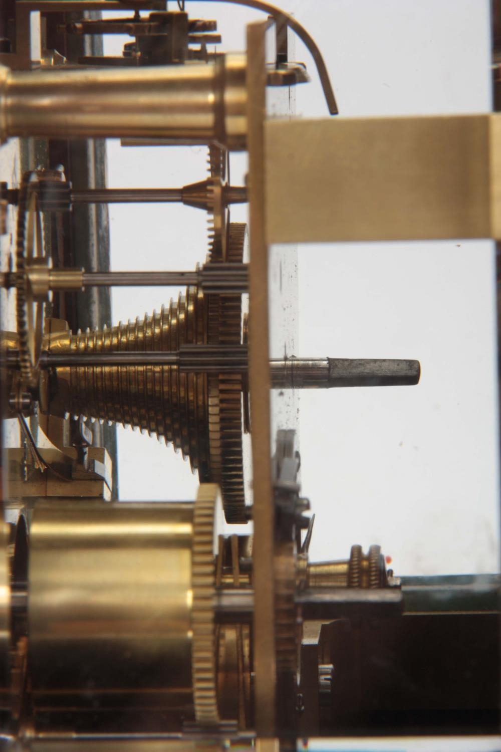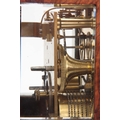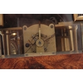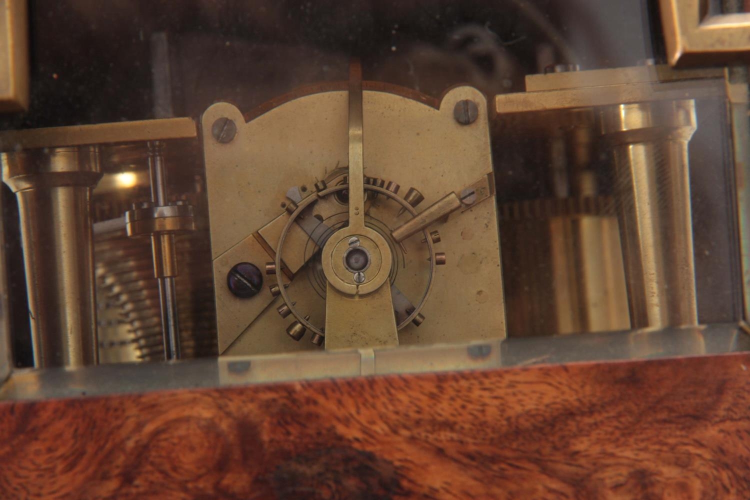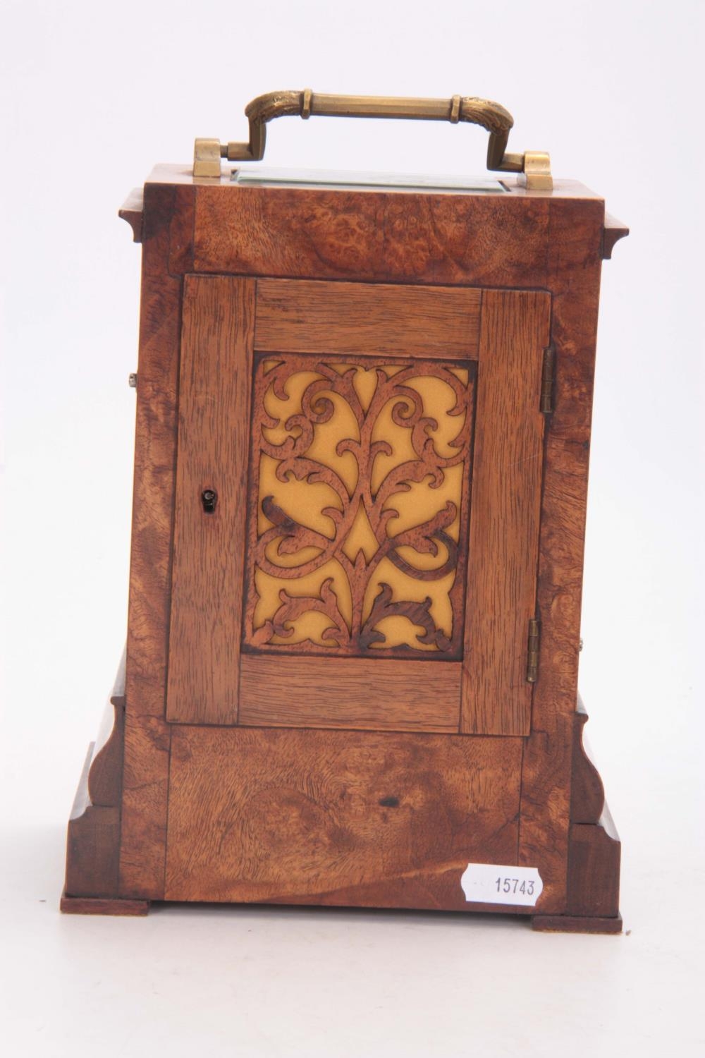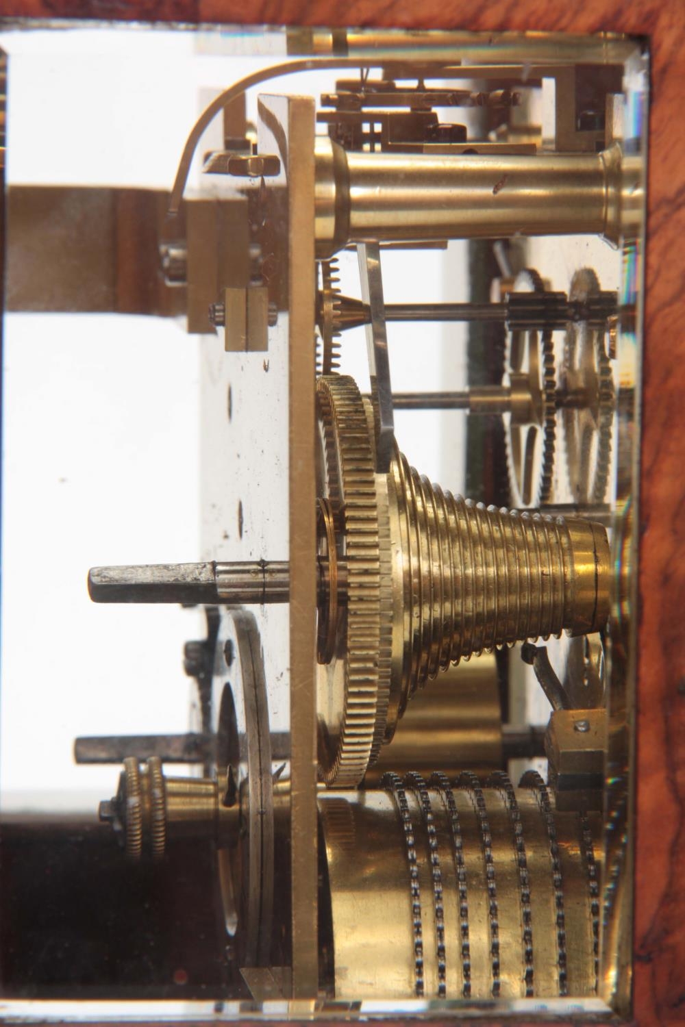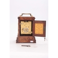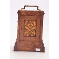 CLERKE, LONDON A SMALL 19TH CENTURY BURR WALNUT CARRIAGE STYLE FUSEE MANTEL CLOCK WITH ALARM the case surmounted by a brass hinged handle above a bevelled glass panel with matching panels to the side, the front with locking cast brass bezel enclosing a 3.5" silvered engraved circular dial with Roman numerals fronting an eight-day chain driven fusee movement with Harrison maintaining power and large balance wheel lever escapement; the spring-driven alarm mechanism striking a bell mounted in the base 24cm high