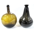 An XVIII Century Green Glass Wine Bottle, of onion form, 33cm high; Another, of compressed globular form, 32cm high. (2)