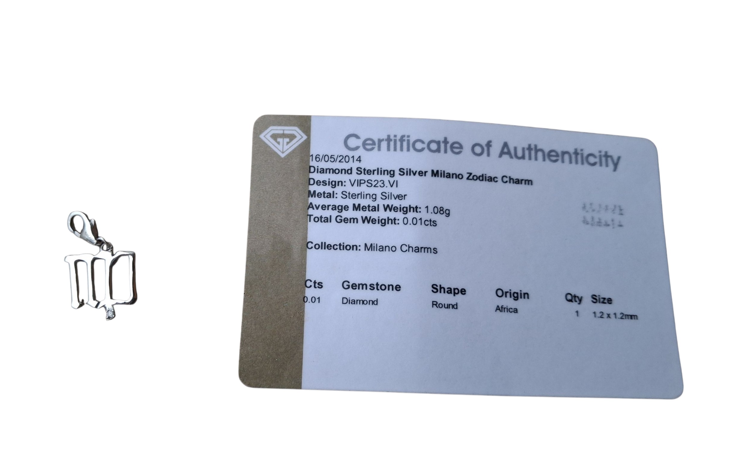 A DIAMOND AND STERLING SILVER MILANO ZODIAC "VIRGO" CHARM AND CERTIFICATE