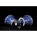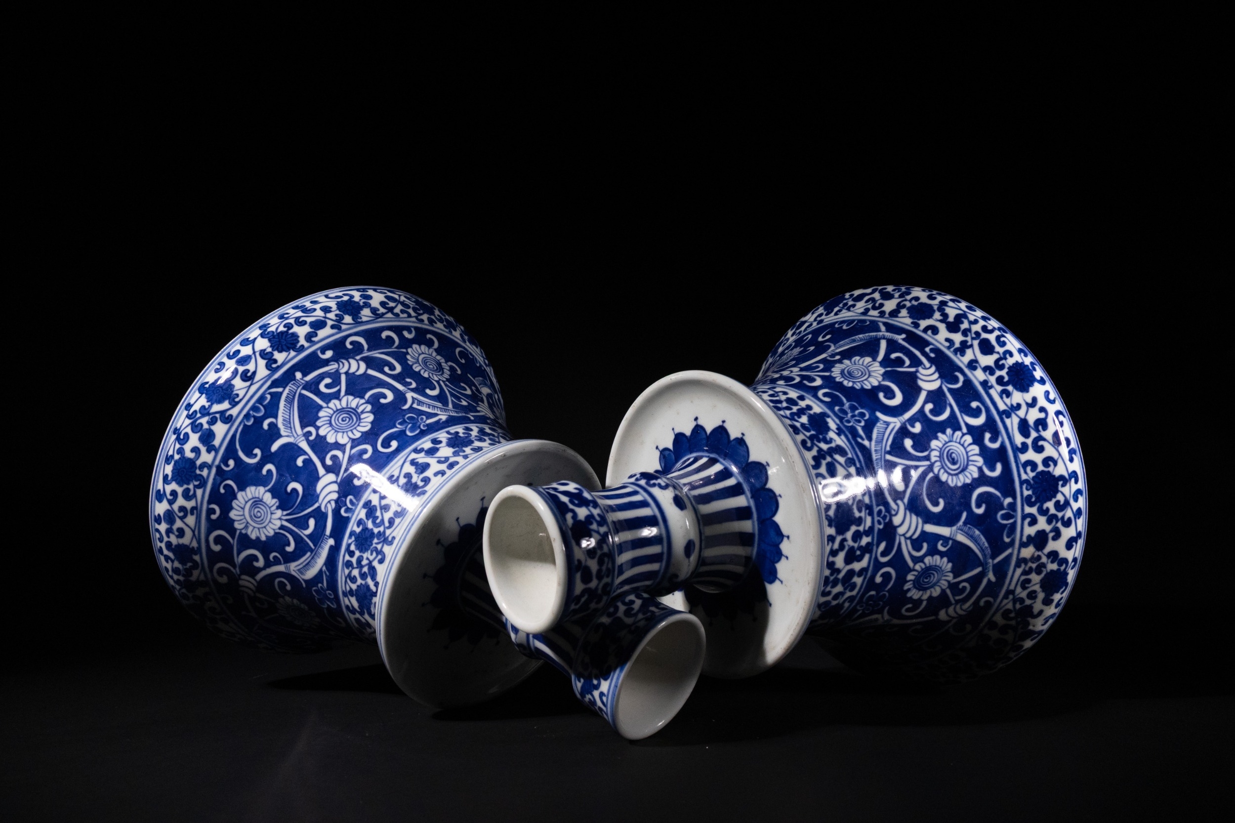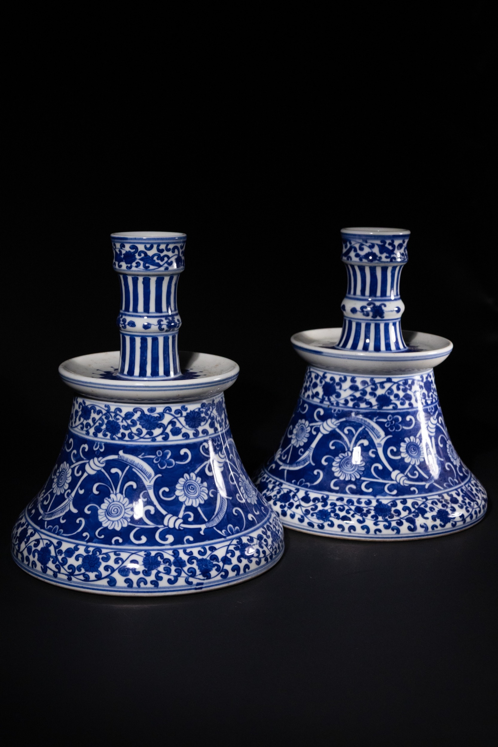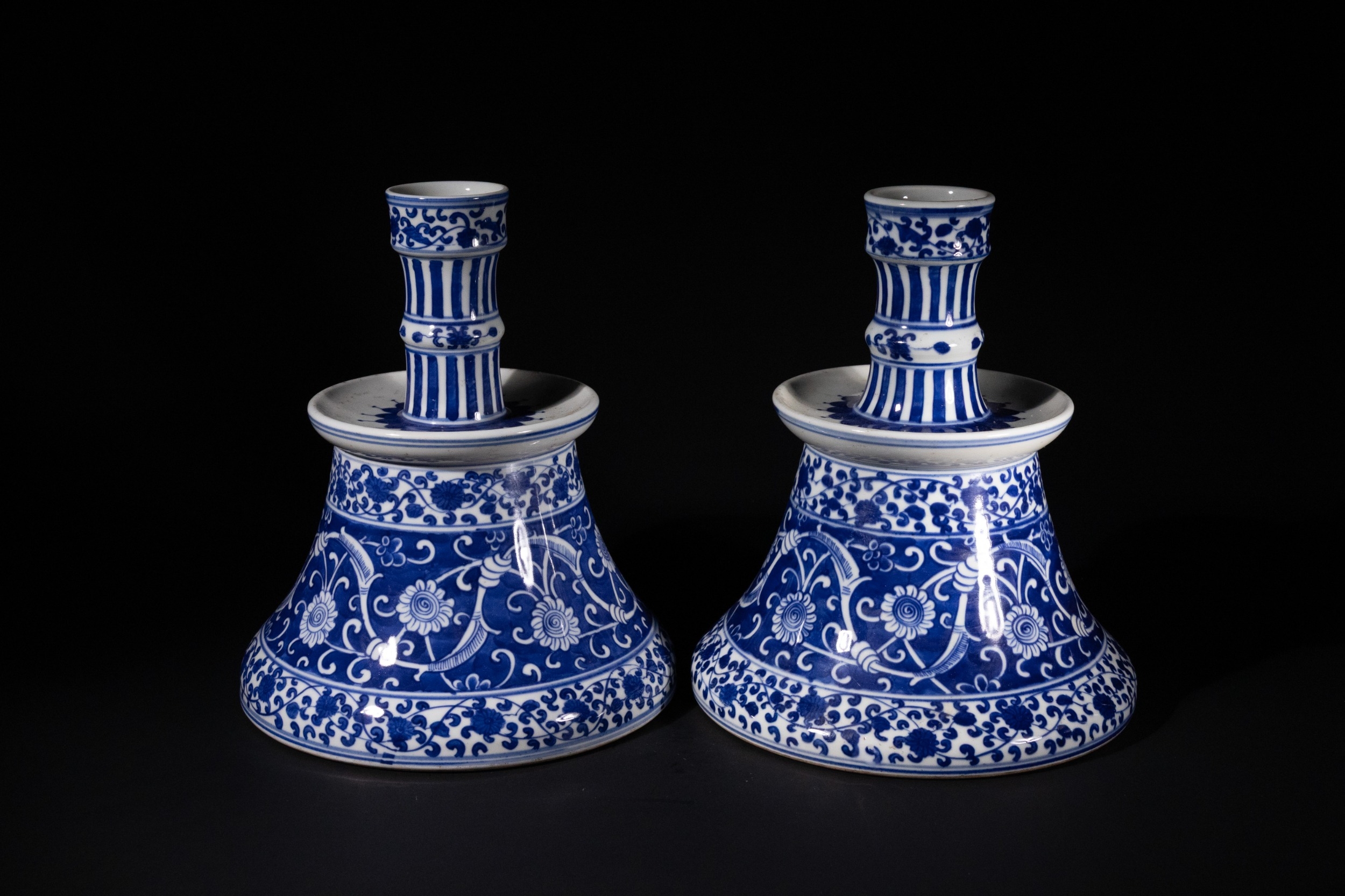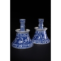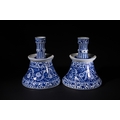 A Pair of Iznik Style Blue and White Porcelain Candlesticks - A pair of Iznik Style blue and white porcelain candlesticks, each composed of a wide, bell-shaped base supporting a slender, tiered stem. They are extensively decorated with underglaze blue floral and scrolling foliate motifs, including stylized flowers and vines, complemented by patterned bands of vertical stripes and smaller floral borders on the stems and rims.