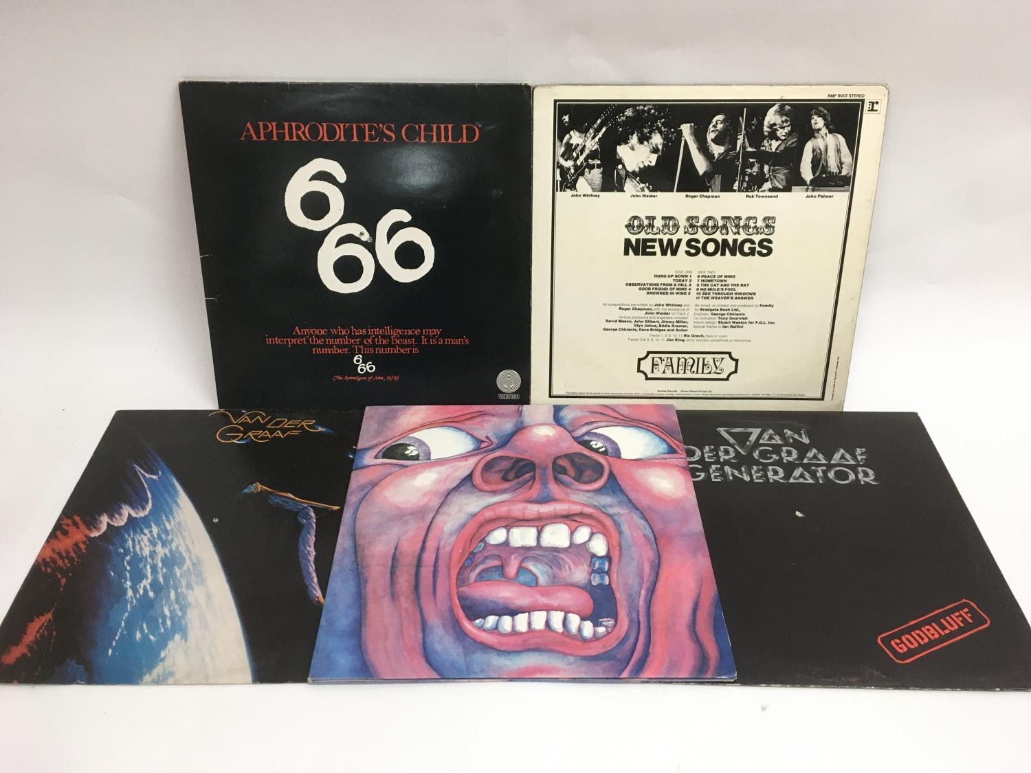 Five prog rock LPs by various artists including King Crimson, Van Der Fraaf Generator, Aphrodite's Child and Family.