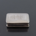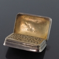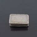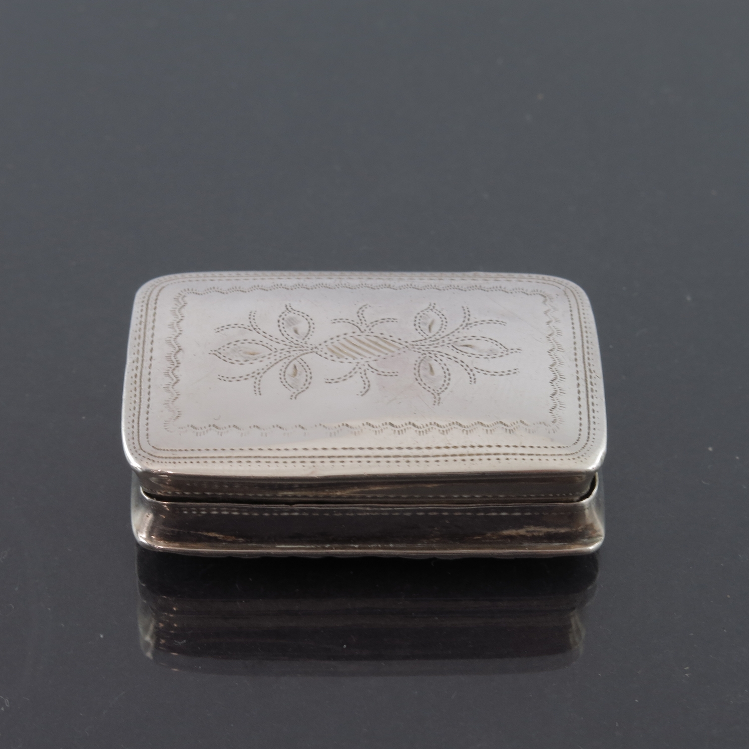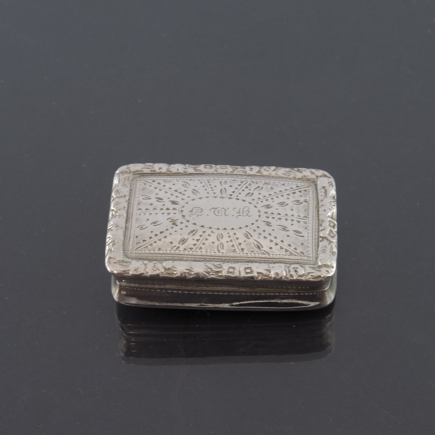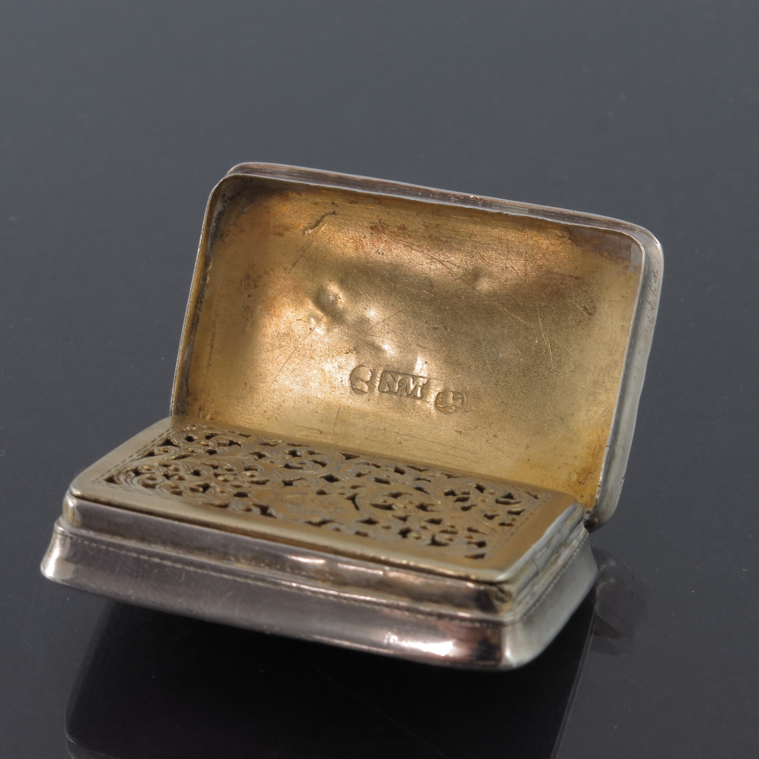 A George IV silver vinaigrette, Nathaniel Mills, Birmingham 1828, cushioned form, cast floral and foliate border, bright cut engraved with radiating husk garlands, the reverse with stylised floral design, pierced foliate scroll grille, 4.2cm x 2.8cm, 0.71ozt