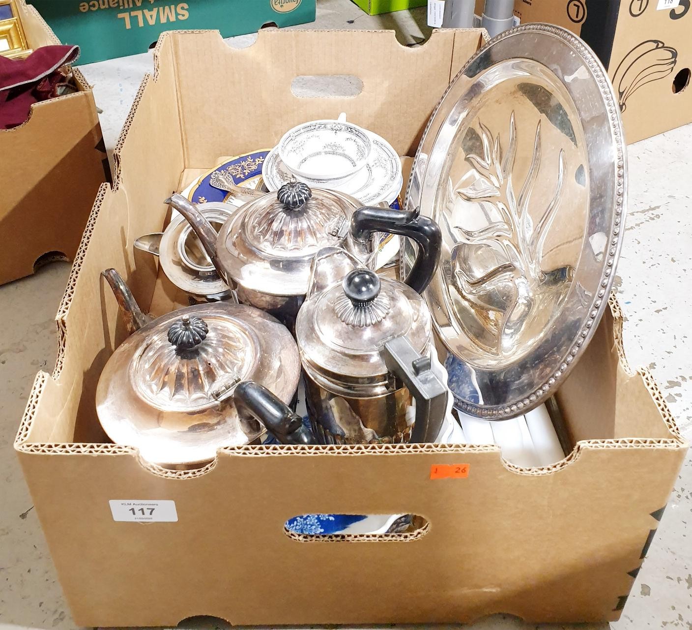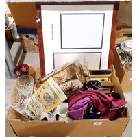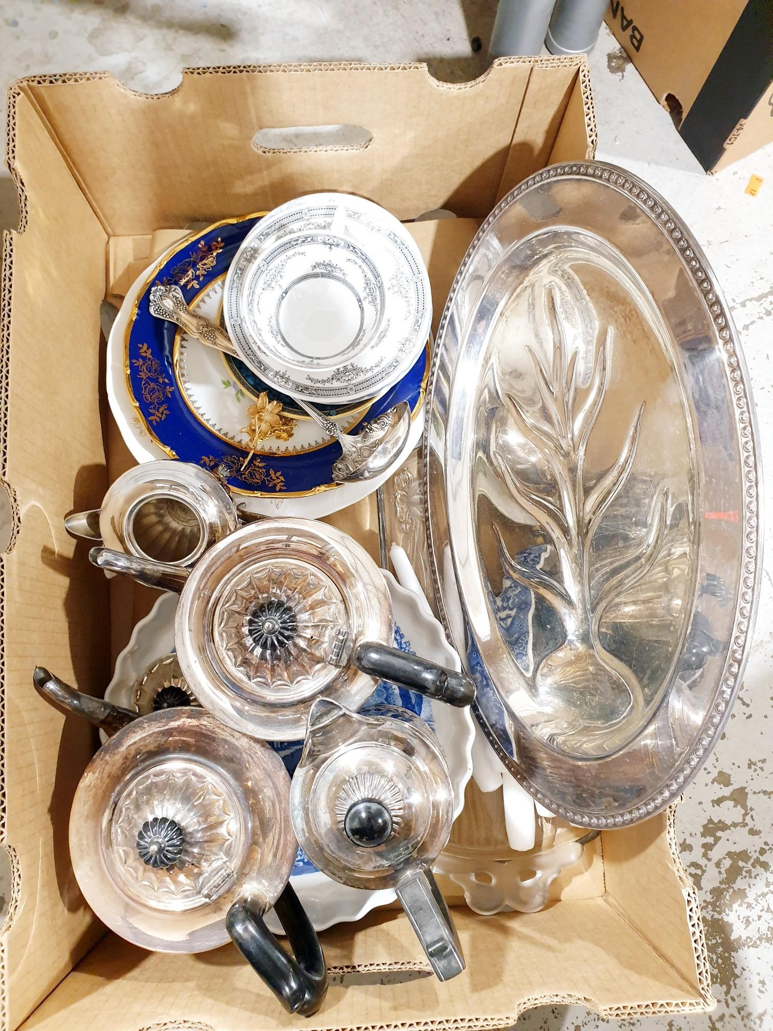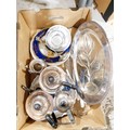 A box of metal ware and china. No shipping. Arrange collection or your own packer and shipper, please. Electricals are sold as scrap.