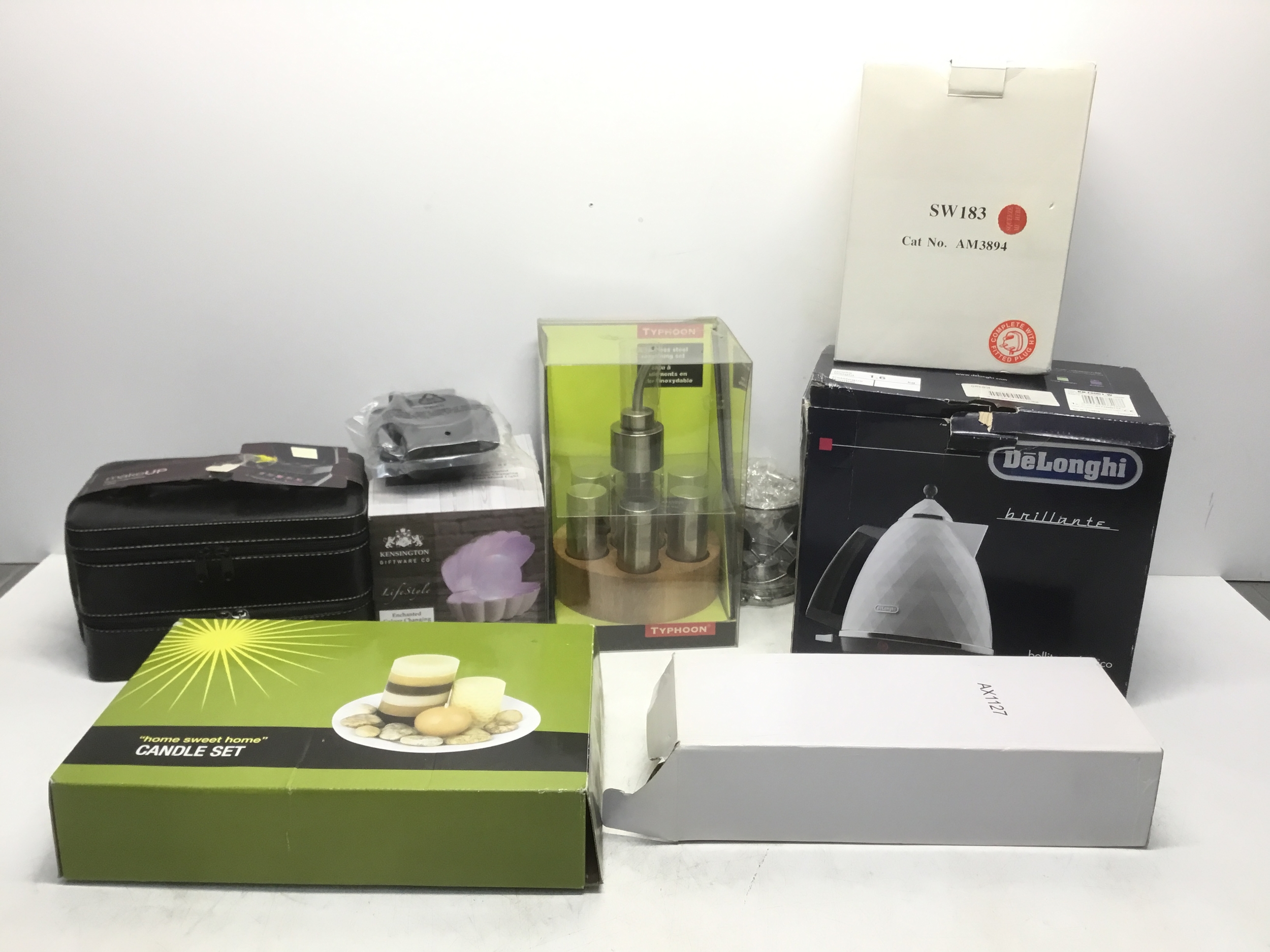 Mixed items including DeLonghi kettle, candle set and stainless steel seasoning set