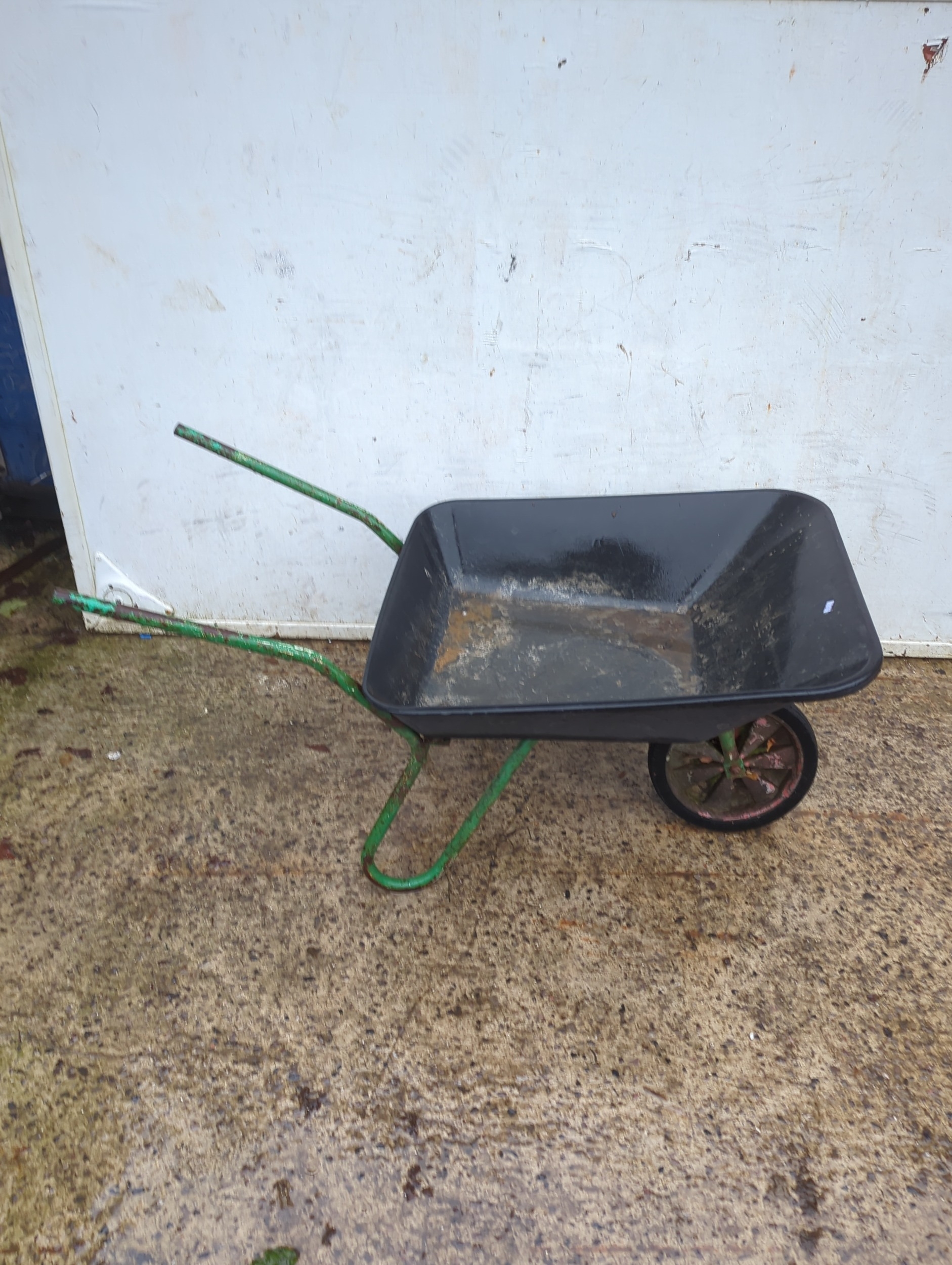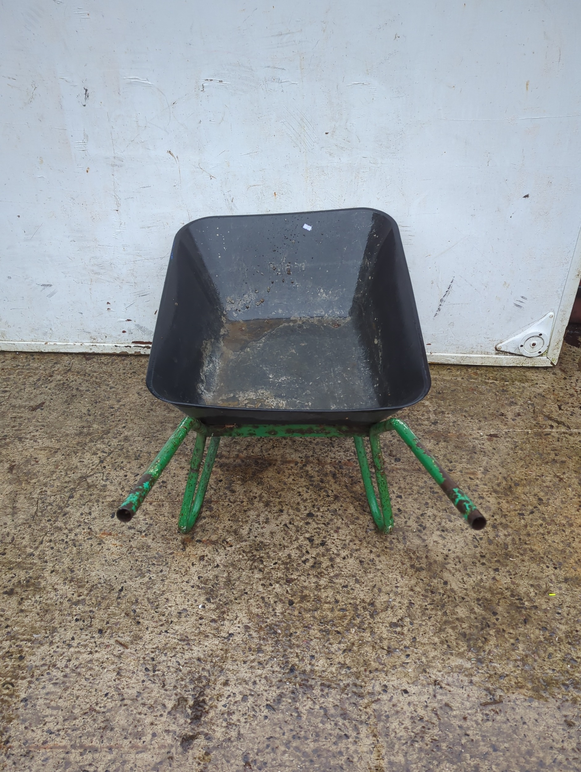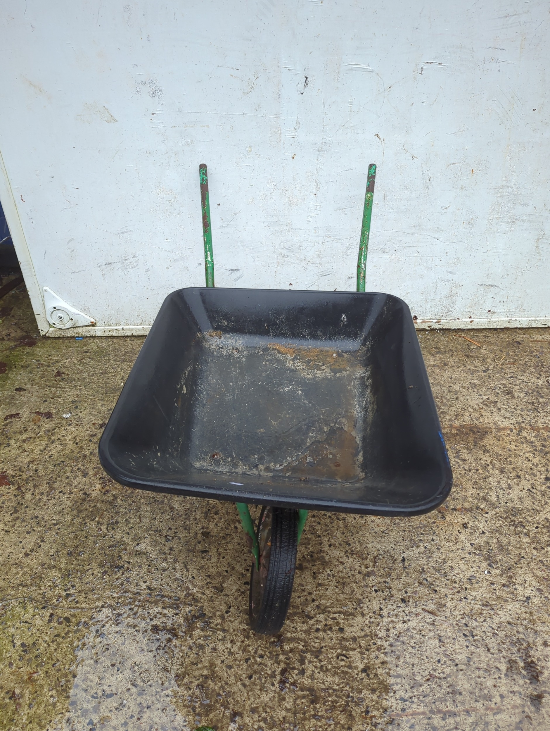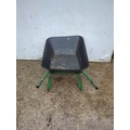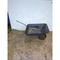 The Pulang wheelbarrow features a green metal frame and black tray, suitable for various outdoor tasks. It is designed with a single wheel and two handles for easy manoeuvrability. The sturdy construction is ideal for transporting gardening materials or construction loads efficiently.