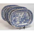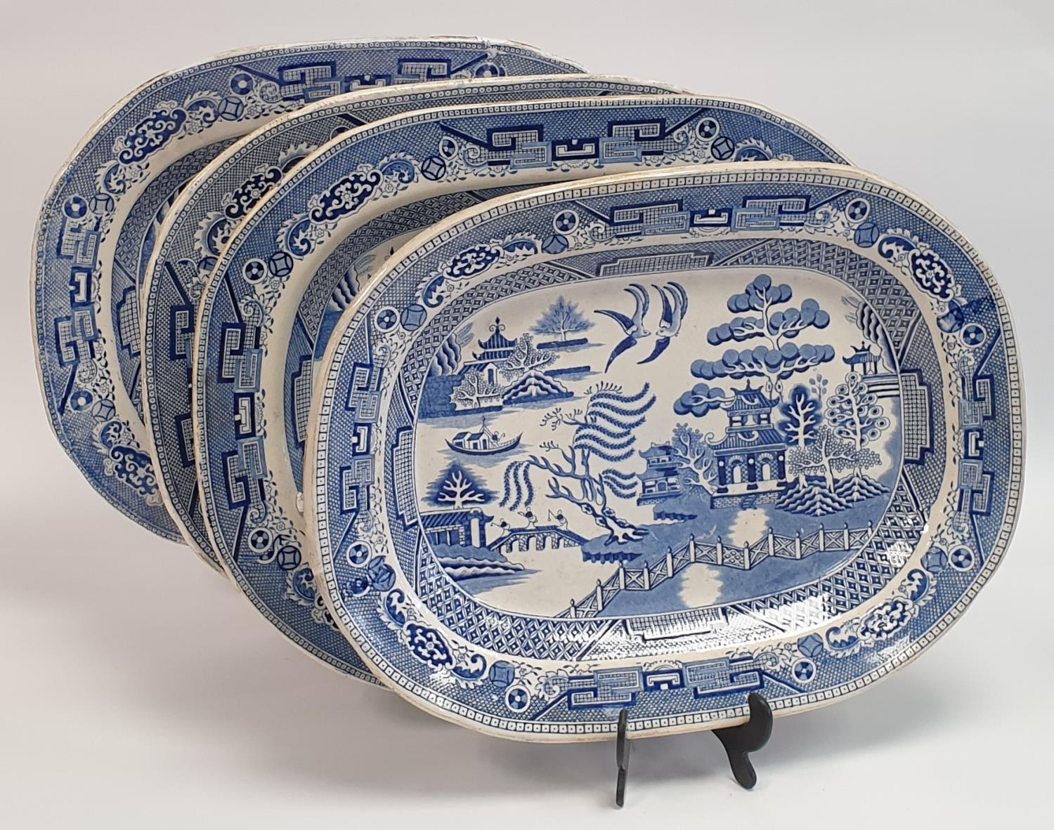 Four Willow Pattern Meat Plates, Largest 36 x 46cm