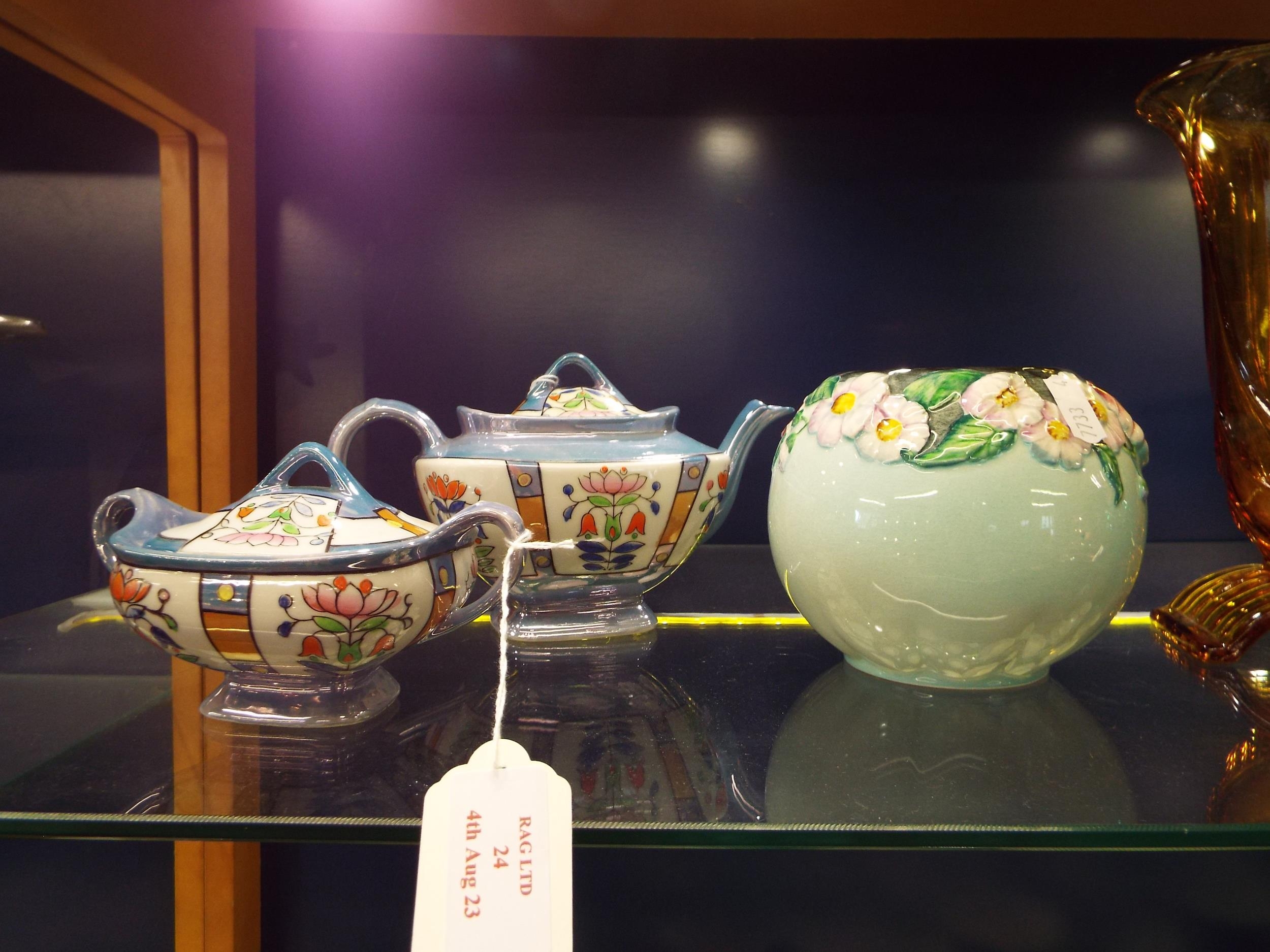 A Carlton-ware Australian vase with floral decoration and a Japanese tea-pot and sugar bowl